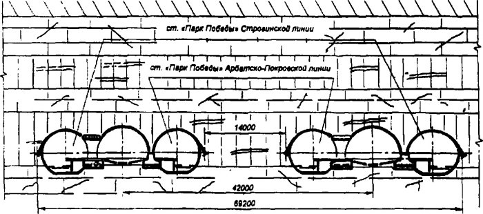 На рис. 6.30 [31] приведены поперечные сечения по параллельно расположенным станциям «Парк Победы» Арбатско-Покровской и Строгинской линий Московского метрополитена. Пересадочный узел «Парка Победы» находится под Кутузовским проспектом и состоит из двух станций колонно-пилонно-го типа, рассчитанных на прием 10-вагонных составов. Длина посадочных платформ станций 200 м. В перспективе в этом узле предусмотрено сооружение третьей станции.