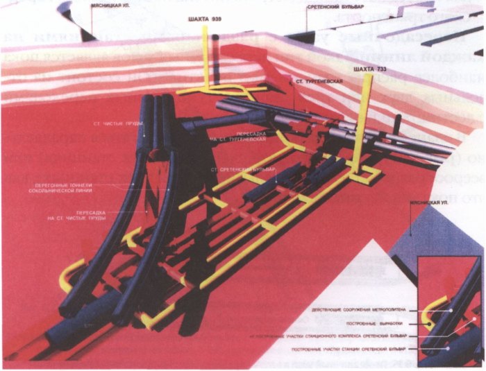 Эта задача еще более усложняется, когда с развитием сети метрополитена появляется необходимость организации пересадки пассажиров на три линии и более, сходящихся в одном узле, и пересадку на другие виды транспорта: железнодорожный, городской и др. Каждый пересадочный узел по размерам занимаемой площади в грунтовом массиве представляет собой большое подземное сооружение, зачастую расположенное в разнородных грунтах. На рис. 6.24 представлено расположение в подземном пространстве пересадочного узла со станциями «Чистые пруды», «Тургеневская» и «Сретенский бульвар».