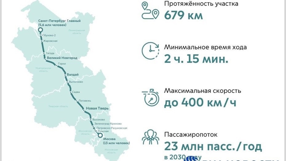 ВСМ Москва — Санкт-Петербург пройдет по территории 6-ти субъектов Российской Федерации — городов федерального значения Москва и Санкт-Петербург, Ленинградской, Новгородской, Тверской и Московской областей.