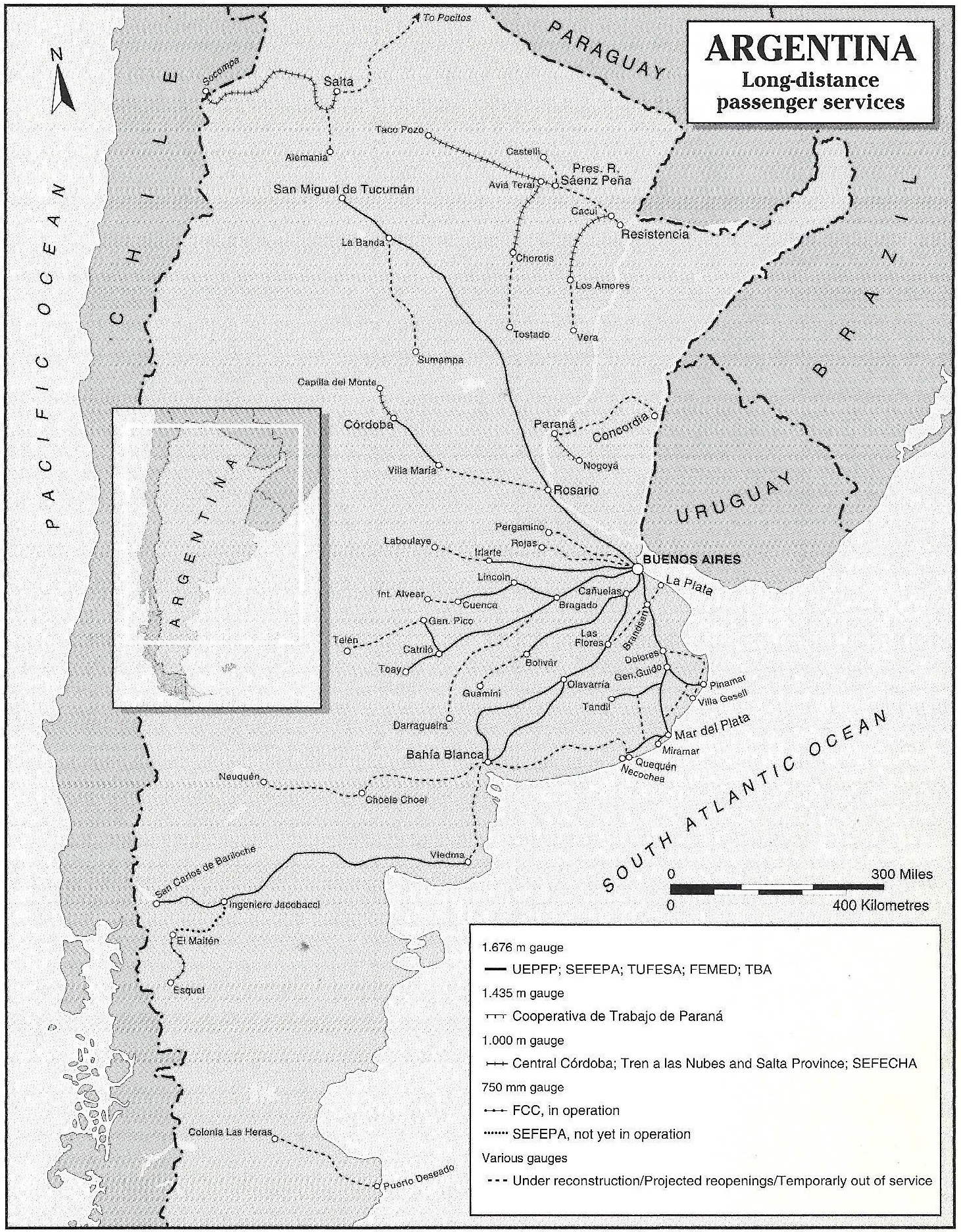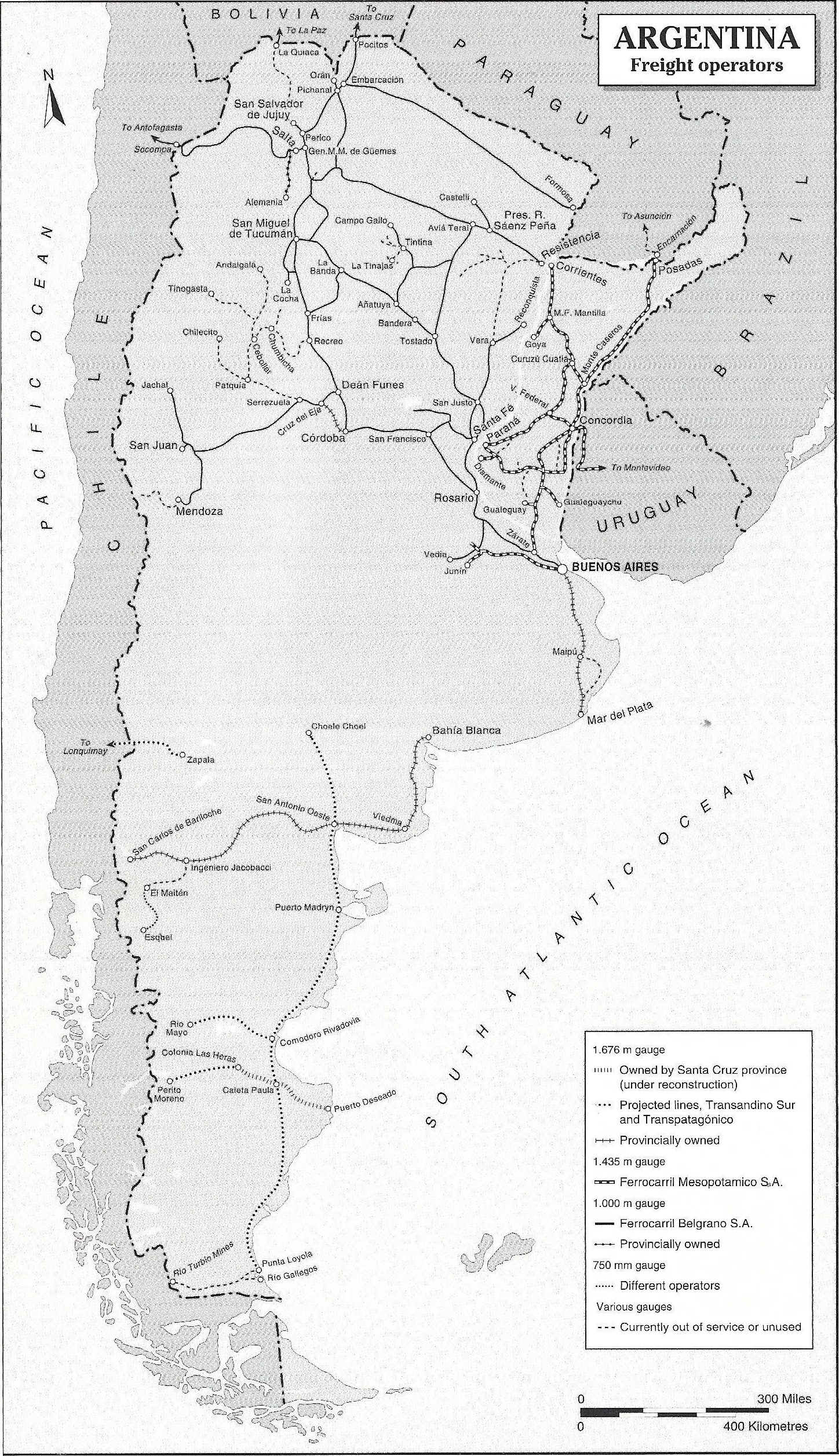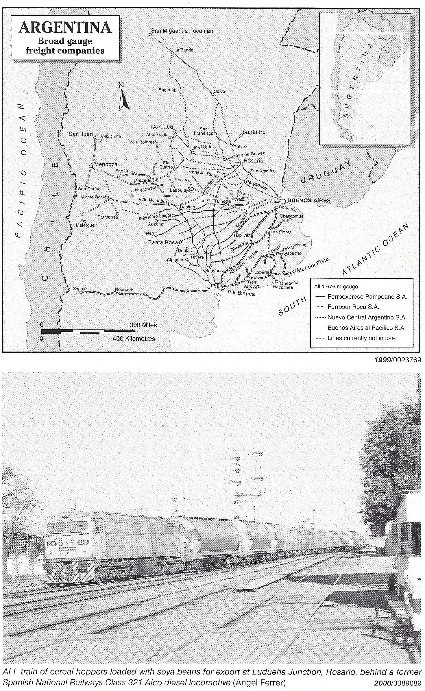Ministry of InfrastructureSecretariat of Transport Hipolito Irigoyen 200, Piso 12, Oficina 1209, C1086 AAB, Buenos Aires Tel: (+54 11)43 81 89 11 Fax: (+54 11)48 14 18 23 Key personnel Minister: Nicolas.Gallo Secretary: Jorge Kogan Under-Secretary: Alba Thomas Hatti [топ]Comision Nacional de Regulacion de Transporte (CNRT)Avenida Maipu 88 - piso 5°, 1084 Buenos Aires Tel: (+54 11)43 18 35 48 Fax: (+54 11)43 18 36 62 Key personnel President: Jose Emilio Bernasconi Formerly the Unidad de Coordinacion del Programs de Reestructuracion Ferroviaria, and incorporating functions of the former Ferrocarriles Metropolitanos, this organisation now oversees all concessions for interurban and suburban passenger and freight networks in Argentina. With the transfer in December 1998 of Ferrocarril Belgrano Cargas to the private sector, all of the former Argentine Railways network, which totalled nearly 34,000 km before the start of privatisation, passed out of central government ownership. The number of passengers using metropolitan rail services grew from 212 million in 1993 to 456.1 million in 1997, while the figure for interurban passengers declined from 11 million in 1990 to just 2.6 million in 1997. Freight tonnage, which in 1993 stood at 9.5 million tonnes, doubled to 18.9 million tonnes in 1997. Tonne-km increased from 5 billion to 9.8 billion in the same period. America Latina Logfstica (ALL Central)Avenida Santa Fe 4636 - piso 3°, C1425BHV Buenos Aires Tel: (+54 11) 47 78 24 00 Fax: (+54 11) 47 78 24 08 Key personnel President: Alexandre Behring Operations Manager: Ruben Chaparro Gauge: 1,676 mm Route length: 5,350 km ![]() [топ]OrganisationOn 5 June 1992 the Consorcio Ferrocarril Central group was awarded the 30 year concession to operate 5,400 km of the General San Martin railway and 706 km of the Sarmiento railway (both 1,676 mm gauge). This network, which became the Buenos Aires al Pacifico/San Martin (BAP) system, was the third freight concession to be granted, and was considered to be potentially very profitable. The CFC consortium was headed by Industries Metalurgicas Pescarmona (IMPSA), which held a 60 per cent stake and whose main manufacturing plant in Mendoza is connected to BAP lines. IMPSA was also the main partner in the CFM consortium later awarded the Urquiza concession. Other members of CFC were Roman Maritima (25 per cent), Transapelt and Hugo G Bunge. Railroad Development Corporation (which controls the Iowa Interstate Railroad between Chicago and Omaha, USA) was chosen as operator, with Conrail as technical consultant. In 1997 BAP unified operations with Ferrocarril Mesopotamico General Urquiza (qv), where there are overlapping shareholding interests. In August 1998 the IMPSA-led consortium announced its intention to sell its share in BAP, along with its interests in the Ferrocarril Mesopotamico General Urquiza (qv), to a Brazilian consortium, America Latina Logistica, which operates that country’s Ferrocarril Centro-Atlantico and Ferrovia Sul-Atlantico networks. This resulted in the adoption of a new name for the system, ALL Central. Investments of US$300 million are planned and in the longer term it is intended to increase tonnage by 50 per cent. [топ]Freight operationsOperations as the Buenos Aires al Pacifico commenced on 26 August 1993, several months later than planned due to problems with the transfer of staff from FA. The lines covered by the concession link the provinces of Mendoza and San Juan in the Andean foothills to Buenos Aires, crossing the provinces of San Luis, Cordoba and Santa Fe in the process. In 1996 BAP began direct services to the Rio de la Plata terminal in the port of Buenos Aires following completion of a new link. The traffic base inherited from FA consisted mainly of trainload movements of petroleum, coke and stone. The new operators have made efforts to develop wagonload, intermodal (both container and piggyback) and door-to-door services and to broaden the range of commodities carried. Traffic flows, especially of containers, from Mendoza to the port of Buenos Aires have become especially significant, with trains assembled at Palmira yard, near Mendoza. The majority of BAP’s traffic is eastward to Buenos Aires and the port and industrial centre of Rosario. In 2000, diversions due to severe flooding were in force on the main line east of Rufino, in Santa Fe province, with trains to Buenos Aires taking NCA lines to Empalme Villa Constitucion and thence to the capital. Permanent way staff were working to reopen other BAP/SM branch lines adjacent to their own main line to reduce running over other operator’s tracks. At some locations, water levels rose to 2 m above the rail head. Trains are operated by a crew of two and have end-of-train telemetry devices. Traffic (million) 1998-99 Freight tonnes 3.42 Freight tonne-km 2,562 [топ]Improvements to existing linesAt the commencement of BAP operations the maximum permitted speed on the San Martin east-west main line was 120 km/h, although many branch lines were only suitable for speeds of 12 km/h. Of the US$150 million BAP intended to invest in the first five years of the 30 year concession period, US$45 million was to be spent on track improvements and a continuous-rail welding programme. An infrastructure analysis matrix has been deployed to assess the commercial desirability of infrastructure improvements and to determine those which should take priority over others. In 1997 the loss of oil traffic led to closure of the Malargue branch, although expanding cement traffic led to the reopening of the Justo Daract—San Luis branch. [топ]Traction and rolling stockIn 1997 the locomotive fleet totalled 97, including 19 shunting units. Main line traction included 20 Alco-engined Class 321 Co-Co diesel-electric locomotives acquired from Spanish National Railways (RENFE). At the start of 1997, BAP operated 5,271 freight wagons, of which 1,314 were unserviceable. Recent acquisitions inclu