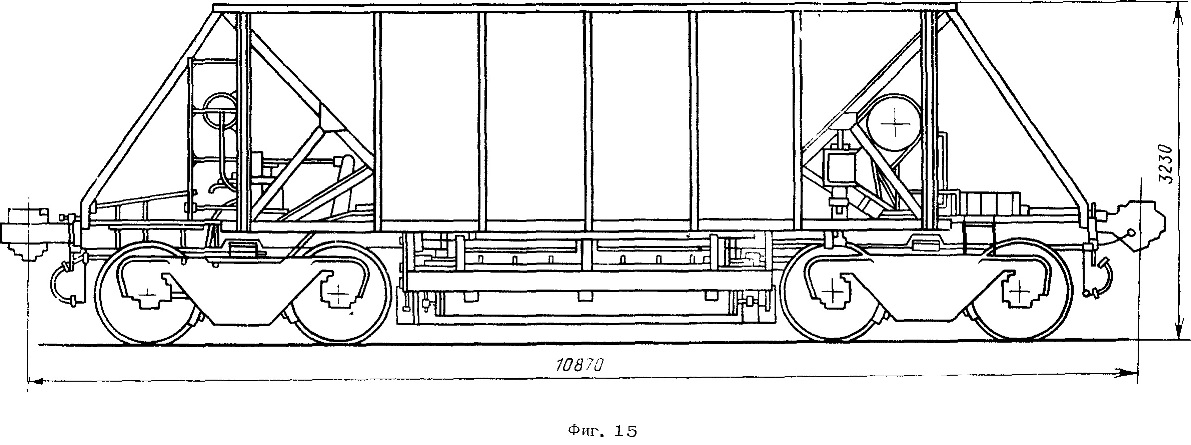 Хоппер-дозатор ЦНИИ ДВЗМ (фиг. 15) создан на базе типового четырехосного хоппера, кузов которого занижен, а разгрузочные люки заменены специальным разгрузоч-но-дозировочным устройством с пневматическим управлением, которое расположено под рамой хоппера, м'ежду тележками. Это устройство состоит из двух блоков, каждый из которых представляет собой воронкообразный бункер с разгрузочными окнами. Под бункерами размещен дозатор с механизмами его подъема и опускания, предназначенный для дозировки выгружаемого на путь балласта и его планировки.