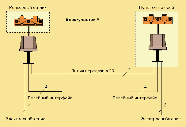 Все пункты счета на участке пути соединены друг с другом двухпроводной линией и по модемному соединению стандарта V.23 обмениваются информацией о состоянии счетчиков, командами и диагностическими данными.
