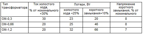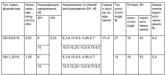 Типы и основные параметры выпускаемых трансформаторов ОМ