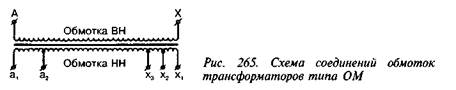 Указанные трансформаторы выпускались до 1972 года. Электрическая схема соединения обмоток трансформаторов типа ОМ приведена на рис. 265.