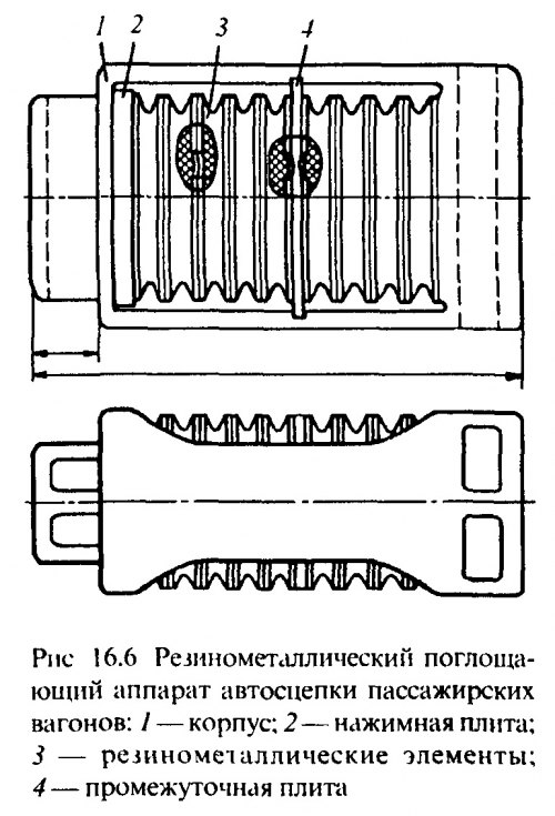 Поглощающий аппарат обеспечивает гашение удара при сцеплении вагонов и уменьшает продольные, растягивающие и сжимающие усилия, которые передаются через автосцепку на раму кузова. На грузовых вагонах используются пружинно-фрикционные аппараты (рис. 16.5), работа которых основана на превращении кинетической энергии соударяемых вагонов в работу сил трения фрикционных элементов и потенциальную энергию деформации пружин. На пассажирских вагонах устанавливаются поглощающие аппараты с резинометаллическими элементами, обеспечивающими плавность хода при соударении вагонов и бесшумность работы (рис. 16.6).