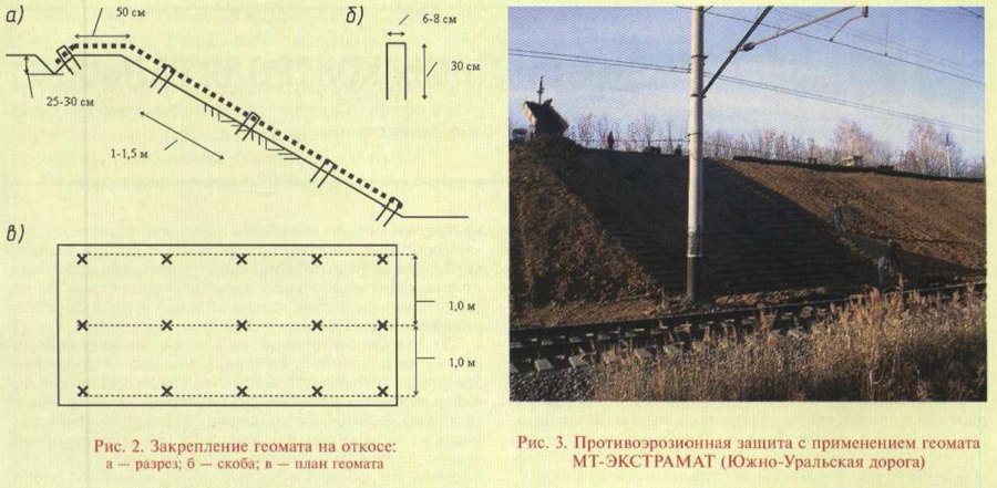 Тема: [09-2010] Армирующие геосинтетические материалы при реконструкции путиАрмирующие геосинтетические материалы при реконструкции пути В.В. МАКАРОВ В «Стратегических направлениях научно-технического развития ОАО «Российские железные дороги» на период до 2015 г.», принятых в 2007 г., определены цели, задачи и ориентиры компании, в том числе в части железнодорожной инфраструктуры. В соответствии с этим документом предполагается повышение эффективности работы ОАО «РЖД» с выходом на показатели мировых лидеров железнодорожного транспорта. Для решения поставленных задач планируется внедрять прогрессивные технологии перевозок, предусматривающие увеличение скорости движения и массы поездов. В свою очередь, существующее земляное полотно, как часть путевой инфраструктуры, требует усиления и реконструкции. Состав основных работ при реконструкции железнодорожного пути определен с учетом утвержденного 08.06.07 Временного положения о реконструкции железнодорожного пути. Согласно Положению усиление и реконструкция железнодорожного пути включает в себя усиление основной площадки, устройство участков переменной жесткости на подходах к мостам и тоннелям с безбалластным верхним строением пути, новых защитных и укрепительных сооружений земляного полотна. При выполнении перечисленных работ целесообразно использовать армирующие геосинтетические материалы — геосетки и геоматы. Крупнейшим отечественным производителем полимерных армирующих материалов и их композитов является компания «СТЕКЛОНИТ», выпускающая геосетки ПС-ПОЛИСЕТ для армирования балластного слоя и основной площадки земляного полотна, геоматы МТ-ЭКСТРАМАТ для противоэрозионной зашиты откосов земляного полотна. Геосетки ПС-ПОЛИСЕТ представляют собой полимерную сетчатую структуру, изготовленную из двух систем полимерных нитей, провязанных между собой. При их использовании происходит эффект заклинивания гранул балласта в ячейках геосетки, высокая прочность которой на растяжение в продольном и поперечном направлениях предотвращает горизонтальные перемещения балласта. Создается своеобразная плита, воспринимающая нагрузку от подвижного состава и максимально ее перераспределяющая на нижележащие слои. При усилении основной площадки армирующую прослойку из геосеток укладывают на глубину не менее 0.4 м от подошвы шпал. Ширина покрытия под один путь не менее 4,0 м. Число прослоек (как правило, не более двух) в такой конструкции (рис. 1) определяют расчетом в зависимости от характеристик грунтов земляного полотна и требований по упругой осадке (модулю подшпалъного основания). Один из способов обеспечения переменной жесткости на подходах к мостам — постепенное увеличение по направлению к устою толщины балластных материалов, заменяющих грунты верхней части насыпи. Для исключения боковых деформаций балласт целесообразно располагать между слоями геосеток. Длина переходного участка при этом должна быть не менее 25 м. Геосетки ПС-ПОЛИСЕТ укладывают в 5—6 слоев у устоя моста. Срезку грунта насыпи осуществляют во всех сечениях на расчетную глубину, обеспечивающую плавное повышение модуля упругости пути от устоя к обычному пути. Толщину единичного слоя щебня между геосетками для возможности создания требуемого уплотнения и гарантированного предотвращения боковых 