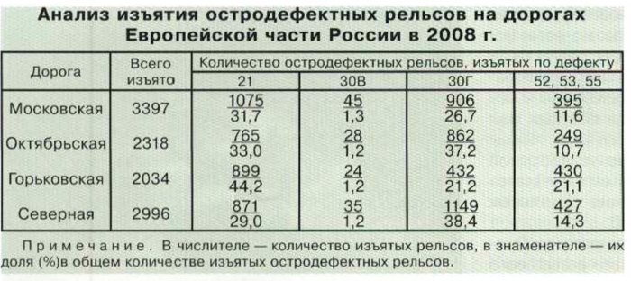 Тема: [04-2011] Анализ дефектов рельсовАнализ дефектов рельсов В.А. РЕЙХАРТ Узнать больше можно, только меняя свою позицию. Жак Валле Жак Валле — франко-американский ученый широкого профиля: астроном, астрофизик, математик — программист, бизнесмен (венчурные операции), уфолог, а также писатель-фантаст. Обширная деятельность Ж. Валле позволила ему сформулировать свое научное кредо — «Узнать больше можно...», приведенное, как эпиграф настоящей публикации. В журнале «Железнодорожный транспорт» № 10 за 2010 г. опубликована статья «Анализ дефектов рельсов» П.С. Иванова и др. По мнению авторов, «условия зарождения и развития большинства дефектов в головке рельсов связано с ударным воздействием колесных пар подвижного состава с рабочей гранью головки рельсов при вилянии подвижного состава в колее». Рекомендовано «резко повысить качество новой рельсошпальной решетки». В ОАО «ВНИИЖТ» за много лет накоплен большой фактический материал по исследованию природы возникновения и механизмам развития различных дефектов. Попробуем посмотреть на эту проблему с позиции Ж. Валле, отличной от той, которой придерживаются авторы выше указанной публикации. Статистический анализ отказов термоупрочненных рельсов типа Р65 на главных путях с звеньевой и бесстыковой конструкцией позволяет дать объективную и достаточно достоверную оценку состояния наиболее загруженных линий по эксплутационной стойкости и надежности работы рельсов на них. При этом могут быть получены показатели одиночного изъятия, в том числе по отдельным дефектам или по совокупностям дефектов, удельные отказы после различной наработки (250, 500 и 750 млн т груза брутто), а также сроки службы и средний тоннаж одиночных изъятий рельсов в отдельные периоды эксплуатации. Это дает возможность изучить тенденции развития путевого хозяйства страны, оценивать технологические мероприятия по улучшению качества рельсов на металлургических комбинатах. Статистическому анализу подвергают данные формы ПУ-4 по отказам рельсов, которые поступают от служб пути дорог. Один из главных параметров формы ПУ-4 — разновидность (код) дефектов, которые определяют в соответствии с действующей в настоящее время «Классификацией дефектов рельсов НТД/ЦП-1-93». Основными причинами зарождения дефектов могут выступать различные факторы, в той или иной степени влияющие на этот процесс. К ним можно отнести качество рельсов (металлургическое, геометрическое, отделка), условия эксплуатации (грузонапряженность, план и профиль пути, режимы вождения поездов), климат и т.д. В какой-то мере влияние может оказывать и качество рельсошпальной решетки. Как правило возникновение и развитие дефектов связано с совместным действием нескольких факторов, что иногда затрудняет в каждом конкретном случае выявление основной (решающей) причины появления дефектов. На Экспериментальном кольце ВНИИЖТа, где большинство из перечисленных параметров постоянны (вагонная осевая нагрузка, масса и скорость движения поезда, суточная наработка, качество рельсошпальной решетки и т.д.) имеется возможность оценить роль некоторых переменных факторов в зарождении и развитии дефектов в рельсах. В первую очередь таковым является металлургическое качество рельсов и, прежде всего, его главный параметр — загрязненность стали неметаллическими включен