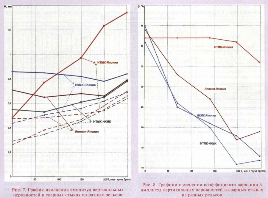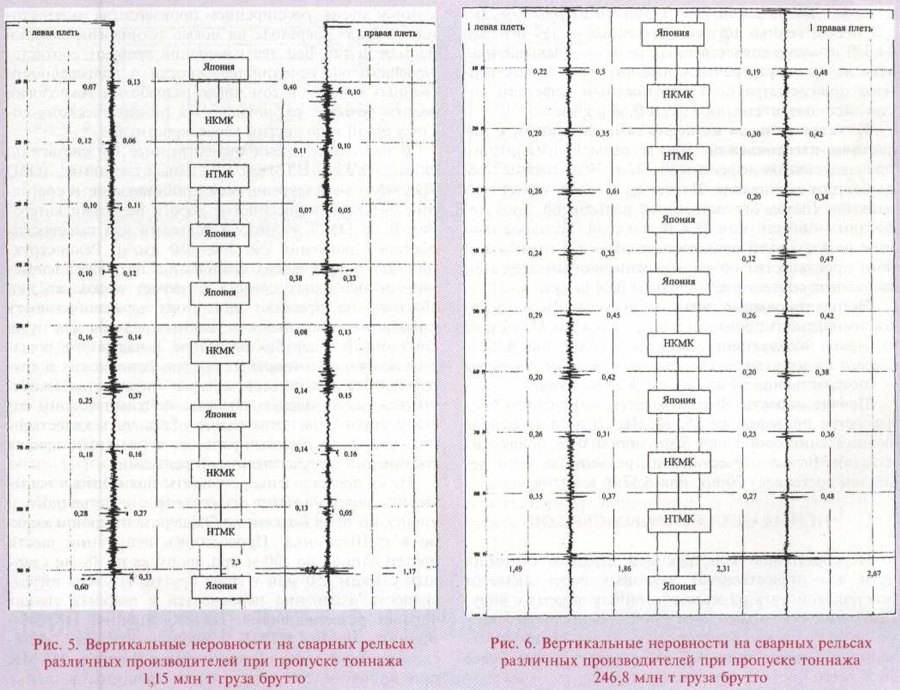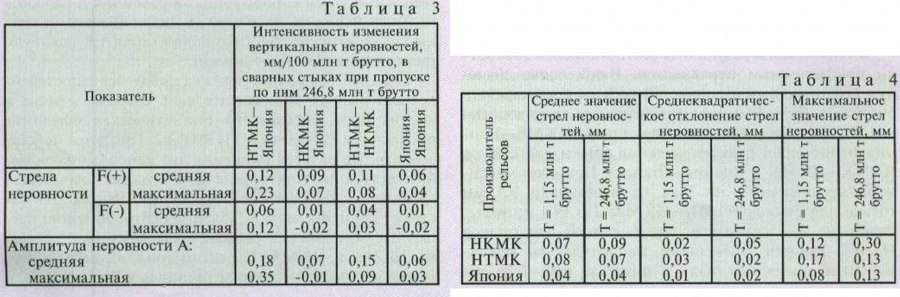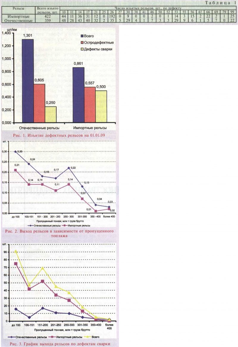 Тема: [06-2010] Рельсы отечественных и иностранных предприятийРельсы отечественных и иностранных предприятий Е.В. ОКЛАДНИКОВ Российские железные дороги остро нуждаются в повышении качества рельсов. Возрождение отечественной промышленности невозможно без увеличения осевых нагрузок, скоростей движения грузовых и пассажирских поездов. Рельсы — один из главных элементов пути — не должны быть препятствием для этих процессов. Пока же рельсы отечественного производства после пропуска 300 — 700 млн т груза приходится изымать из пути вследствие большого выхода по различным дефектам или чрезмерного износа. В то время как они должны обеспечивать пропуск 700 — 1500 млн т груза в самых тяжелых условиях эксплуатации. Российские железнодорожники не понаслышке знают о том. что такие рельсы можно изготовить. Во второй половине 90-х годов прошлого века МПС России закупило в Японии более 60 тыс. т рельсов типа Р65, которые заметно превосходили рельсы отечественных производителей — Кузнецкого и Нижнетагильского металлургических комбинатов — по геометрическим параметрам качества за счет меньших отклонений от прямолинейности концов и на всей их длине, по точности изготовления профиля и чистоте стали за счет меньшего содержания кислорода и неметаллических включений. К тому времени уже были известны результаты полигонных испытаний на Экспериментальном кольце ВНИИЖТа японских и французских рельсов, которые, пропустив I млрд т*км брутто, в два раза превосходили по эксплуатационной стойкости отечественные. Закупленные рельсы были уложены в основном на Октябрьской дороге между Москвой и Санкт-Петербургом, где организовывалось совмещенное движение со скоростью пассажирских поездов до 200 км/ч. Цель данной статьи состоит в определении эффективности применения импортных рельсов по сравнению с отечественными на Октябрьской, Забайкальской, Дальневосточной дорогах, сферы первоочередного применения, развития отечественных производителей в области выпуска высококачественных рельсов, а также установить порядок обоснования увеличения цен в зависимости от качественных характеристик рельсов. АНАЛИЗ РАБОТЫ РЕЛЬСОВ НA МАГИСТРАЛИ САНКТ-ПЕТЕРБУРГ-МОСКВА На направлении Санкт-Петербург — Москва по состоянию на 01.01.09 лежало в пути 490,113 км рельсов типа Р65 импортного производства. Рельсы укладывали в 1997 — 2001 и 2008 гг. при усиленном капитальном ремонте, в период с 2002 по 2007 гг. укладка импортных рельсов не производилась. Одновременно с ними на этих же направлениях уложено 276,016 км термоупроченных рельсов Т1 типа Р65 отечественного производства. Изъятие рельсов по дефектам. За период эксплуатации с 1997 г. по 01.01.09 из рассматриваемого количества было изъято по дефектности в одиночном порядке 422 рельсов импортного производства и 359 отечественного. В табл. I приведены данные об изъятии рельсов по дефектам. По данным табл. 1, изъято остродефектных рельсов (далее ОДР) соответственно 273 и 167 шт. Таким образом, у импортных ОДР составляют 64,7 % от изъятых, а у отечественных — 46,5 %. Наибольший выход рельсов импортного производства произошел по дефектам сварки — 245 шт., что составляет 58,1 % общего изъятия импортных рельсов, выход рельсов отечественного производства — 69 шт., соответственно 19,2 % общего изъятия отечественных рельсов. Удельное изъятие импортных и отечественных рельс