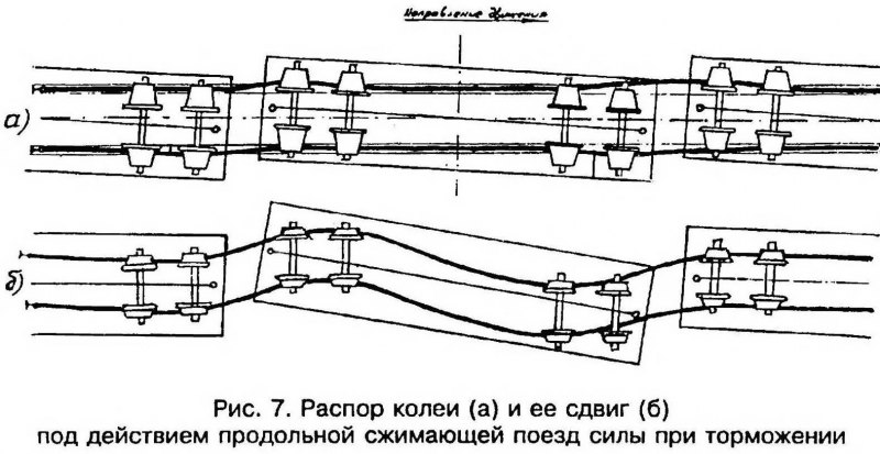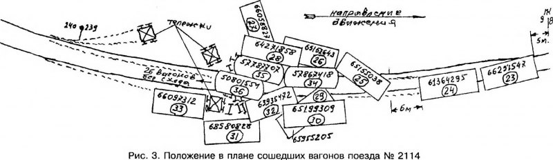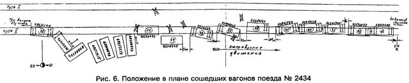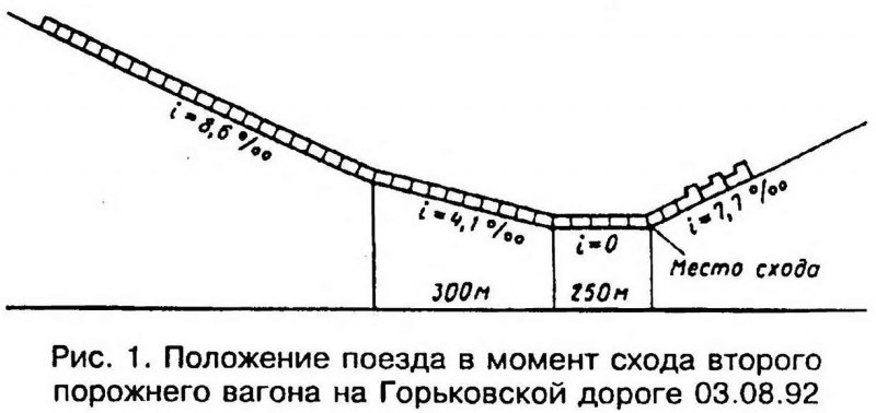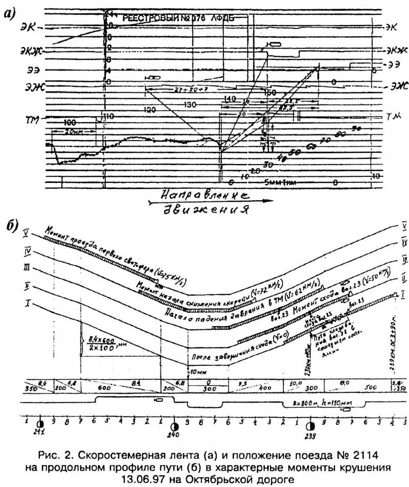 Тема: [08-1999] Расследование причин схода колес с рельсов[08-1999] Расследование причин схода колес с рельсов (Продолжение. Начало см. в № 1 за 1999 г.) Графическое оформление Опыт многочисленных экспертиз материалов уголовных дел, возбужденных по фактам крушений и аварий поездов, свидетельствует, что правильное и своевременное — в течение первого дня после происшествия — графическое оформление положения поезда на продольном профиле в характерные моменты перед сходом колес с рельсов и после завершения схода, а также положения в плане сошедших экипажей имеет большое значение для объективной оценки причин случившегося. Обусловлено это тем, что именно в первый день тройка — НОД, УРБ и транспортный прокурор — составляют адресную телеграмму об обстоятельствах происшествия. На следующий (второй) день уже завершается составление теми же лицами официального акта служебного расследования РБУ-1. Поэтому представление путейцами дополнительных (в том числе графических) материалов после отправки адресной телеграммы, т.е. на второй день после происшествия, редко приводит к изменению изложенных в ней выводов. Представлять же такие материалы в более поздние сроки бесполезно. К сожалению, чаще всего упомянутое графическое изображение или вообще не делается, или делается так, что не указываются места расположения светофоров, не анализируется связь показаний локомотивной сигнализации с местом нахождения локомотива на продольном профиле, положение в плане сошедших с рельсов экипажей отмечается небрежно, без обозначения важнейших признаков для определения причин схода. Места сходов Вот что показала техническая экспертиза 35-и уголовных дел. Сходили с рельсов вагоны в средней или хвостовой части поезда в момент, когда головная его часть после затяжного спуска находилась уже на подъеме или в кривой, где увеличивается сопротивление движению (рис. 1). Во всех случаях после завершения схода локомотив и несколько головных вагонов оставались на рельсах. ![]() Характерный пример. В конце затяжного спуска при скорости 66 км/ч на перегоне Ошпер— Петрунь Северной дороги 09.06.93 произошло крушение грузового поезда № 2830, состоявшего из локомотива 2ТЭ10В и 57-и четырехосных грузовых вагонов, в том числе 55-и порожних и двух груженых (от локомотива 40-й и 56-й). Когда локомотив и головная часть поезда въехали на подъем 9,7 ‰ и в кривую радиусом 500 м, сошла с рельсов первая тележка восьмого с головы порожнего вагона вправо по ходу (вторая тележка не сошла). У девятого порожнего вагона сошла тоже первая тележка, но влево по ходу. Эти два вагона не оторвались от головной части поезда, а вместе с ней продолжали двигаться, пока локомотив не остановился. Следующие два порожних вагона оторвались от головной части, причем у десятого сошла с рельсов первая по ходу тележка влево, а у 11-го все колеса находились на рельсах. У 12-го порожнего вагона сошла задняя тележка вправо по ходу, а у 13-го задняя тележка влево по ходу. Последующие 21 порожний вагон сошли с рельсов и образовали завал. Остальная (хвостовая) часть поезда (23 вагона) осталась на рельсах. Такое расположение сходов — влево, вправо, после трех первых сошедших (восьмой, девятый и десятый), 11-й остался на рельсах и т.д. — характерно для случаев одновременного выжимания порожних вагонов в нескольких местах средней части поезда, гд
