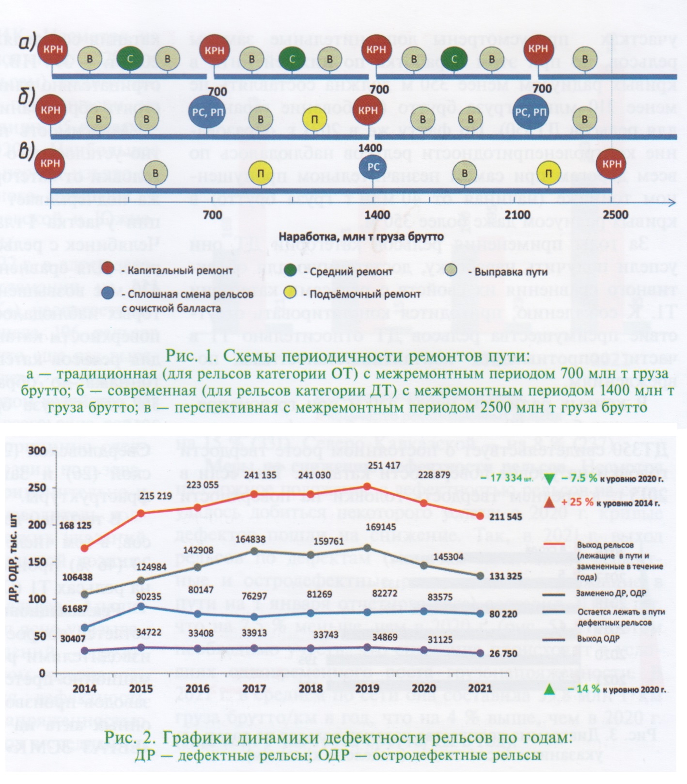 ному классу пути. В связи с освоением отечественной промышленностью выпуска инновационных рельсов категории ДТ (дифференцированно термоупрочненных), изменились ремонтные схемы. Если с рельсами ОТ (Т1) межремонтный период верхнего строения пути равнялся 700 млн т пропущенного груза брутто (ресурс рельсов ОТ), то с 2015 г. он увеличился вдвое, поскольку рельсы ДТ позволяют повысить наработку до 1400 млн т. Перспективная схема допускает увеличение срока между капитальными ремонтами до 2500 млн т при условии сплошной замены рельсов категории ДТ с очисткой балласта после пропуска 1400 млн т (рис. 1). За период деятельности ОАО «РЖД» наибольший годовой объем капитальных ремонтов составил 7,4 тыс. км в 2012 г. До 2015 г. наблюдался рост протяженности участков пути с просроченным капитальным ремонтом (максимум составил 25,2 тыс. км), что объясняется сокращением объемов работ в 2014— 2015 гг. Начиная с 2015 г. удалось остановить прирост просроченных километров пути даже в условиях продолжающегося увеличения объемов перевозки грузов. С 2014 г. при всех видах ремонтов пути укладываются рельсы только категории ДТ. Поскольку грузонапряженные линии ремонтировались в первую очередь, к 2019 г. удалось добиться превосходства протяжения путей с рельсами ДТ над ОТ (объемно закаленными) для участков с грузонапряженностью более 50 млн т-км груза брутто/км в год. По состоянию на 01.01.2022 протяжение рельсов ДТ на указанных путях составило 20,5 тыс. км, ОТ — 10 тыс. км. Дефектность рельсов. Очень непростая ситуация складывается в путевом хозяйстве с дефектностью рельсов. Хотя в последние годы удалось добиться некоторого снижения выхода рель сов по дефектам, обстановка продолжает оставаться серьезной. Достаточно отметить, что на современном этапе дефектность рельсов значительно, а именно на 25 %, превосходит уровень 2014 г.: в 2021 г. общий выход (замененные и лежащие в пути) составил 211545 рельсов, тогда как в 2014 г. — только 168125 (рис. 2). Основная особенность последних лет — увеличение дефектов первой группы контактно-усталостного происхождения, преимущественно это трещины и выкрашивания металла на поверхности катания (дефект 11) и контроленепригодность (дефект 19). Так, в 2021 г. они составили 55 % от общего числа дефектов. Наблюдается их рост по годам: в 2019 г. — 48 %, в 2020 г. - 52 %. Опыт эксплуатации рельсов категории ДТ вскрыл ряд их недостатков в сравнении с рельсами ОТ и особенно с рельсами японского производства. Главный недостаток — интенсивное развитие контактно-усталостных повреждений. При этом образование дефектов 19 зафиксировано при минимальной наработке тоннажа и даже массово наблюдалось на участках капитального ремонта 2021 г. в кривых участках радиусами 650 м и менее по внутренним нитям. Тут следует напомнить, что в соответствии с ПТЭ в кривых участках предусмотрены дополнительные замены рельсов, но при этом наработка по нижней нити в кривых радиусом менее 350 м должна составлять не менее 210 млн т груза брутто (требование гарантии для рельсов ДТ350). По факту же в 2021 г. образование контроленепригодности рельсов наблюдалось по всем дорогам при самом незначительном пропущенном тоннаже (начиная от 40 млн т груза брутто) в кривых радиусом даже более 350 м. За годы применения рельсов категории ДТ они успели получить наработку, достаточную для объективного сравнения их свойств с рельсами категории Т1. 