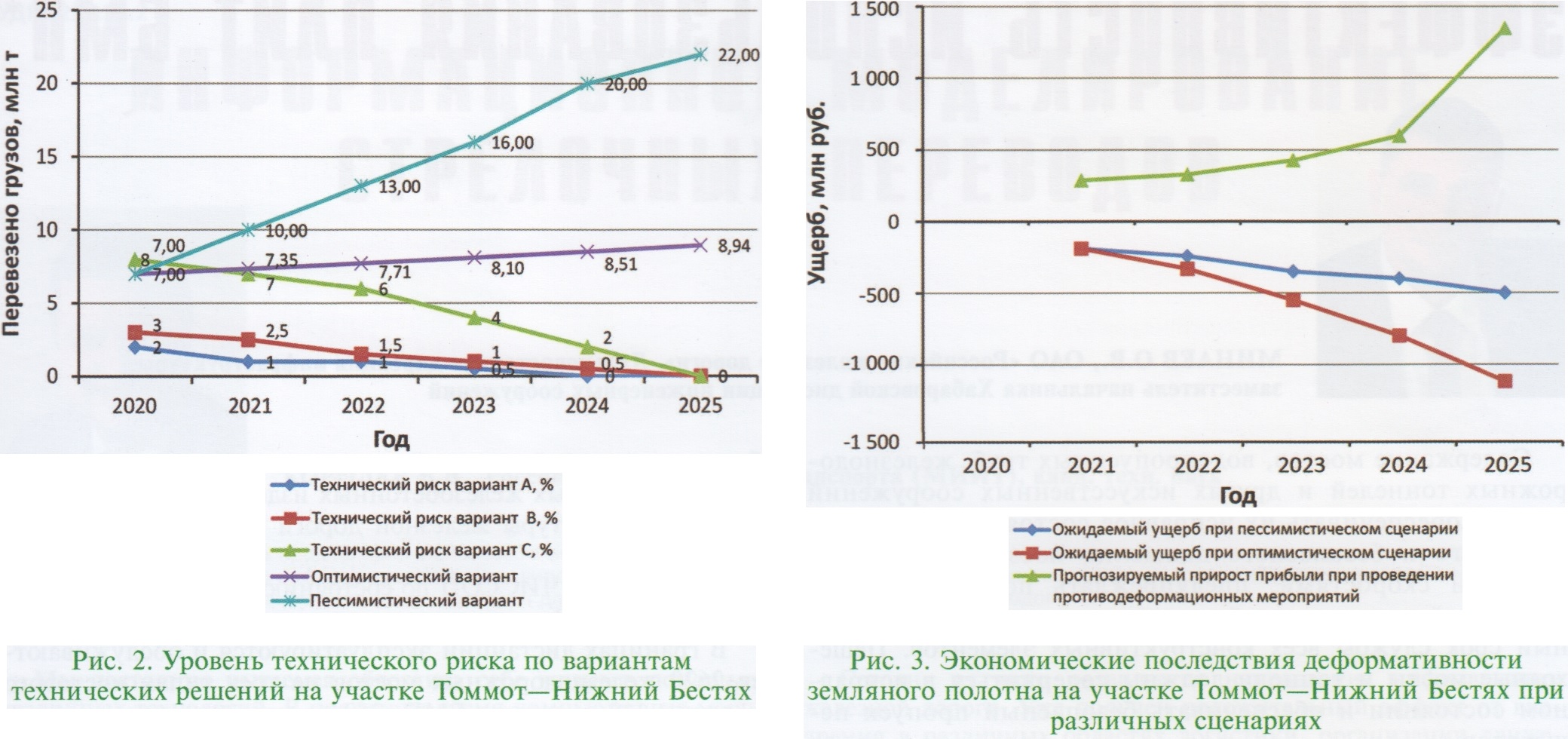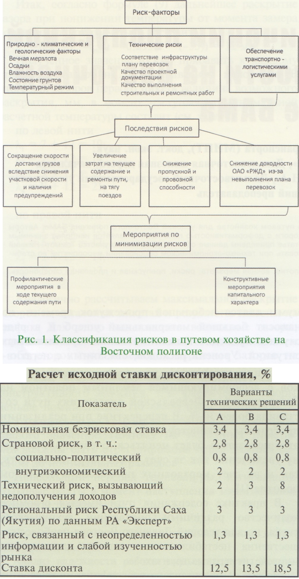 Тема: [08-2022] Учет рисков при увеличении пропускной и провозной способности на Восточном полигоне БАМаУчет рисков при увеличении пропускной и провозной способности на Восточном полигоне БАМа ВОЛКОВ Б.А., Российский университет транспорта (МИИТ), докт. экон, наук, ГАНЕНКО Е.В., ОАО «Российские железные дороги», Дальневосточная железная дорога, начальник инвестиционной службы, канд. экон, наук, НАСОНОВА Н.А., Дальневосточный государственный университет путей сообщения, старший преподаватель Аннотация. В статье рассмотрены методы учета технических рисков в путевом хозяйстве для условий Восточного полигона БАМа. Авторы использовали данные натурных наблюдений на участках Дальневосточной дороги с деформативностью полотна, что является наиболее значимым риск-фактором, вызывающим значительный ущерб при содержании пути. В статье приведены данные об исследованиях на участке Томмот—Нижний Вестях АО «АК “Железные дороги Якутии”», которые предполагается использовать при технико-экономическом обосновании мероприятий по стабилизации земляного полотна на Восточном полигоне. Ключевые слова: Восточный полигон, путевое хозяйство, земляное полотно, вечная мерзлота, риски, пропускная и провозная способность, экономическая эффективность, ущерб. Опыт эксплуатации пути в Сибири и на Дальнем Востоке показывает, что в суровых климатических условиях значительно снижаются сроки службы рельсов, скреплений, шпал, возрастает расход балластных материалов, уменьшаются межремонтные сроки, что влияет на пропускную способность. Негативное воздействие погодных явлений обнаруживается в основном лишь в сочетании с нарушениями норм содержания пути. В одних случаях происходит внезапное ухудшение состояния объектов инфраструктуры (водоразмывы, сплывы откосов, оползни, изломы рельсов), в других — неблагоприятные последствия могут проявиться лишь по прошествии нескольких лет (пучины, выплески) и длиться продолжительный период. ![]() Глубина исследования возникающих природно-климатических рисков на железнодорожном транспорте может значительно варьировать: от простой оценки опасности до детализированного анализа большого количества разнородных аварий с использованием высокоточных математических моделей. Идентификация потенциальных опасностей позволяет перейти к составлению перечня возможных аварий на объектах путевого комплекса при воздействии метеоявлений экстремальной интенсивности, их анализу и систематизации. Восточный участок БАМа характеризуется широким спектром неблагоприятных условий географической среды. Практическая сложность, а иногда и невозможность их учета не позволила разработать единую методологию количественной оценки влияния природно-климатических факторов. Большинство исследователей рассматривали многолетний режим погоды, типичный для данного региона, не акцентируя внимание на особо опасные метеорологические явления. Погодные экстре мумы длятся небольшой промежуток времени, но наносят большой материальный ущерб и в ряде случаев приводят к возникновению чрезвычайных ситуаций. Уровень расходов, связанных с негативным воздействием природно-климатических факторов, имеет значительную долю неопределенности. В связи с этим принципиальную значимость приобретает качественная и количественная оценка рис