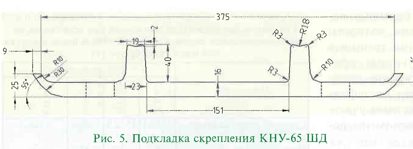 Обновленное в последние годы скрепление КНУ-65 ШД содержит улучшенную металлическую подкладку (рис. 5) с увеличенными по высоте ребордами для обеспечения зимних выпра-вочных работ, причем верхушки реборд имеют углубления для позиционирования клемм при их монтажном положении. Торцевые края подкладки выполнены с повышением, что увеличивает боковую площадь опирания подкладки для сохранности буртика нашпальной прокладки.