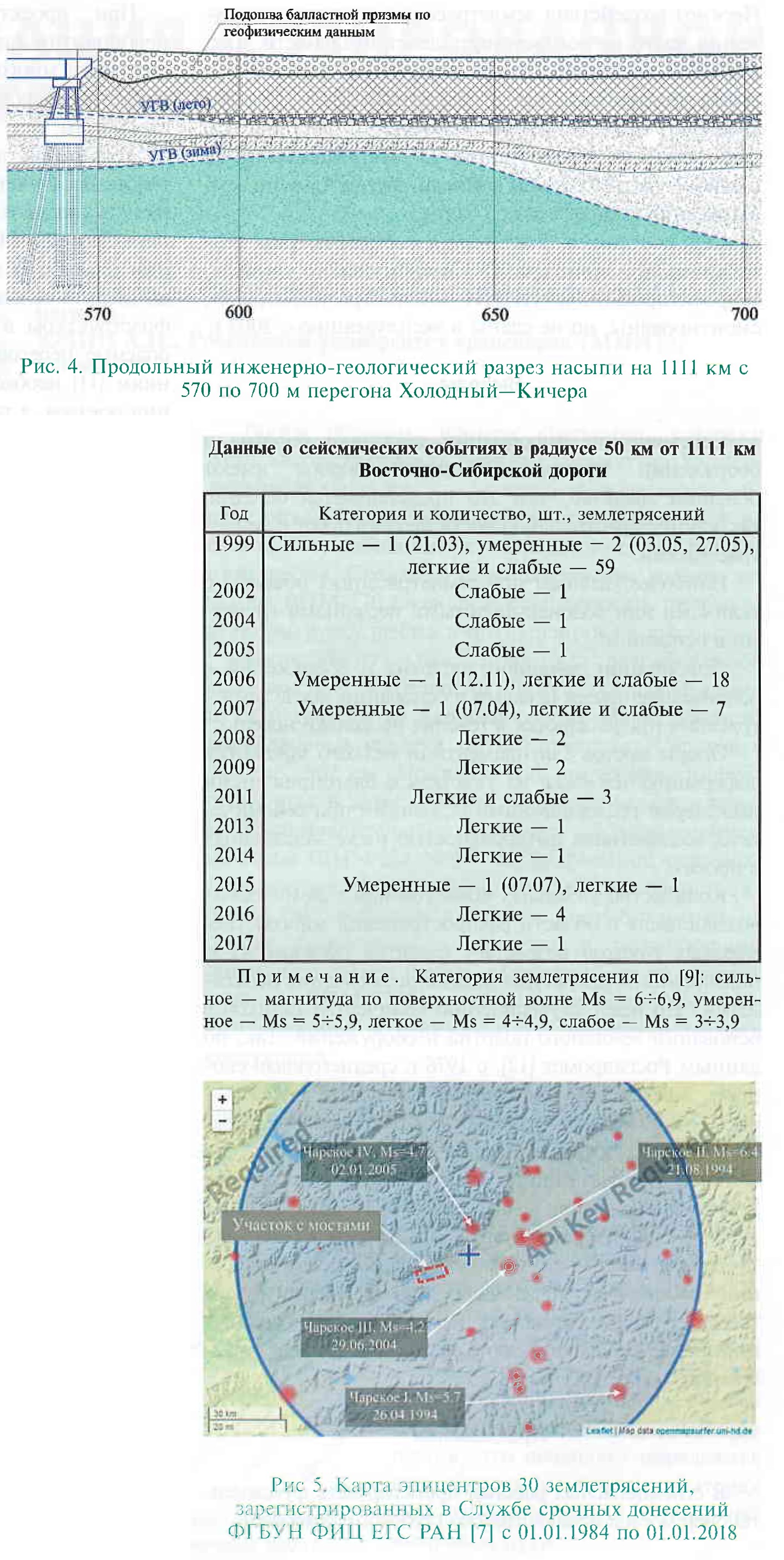 Значительно сложнее диагностировать осадки и оседания насыпей в случаях, когда землетрясения не ощущаются людьми либо оцениваются ими как слабые. Так, в 2017 г. Сетевой мерзлотной станцией Хабаровского РЦДМ была проведена диагностика насыпи на 1111 км участка Холодный—Кичера Восточно-Сибирской дороги. По данным Северобайкальской инженерно-геологической базы Иркутского РЦДМ (ИГБ Северо-байкальск) насыпь высотой до 4,0 м принята в эксплуатацию в 1981 г. Осадка насыпи на 1111 км с 570 по 700 м отмечается с 1999— 2000 гг. После многочисленных подъемок пути толщина балластной призмы увеличилась до 1,6 м. Для удержания балластной призмы с левой стороны от оси пути построен забор из старогодных шпал (рис. 3). Скорость движения поездов регулярно ограничивается, на момент проведения диагностики действовало постоянное ограничение до 60 км/ч. Отмечено, что периоды активизации осадки сменяются периодами относительной стабилизации. Диагностика участка показала следующее (рис. 4): земляное полотно сложено галечниковым грунтом с песчаным заполнителем; многолетнемерзлые и слабые грунты в основании насыпи не встречены, в разрезе преобладают водонасыщенные пески средней крупности; насыпь устойчива, расчеты в программе Гео-5 показали, что коэффициент устойчивости откосов равен или больше 1,5. ![]() По данным Службы срочных донесений ФГБУН ФИЦ ЕГС РАН [7] с 1991 по 1998 г. в радиусе 50 км от 1111 км не произошло ни одного сейсмического события, в 1999 г. зарегистрировано 62 землетрясения (см. таблицу), что совпадает с началом оседания насыпи. За период с января по декабрь 1999 г. в межвпадинной перемычке между Кичерской депрессией и Верхнеангарской впадиной произошло более 6000 толчков. По суммарной сейсмической энергии данная последовательность превзошла все известные в Байкальской рифтовой зоне, начиная с 1960 г. [8]. С 2000 по 2017 г. землетрясения магнитудой по поверхностной волне Ms от 3,3 до 5,4 происходят регулярно в радиусе 50 км. Насыпь продолжает оседать, выправки путевыми машинами выполняются в среднем один раз в два года. Таким образом, главной причиной оседания насыпи на 1111 км следует считать разжижение водонасыщенных песков в основании насыпи из-за регулярных землетрясений. В последнее десятилетие деформативность пути обусловлена также расползанием балластной призмы высотой до 1,6 м в связи с возросшим вибро-динамическим воздействием подвижного состава (повышением осевых нагрузок и длины поездов). Деформации опор мостов также редко связывают с землетрясениями. В 2017 г. специалистами «Иркутскжелдорпроект» (ИЖДП) обследовано четыре моста с фундаментами мелкого заложения на участке от станции Наледный до станции Салликит (1644 км ПК10, 1652 км ПК6, 1673 км ПК6, 1677 км ПК2), построенных в период с 1984 по 1989 г. На всех мостах обнаружены крены устоев и промежуточных опор и, как следствие, многочисленные дефекты опорных частей и пролетных строений (упирание и врезание пролетных строений в шкафные блоки, отклонение баланси ров, срез болтов крепления опорных частей, отрыв шкафных блоков и т.д.). Крен устоев моста на 1644 км ПК10 вызван неполной вырезкой подземного льда, просадочных при оттаивании супесей и органоминеральных грунтов. Деформации устоев впервые описаны Тындинской мерзлотной станцией уже через пять лет после строительства моста. В основании опор остальных трех мостов залегают крупн