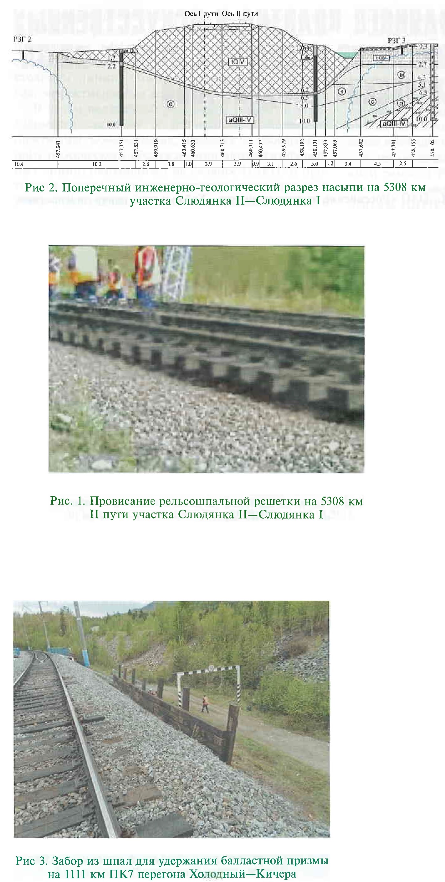 Осадки и оседания насыпей однозначно связываются с сейсмическими воздействиями только после ощутимых людьми землетрясений. Например, 27 августа 2008 г. в 30 км к северо-востоку от станции Слюдянка Восточно-Сибирской дороги произошло Култукское землетрясение магнитудой по поверхностной волне Ms = 6,1, которое в баллах шкалы MSK-64 составило: в Култуке — 7—8 баллов, Слюдянке — 7,5, Иркутске — 6 [4]. Сейсмические толчки ощущались сразу на нескольких железнодорожных станциях, что привело к временному прекращению движения поездов на участке Ангасолка—Слюдянка. Серьезных повреждений искусственные сооружения и земляное полотно не получили, за исключением оползания четного откоса насыпи с провисанием рельсошпальной решетки на 5308 км с 03 по 50 м (рис. 1). Характер и величина деформаций подтверждаются видеозаписью, сделанной после землетрясения. Примечательно, что через 2 ч после выправки наружная нить II пути вновь просела на 30 мм, осадки пути продолжались еще две с половиной недели после землетрясения с интенсивностью 10—12 мм в сутки. Диагностика земляного полотна показала следующее: