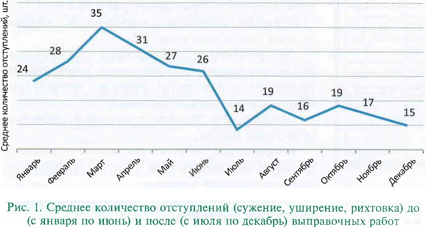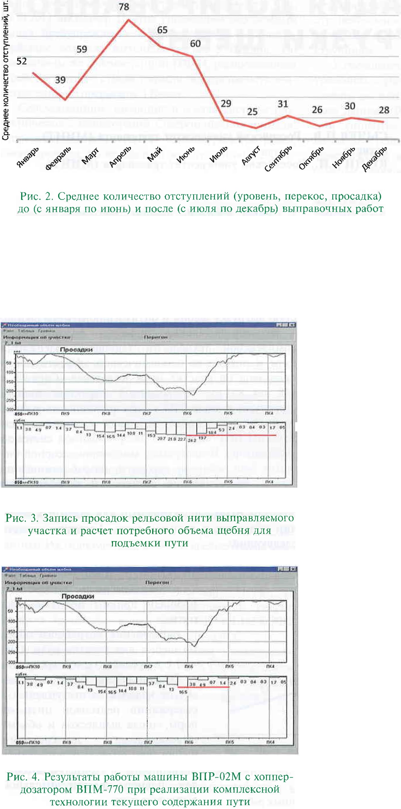 Тема: [03-2020] Автоматизация дозированной выгрузки щебняАвтоматизация дозированной выгрузки щебня СЫЧЕВ П.В., Российский университет транспорта (МИИТ), магистр, ЮДИН А.Н., Российский университет транспорта (МИИТ), магистрант На сети дорог повсеместно применяется микропроцессорная система выправки и рихтовки пути, устанавливаемая на машинах типа ВПР и др. Наиболее распространена система «Навигатор», также используются ВНИИЖТ-МАТЕСС, ALC и др. Алгоритм их работы заключается в том, что в каждом сечении пути рассчитывается величина смещения (сдвижки, подъемки) в точке переднего конца хорды и сравнивается со значением проектной стрелы изгиба машинной хорды из условий оптимального пространственного положения пути. Путевые машины, выполняющие планово-предупредительную выправку пути, оборудованы бортовым компьютером, включающим в себя следующие элементы: металлический корпус со встроенным монитором; промышленную системную плату с аналоговыми и цифровыми интерфейсами и процессором; оперативную память; промышленный флеш-диск. Компьютер соединен с контроллером, вход контролера соединен с датчиками измерительного устройства машины ВПР, а выход — с подъемно-рихтовочным устройством. Обнаруженные отклонения от норм содержания рельсовой колеи являются основой для выполнения технологических операций машины по подъемке и сдвижке пути. ![]() Таким образом, процесс подъемки, сдвижки пути автоматизирован, однако балласт из хоппер-дозаторов выгружается вручную, при этом потребный объем не рассчитывается, а определяется на глазок, что приводит к завышенному расходованию щебня. Создание и использование хоппер-до-затора ВПМ-770 позволяет осуществлять прерывистую выгрузку щебня и оптимизировать его расход. Экспериментальная проверка разработанной комплексной технологии текущего содержания пути и оценки ее экономической эффективности проведена на участке пути Кочетовка—Саратов с 848 по 852 км Приволжской дирекции инфраструктуры в июле 2018 г., где выполнялась планово-предупредительная выправка с применением машины ВПР-02М № 95, оборудованной системой «Навигатор». В программу микропроцессорной системы был добавлен алгоритм, разработанный на основе теоретических расчетов и позволяющий определить объем щебня, выгружаемого из хоппер-дозатора ВПМ-770, потребный для заданных величин подъемок и сдвижек пути. Алгоритм расчета следующий: измерение стрел прогиба в продольном профиле (стандартный алгоритм «Навигатора»); расчет изменения поперечной площади призмы при подъемке пути; определение потребного объема щебня для участка пути длиной L в пределах одной просадки. Общий расход балласта зависит от количества отступлений в содержании рельсовой нити от норм, числа выплесков и объема вырезанного загрязненного щебня, что позволяет определить потребность в хоппер-дозаторах для планово-предупредительной выправки пути. ![]() Анализ данных вагона-путеизмерителя до выправки и после показал снижение числа отступлений от норм содержания пути (рис. 1, 2). Планово-предупредительной выправке предшествовали предварительная очистка и замена балласта в местах выплесков. Основные работы осуществлялись в «окно» продолжительностью 4 ч. Фронт работ был разделен на пять участков длиной по 1 км, на каждом из которых выполнялась предварительная измерительная 
