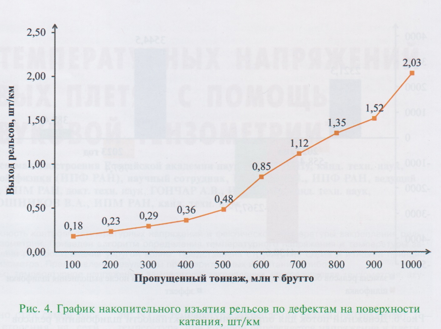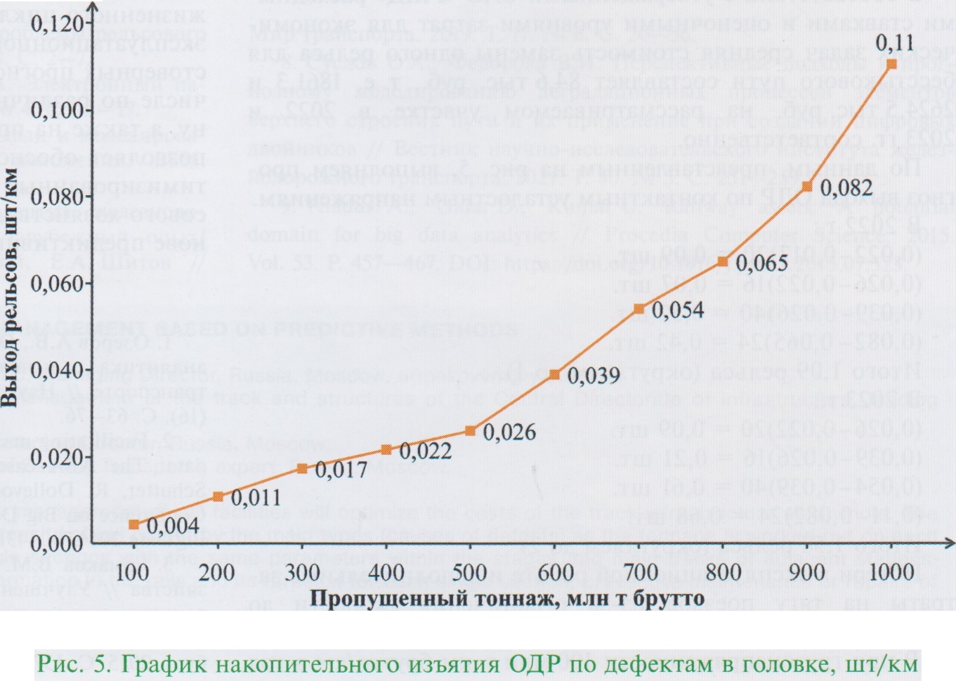 C = NjSOCTi + Ni*t3i*Snp, где Nj — количество задержанных поездов каждой категории, шт.; SOCTi — себестоимость остановки одного поезда соответствующей категории, руб.; t3i — время задержки поездов, ч; Snp — себестоимость простоя одного поезда каждой категории, руб. Дополнительные затраты энергии на разгон поездов после ограничения скорости в местах действия предупреждений определяются на основе тяговых расчетов. Общие затраты в эксплуатационной работе, на тягу поездов и в хозяйстве пути от появления ДР и ОДР на участках с различными условиями эксплуатации существенно отличаются. Если при ограничении скорости в течение часа и грузонапряженности 20 млн т-км брутто/км в год доля затрат хозяйства пути составляет 70 % общих, то при трехчасовом ограничении скорости и грузонапряженности 150 млн т-км брутто/км в год доля затрат хозяйства пути составляет всего 20 %, а 80 % реализуются в эксплуатационной работе и на тягу поездов; при этом общие затраты достигают 0,5 млн руб. на один ОДР. Специальное программное обеспечение в составе ЕК АСУИ должно обеспечивать получение в режиме реального времени соответствующих выходных форм. Используя тренды фактической интенсивности дефектообразования в рельсах (упомянутые выше а—ж) и ее прогноз на каждом единичном участке, планируют профилактические работы (см. таблицу) или ремонты пути. Пример расчета эффективности назначения шлифования рельсов на участке с высокой интенсивностью их выхода. В соответствии с приведенной выше таблицей для оценки эффективности шлифовки используются следующие выходные формы анализа и прогноза выхода рельсов (тренды): б) по поверхностным (включая смятие головки рельса) и контактно-усталостным; д) по пробуксовкам. Условия эксплуатации: участок протяженностью 100 км; грузонапряженность 100 млн т-км брутто/км в год; нагрузка 15,5 тс/ось; бесстыковой путь; протяженность кривых радиусом менее 1200 м — до 10 %; пропущенный тоннаж на 01.01.2022: на 20 км — 250, 16 км — 340, 40 км — 480, 24 км — 780 млн т брутто. За период эксплуатации данного участка образовывались поверхностные дефекты. Динамика изъятия рельсов по контактно-усталостным дефектам на поверхности головки (дефекты 10, 11, 12, 16, 19) и смятия головки (дефекты 40, 49, 41, 43), приведенная к 1 км, представлена на рис. 4 (на участке 780 — 1000 млн т брутто график продлен на основе ранее выполненных исследований). В период эксплуатации были также изъяты рельсы по контактно-усталостным дефектам в головке (дефекты 20, 21, 22, 30 (ЗОГ), 31 (ЗОВ), 22). Динамика их изъятия за период эксплуатации с прогнозом до 1000 млн т брутто приведена на рис. 5. По данным, представленным на рис. 4, для участка рассчитываем прогнозное образование дефектов на поверхности катания рельсов. В 2022 г.: (0,36-0,29)20 = 1,4 шт. (0,48-0,36)16 = 1,98 шт. (0,85-0,48)40 = 14,74 шт. (1,52-1,35)24 = 4,01 шт. Итого 22 рельса. В 2023 г.: (0,48-0,36)20 = 12,47 шт. (0,85-0,48)16 = 5,9 шт. (1,12-0,85)40 = 10,58 шт. (2,03-1,52)24 = 12,38 шт. Итого 31 рельс. Например, к концу 2022 г. наработка на первом участке протяженностью 20 км увеличится до 350 млн т брутто. При наработке 350 млн т брутто накопленное количество дефектных рельсов составит 0,36 шт/км (см. рис. 4). Из этого значения нужно вычесть ранее изъятые на начало года при наработке 250 млн т брутто 0,29 шт/км и умножить на длину участка 20 км. Получим изъятие за 2022 г.: 1,4 рельса на 1 км. В соответствии с утвержденными ОАО «РЖД» расходными ставками и оценочными уровнями затрат для экономи