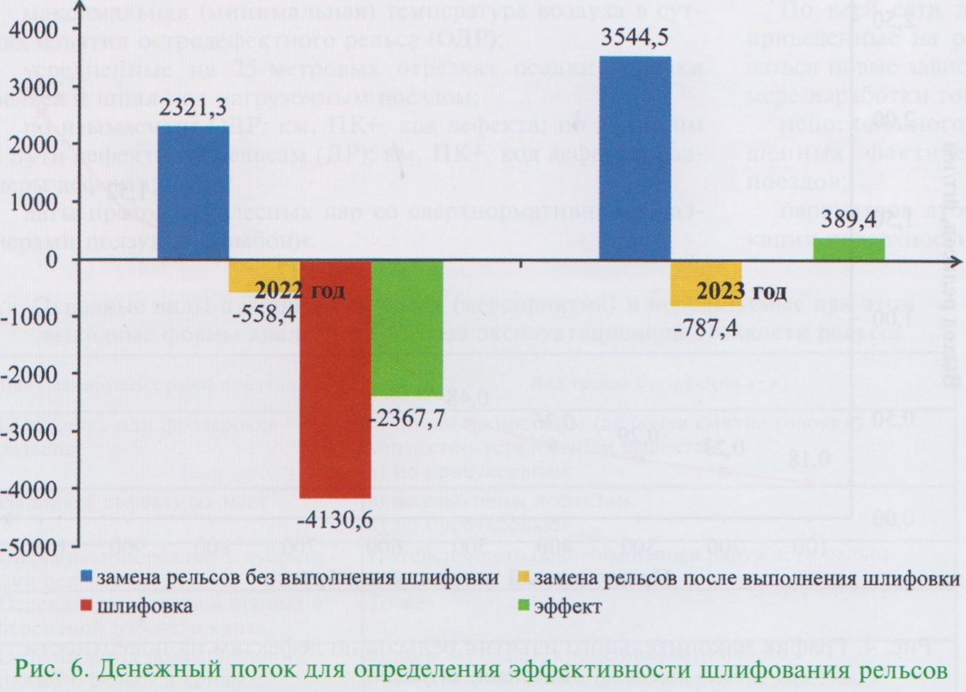 ![]() Потери в эксплуатационной работе и дополнительные затраты на тягу поездов из-за ограничения скорости до 15 км/ч продолжительностью 2 ч по причине образования ОДР при грузонапряженности 100 млн т-км брутто/км в год составляют 460 тыс. руб. Дополнительные затраты на данном участке составляют в 2022 г. (изъятие одного ОДР) 460 тыс. руб., в 2023 г. (изъятие двух ОДР) — 920 тыс. руб. На рис. 4 и 5 интенсивности изъятия рельсов приведены без учета влияния шлифовки, которая устраняет поверхностные дефекты, замедляет их рост, а также не дает развиваться дефектам в головке рельса. Поэтому в расчете принимаем, что в 2022 и 2023 гг. ОДР не будет, а изъятие по контактным усталостным дефектам сократится на 70 %. Затраты на замену рельсов при отсутствии шлифовки составляют: 460 + 1861,3 = 2321,3 тыс. руб. в 2022 г.; 920 + 2624,5 = 3544,5 тыс. руб. в 2023 г.; за два года — 5865,8 тыс. руб. Стоимость шлифовки 1 км пути составляет 41,306 тыс. руб. на 1 км, или 4130,6 тыс. руб. на 100 км. Затраты на замену 30 % рельсов составляют в 2022 г. 558,4 тыс. руб., в 2023 г. — ZUZZ Г. ЭЭ6,Ч тыс. руо., в ZUZJ г. — 787,4 тыс. руб. Таким образом, затраты на шлифовку в 2022 г. превышают затраты на замену рельсов. Однако с учетом уменьшения изъятия рельсов и в 2023 г. затраты на шлифовку окупаются уже через 1,86 года. ![]() Денежный поток для определения эффективности шлифования рельсов представлен на рис. 6. Кроме того, в данном примере не рассматривались следующие эффекты от шлифования: