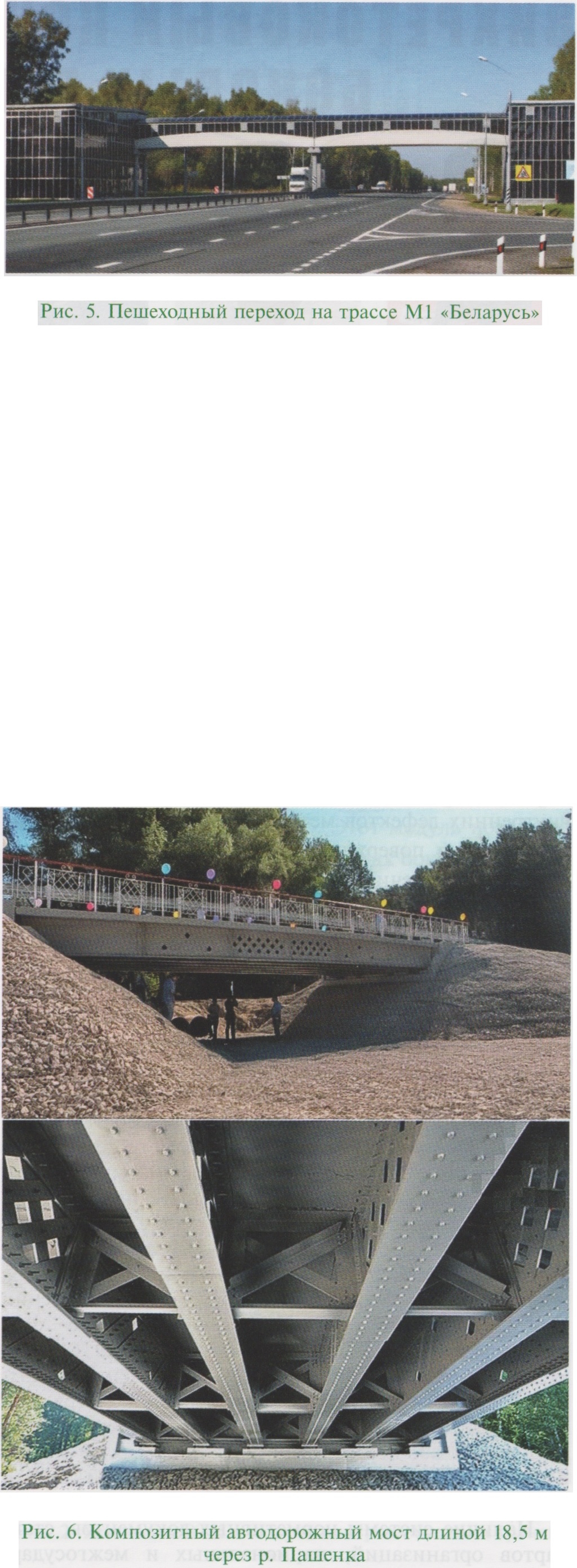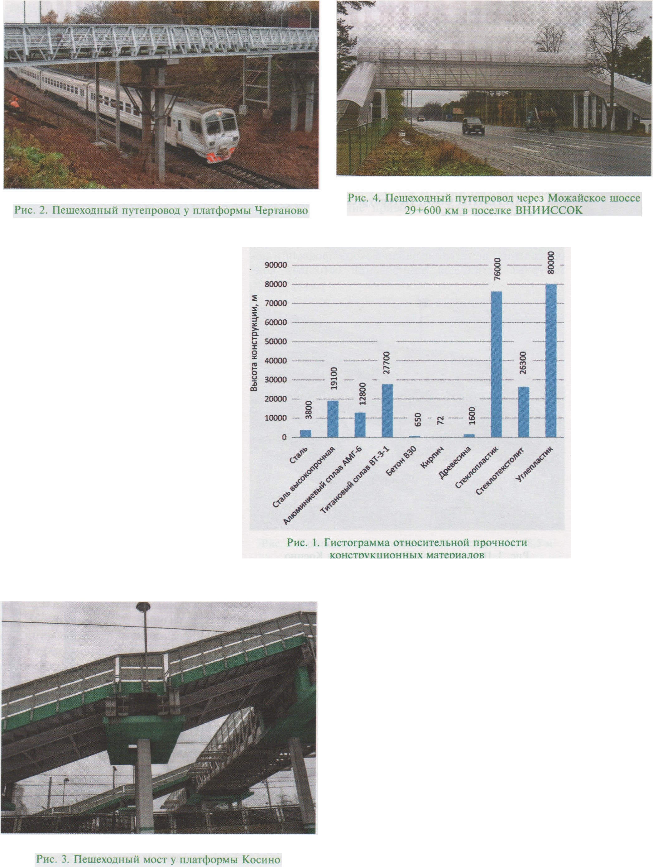 Основным недостатком ПКМ является ярко выраженная анизотропия свойств, как в отношении деформации, так и в отношении прочности, что необходимо учитывать при проектировании сооружений. К тому же у стеклопластиков модуль упругости в три раза меньше, чем у стали, что увеличивает де-формативность строительных конструкций. Углепластики лишены этого недостатка. Отмечается также чувствительность полимерной матрицы к ультрафиолетовому излучению, вызывающему старение материала. Этот недостаток устраняют, нанося защитное светоотражающее покрытие. Конструкции из ПКМ дороже стальных и железобетонных аналогов, что также ограничивает их широкое применение. По данным ГК «РУСКОМПОЗИТ», стоимость композитных пролетных строений на момент их отгрузки в 1,5—2 раза выше, чем железобетонных. Однако предполагается, что за первые 10 лет эксплуатации расходы на содержание объектов с применением конструкций из ПКМ будут в 12-15 раз меньше, чем железобетонных или металлических, а срок эксплуатации композитных пешеходных переходов мостового типа, без вложений в капитальный ремонт, составит не менее 50 лет. В транспортном строительстве ПКМ на основе высокопрочных силикатных или углеродных волокон начали применять в XX в. В настоящее время из них изготавливают разнообразные конструкции [1— 3]: лотки водоотводящих и дренажных систем; колодцы ливневой канализации; профильные элементы (ГОСТ 33344—2015); секции настилов для пешеходных и автодорожных мостов и путепроводов (ГОСТ 33376—2015); лестничные сходы; перильные ограждения; арматуру периодического профиля и арматурные сетки для армирования бетонных конструкций (ГОСТ 31938—2022); системы внешнего армирования для ремонта и реконструкции железобетонных конструкций; павильоны станций; опоры освещения и ЛЭП (ГОСТ Р 58018-2017); стойки для дорожных знаков, светофоров, дорожных указателей, информационных стендов (ГОСТ Р 52282-2004); водопропускные трубы (ГОСТ 33123—2014); люки колодцев (ГОСТ 3634-2019); георешетки для укрепления конусов насыпей (ГОСТ Р 56708—2015); балки (НСВ) длиной 9, 12, 18 и 24 м; несъемную опалубку для формования железобетонных конструкций; плиты для укрепления основания насыпей в зоне вечной мерзлоты; шпунт композитный полимерный (ГОСТ Р 57942—2017); конструкции для пешеходных мостов и путепроводов (ГОСТ 33119—2014). В XXI в. ПКМ начали применять в мостостроении, пока в небольших мостовых сооружениях, преимущественно пешеходных. Первые композитные пешеходные путепроводы были построены в России с использованием полтру-зионных* профилей. В ноябре 2004 г. у платформы Чертаново был построен пешеходный путепровод через путь Павелецкого направления Московской дороги (рис. 2). Расстояние между шкафными стенками устоев — 41,4 м. Схема пролетов: 13,2+15+13,2 м. В поперечном сечении путепровода установлены две главные фермы высотой 1,81 м с расстоянием между осями 3,14 м. Монтажные соединения элементов главных ферм и элементов продольных и поперечных балок — клееболтовые с использованием стальных фасонных изделий. В июле 2005 г. у платформы Косино через I—IV главные пути направления Москва—Рязань был сооружен второй пешеходный путепровод с двумя пролетными строениями длиной по 17 м, тремя лестничными сходами, изготовленными из пултрузионных стеклопластиковых профилей (рис. 3). Полная длина путепровода составила 47,0 м; ширина пешеходной части — 5,0 м. 