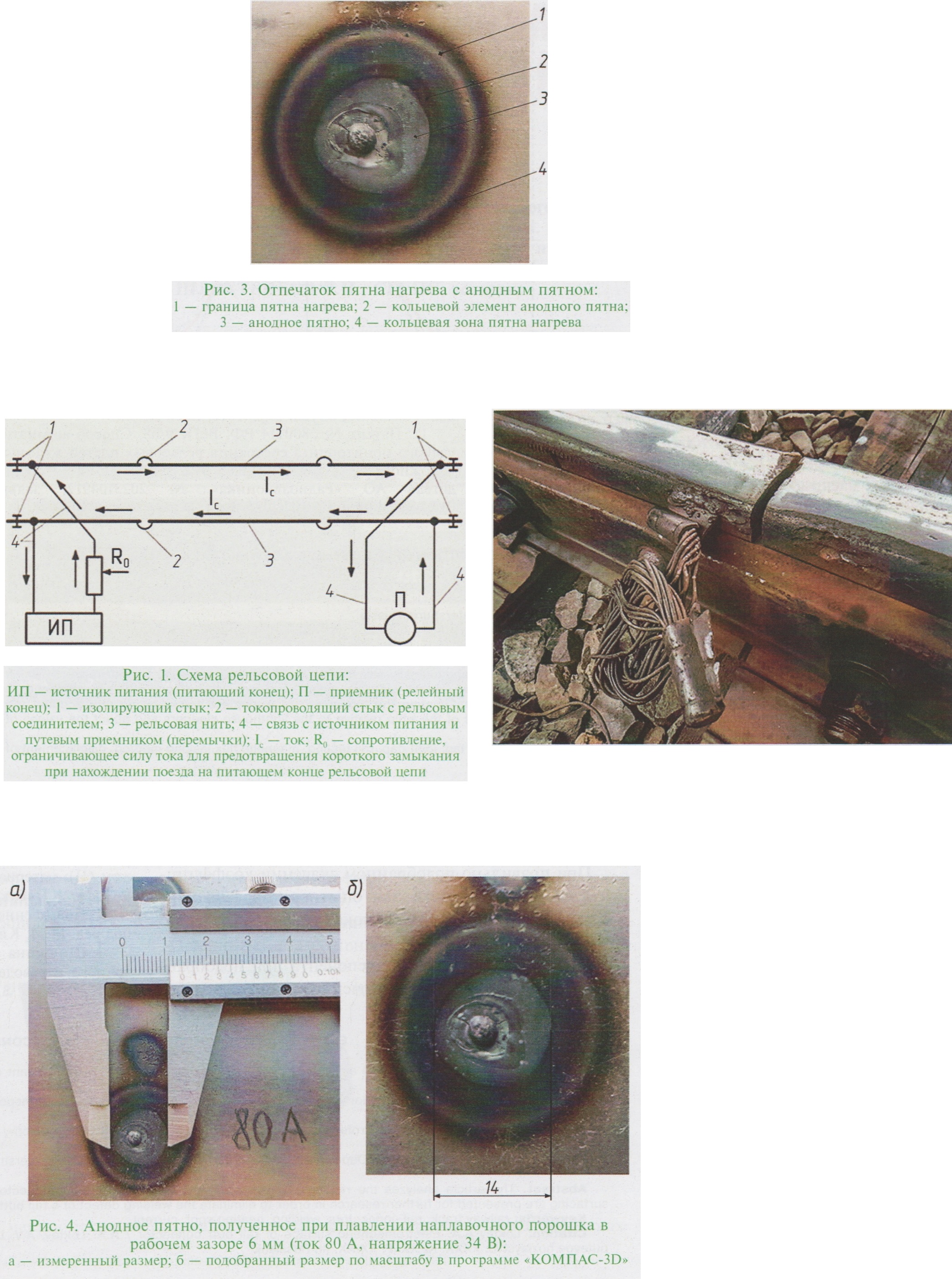 Тема: [02-2024] Электромагнитная наплавка рельсового стыкового соединителяЭлектромагнитная наплавка рельсового стыкового соединителя ЛОКТЕВ А.А., Российский университет транспорта (МИИТ), докт. физ.-мат. наук, ЛЮДАГОВСКИЙ А.В., РУТ (МИИТ), докт. техн, наук, ШИШКИНА И.В., РУТ (МИИТ), канд. техн, наук, ПОЛУХИН В.А., РУТ (МИИТ), аспирант Аннотация. В статье проанализированы причины неисправности рельсового стыкового соединителя. Представлены данные пятна нагрева при электромагнитной наплавке для дальнейших исследований с целью ликвидации дефекта приварки рельсового стыкового соединителя. Ключевые слова: железнодорожный путь, рельсовые соединители, сварка, пятно нагрева, ток. Рельсовая нить представляет собой электрическую цепь, в которой имеется источник питания и нагрузка (путевое реле). По ней идет передача сигнала (рис. 1). Сигнальный ток подается от передающего устройства к поезду по одному рельсу, протекает через замыкающую рельсы между собой колесную пару и возвращается к передающему устройству по другому рельсу. При этом рельсы и колесная пара образуют рамку с током, магнитное поле которой улавливается приемными катушками, подвешенными перед первой колесной парой на высоте ПО—240 мм над рельсами. Будучи одним из основных элементов системы безопасности, рельсовые цепи сложны и затратны в эксплуатации [1]. Все применяемые в настоящее время рельсовые соединители имеют существенные недостатки, приводящие к большому количеству отказов рельсовых цепей. Высокая интенсивность отказов соединителей вызвана возникающими в процессе их эксплуатации неисправностями. К наиболее характерным из них относятся следующие: обрыв соединителя в месте приварки к рельсу (рис. 2), ненадежный контакт между тросом и манжетой. Обрыв соединителя объясняется недостатками в технологии его приварки к рельсу, а также некачественным ее выполнением, как правило, в сложных полевых условиях. Количество отказов работы типовых соединителей растет с каждым годом. Неоднократная приварка их к одному и тому же рельсу ухудшает качество сварного шва и вредно для структуры металла. По существующим нормам соединители приваривают к боковой нерабочей грани стандартного рельса так, чтобы верхняя часть манжеты находилась ниже поверхности катания рельса. Однако в результате износа рельсов и технологических отклонений манжета соединителя оказывается на меньшем расстоянии от поверхности катания рельса и поэтому, часто подвергаясь ударам колес подвижного состава, повреждается ими. При перевозке рельсов и других материалов двухребордные путевые тележки (модероны) гребнем своих колес отбивают соединители. Также соединители могут быть повреждены зимой при работе электробалластера щетками, подкладками или костылями в результате угона рельсов, путевым инструментом при очистке стыков. Ненадежный контакт троса соединителя с манжетой обусловлен рядом технологических и конструктивных причин, которые приводят к увеличению переходного сопротивления и, в конечном счете, к обрыву. Проведенный анализ позволяет сделать вывод о том, что такое нарушение происходит, главным образом, после установки соединителя в путь за счет разогрева манжеты в процессе ее приварки к рельсу. В этом случае происходит деформация, ослабление усилия обжатия троса, а также окисление контактирую