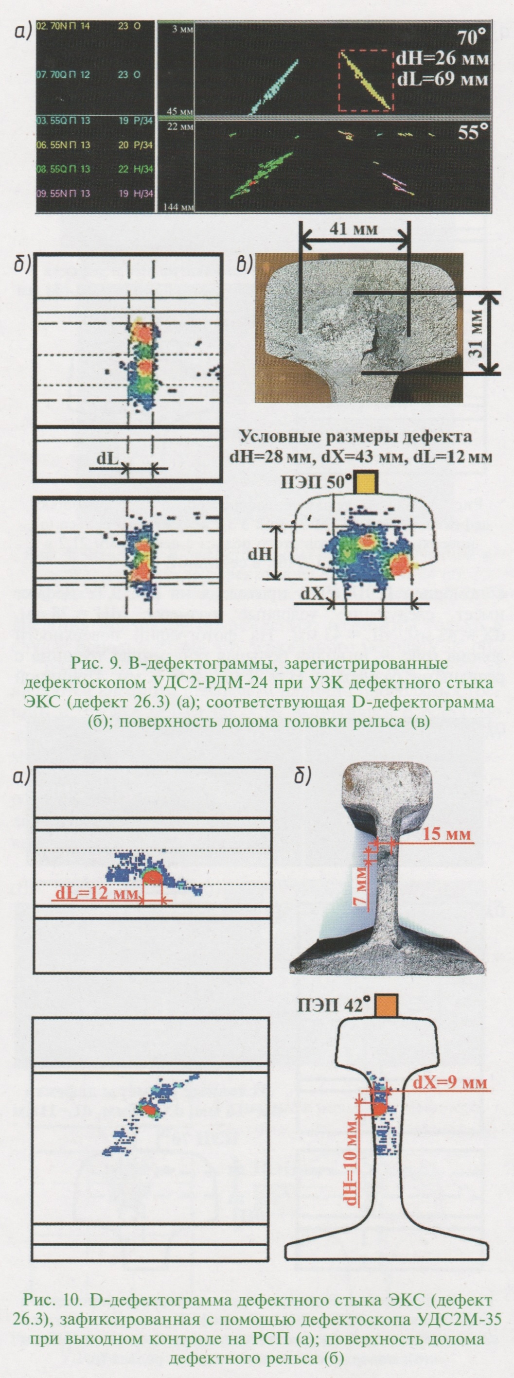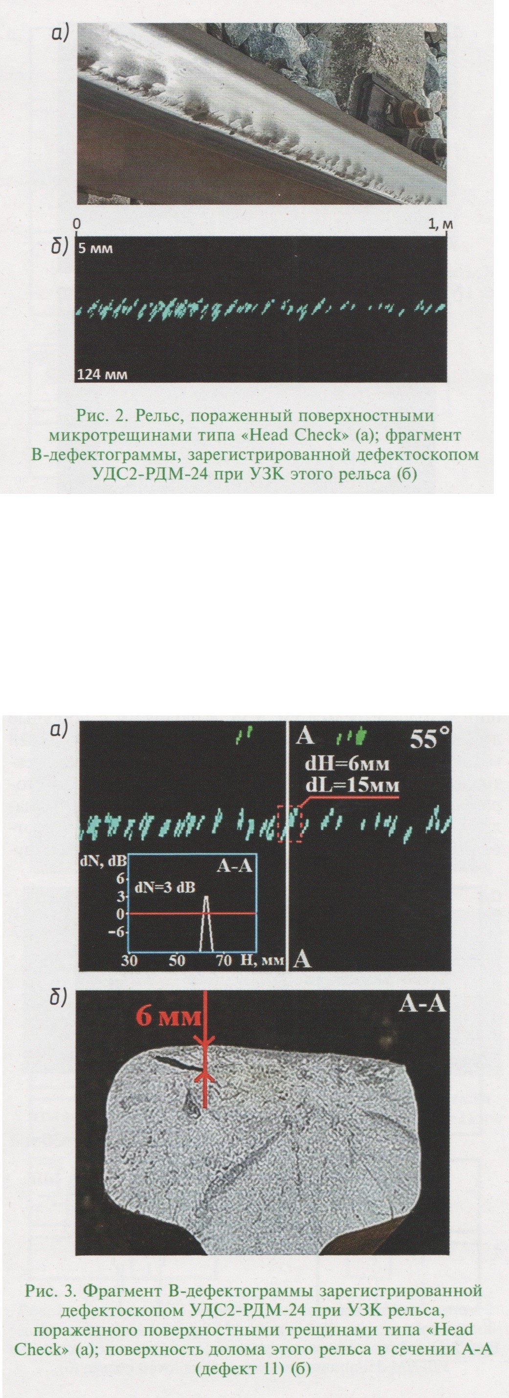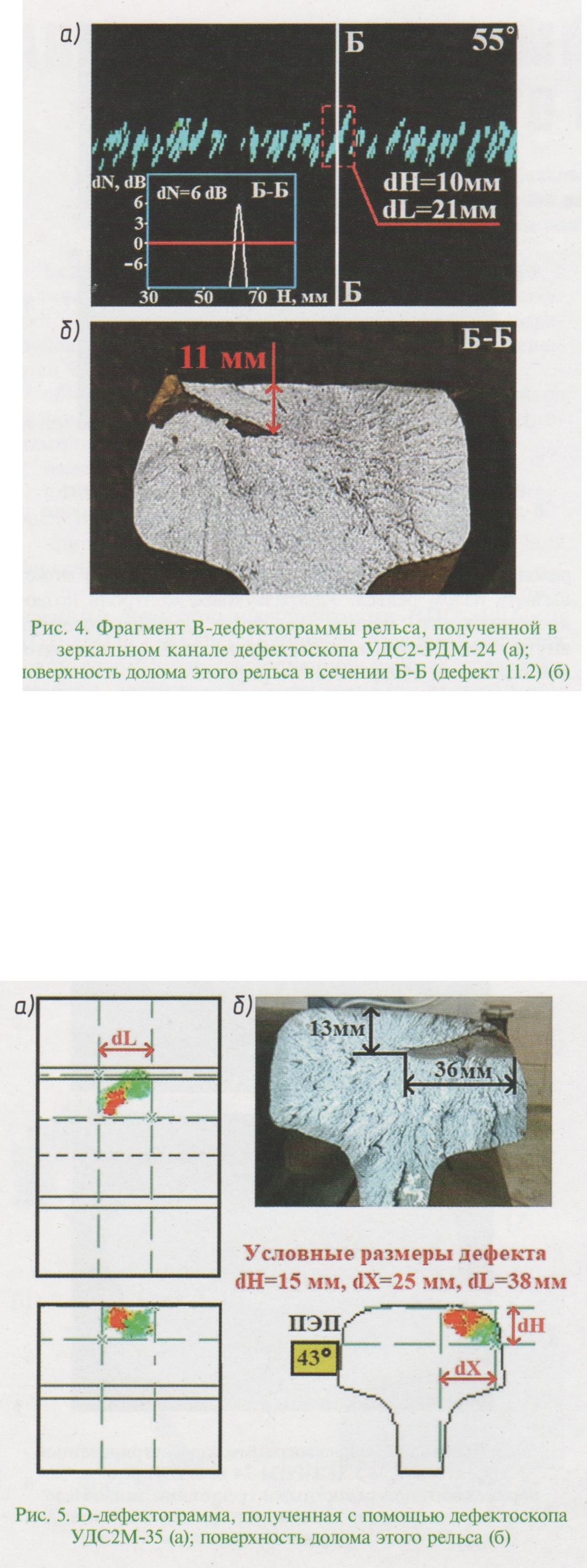 В случае сплошного УЗК обнаружение и оценка размеров внутренних продольных трещин на начальной стадии их развития в зоне рабочей выкружки головки рельса (рис. 3, б), при отсутствии каких-либо внешних признаков повреждения, возможны только в случае использования эхо-зеркального метода УЗК [4]. ![]() Темные пятна на поверхности катания (см. рис. 2, а) являются внешним признаком наличия продольных трещин в головке рельса [5]. УЗК выполнялся с помощью дефектоскопа УДС2-РДМ-24, в котором эхо-зеркальный метод реализовывался с помощью наклонных пьезоэлектрических преобразователей (ПЭП), развернутых в сторону рабочей грани головки рельсы. Обобщенный анализ сигналов, полученных в зеркальном канале, и соответствующих вскрытых дефектов показал, что существует значительная корреляция между условными размерами зарегистрированных внутренних трещин и максимальными глубинами их залегания относительно поверхности катания головки рельса. В качестве примера на рис. 3, а и рис. 4, а представлены фрагменты В-дефектограмм, полученных в зеркальном канале дефектоскопа УДС2-РДМ-24. Выполнялись измерения амплитуд отраженных сигналов и условных размеров дефектов, зарегистрированных в сечениях А-А и Б-Б указанных дефектограмм. Из представленных данных следует, что максимальная амплитуда сигнала в первом случае (см. рис. 3, а) на 3 dB превышает пороговый уровень, условный размер по длине рельса (dL) равен 15 мм и условная высота дефекта (dH) равна 6 мм. Во втором случае (см. рис. 4, а) максимальная амплитуда сигнала превышает пороговый уровень на 6 dB, dL = 21 мм, dH = 10 мм. На фотографиях поверхности долома этих рельсов в сечениях А-А и Б-Б присутствуют внутренние трещины, максимальные глубины залегания которых равны 6 мм (см. рис. 3,6) и 11 мм (рис. 4, б), что хорошо совпадает с оценками условных высот рассматриваемых дефектов по данным УЗК. Дальнейшее развитие продольной трещины (дефект 11) и ее переход в поперечную трещину (дефект 21) показан на рис. 5, а. Здесь представлена D-дефектограмма, полученная с помощью дефектоскопа УДС2М-35. УЗК осуществлялся с нерабочей грани головки рельса. Использовался ручной ПЭП с углом ввода луча 43°. Условные размеры зарегистрированного дефекта dH =15 мм, dX = 25 мм. На рис. 5, б изображена поверхность долома дефектного рельса, на которой присутствует продольная трещина, переходящая в поперечную, с реальными размерами Н = 13 мм, X = 36 мм. Из представленных данных следует, что реальные размеры опасного дефекта коррелируют с его условными размерами, полученными при УЗК. На рис. 6, а изображен фрагмент дефектного рельса, изъятого из пути, с большим боковым и вертикальным износом. Кроме того, на его рабочей выкружке присутствуют выщербины глубиной до 5 мм, образовавшиеся в результате выкола продольных внутренних трещин. УЗК этого рельса в пути осуществлялся с помощью однониточного дефектоскопа УДС2М-11. Представленные сигналы демонстрируют наличие больших поперечных трещин (дефекты 21) в сечениях А-А, Б-Б и В-В головки рельса, развившихся из продольных внутренних трещин. Уточняющий контроль дефектного рельса выполнялся с помощью ПЭП с углом ввода луча 65°. Полученная D-дефектограмма (рис. 7) подтверждает присутствие трех опасных дефектов в указанных сечениях. На этом же рисунке изображены поверхности доломов после подпиливания рельса в сечениях А-А и Б-Б с большими поперечн