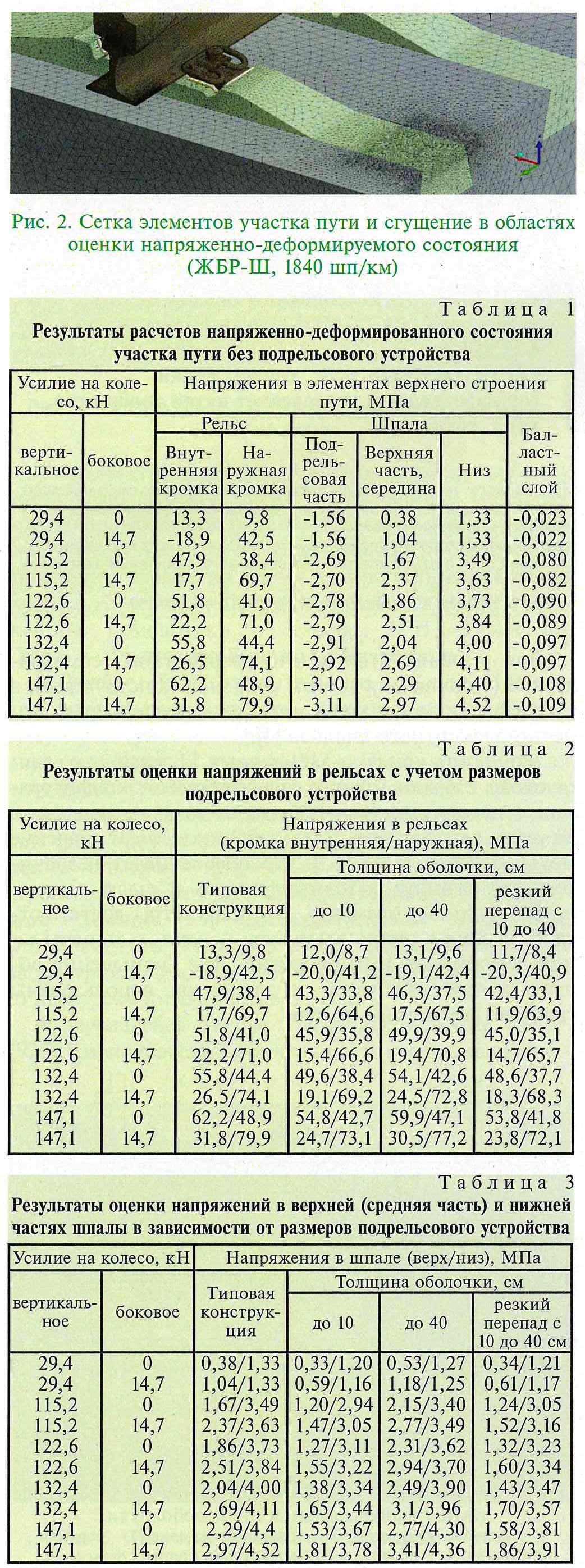 На рис. 2 показана сетка элементов модели. Между элементами верхнего строения пути, а также балластным слоем и земляным полотном заданы контактные связи, в том числе нелинейные, позволяющие добавлять в область взаимодействия силы трения, отрыв элементов относительно друг друга [5]. Таким образом, данная конфигурация конечно-элементной модели позволяет учитывать при моделировании следующие особенности: