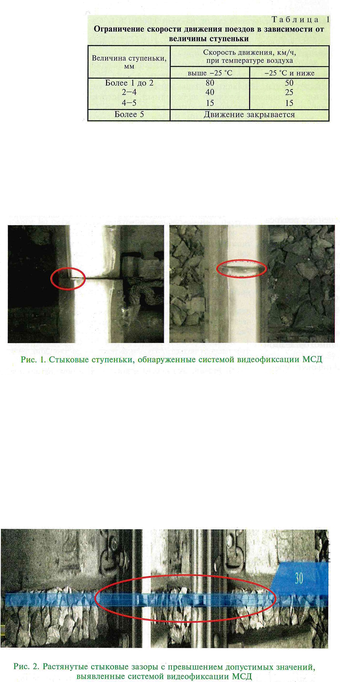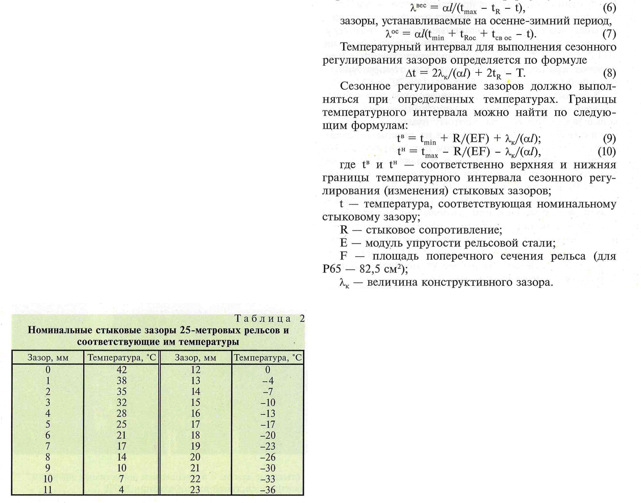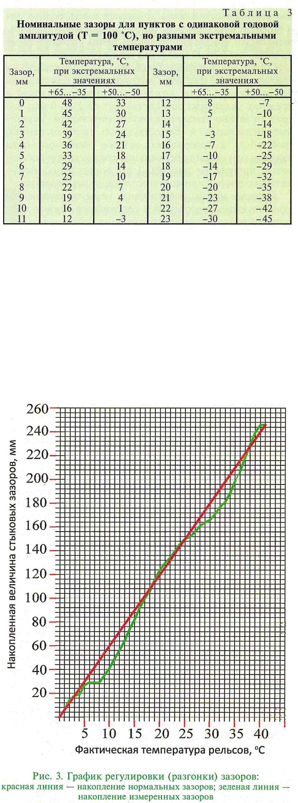 Тема: [01-2025] Влияние изменения температуры на содержание стыков звеньевого путиВлияние изменения температуры на содержание стыков звеньевого пути БОНДАРЕНКО А.А., Самарский государственный университет путей сообщения (СГУПС), каид. техн, наук, ТИШУКОВ С.В., СГУПС, канд. техн, наук, ВАСИЛЬЕВА О.М., СГУПС, старший преподаватель Рельсовый стык, особенно в растянутом до конструктивного или даже более значения, был и остается одним из слабых и опасных мест в звеньевой конструкции верхнего строения пути [1, 2]. На приведение стыков в исправное состояние приходится до 45 % затрат на текущее содержание пути [1—3]. До сих пор не удалось установить точную величину номинального стыкового зазора, под которым подразумевается зазор, позволяющий создать оптимальные условия температурной работы 25-метровых рельсов [3—6]. В настоящее время номинальный зазор для конкретной дистанции пути определяют эмпирически по действующим нормативам, выполнение которых для большей части дорог, расположенных в районах с резкими перепадами суточных температур, не позволяет оптимизировать температурную работу звеньевого пути. При этом под оптимизацией понимают полное использование конструктивного зазора при высоких положительных температурах в летний период и исключение изгиба стыковых болтов при низких отрицательных в зимний [3, 4, 5]. ![]() Например, в районе Онеги годовая амплитуда температуры рельсов составляет 99 °C (traax = +53 °C и tmin= -46 °C), что отвечает второй климатической зоне, где годовые амплитуды изменяются от 80 до 100 °C. В этом случае в соответствии с существующими рекомендациями нулевые зазоры следует устанавливать при температуре +40 °C. Конструктивному зазору 21 мм соответствует температура -31 °C, а зазору 23 мм 38 °C. По этой рекомендации осу- ществляют назначение и установку зазоров при первоначальной укладке рельсов или звеньев путевой решетки, а также при сплошной смене рельсов новыми или старогодными. Теми же значениями руководствуются при разгонке или регулировке стыковых зазоров, т. е. устанавливают номинальные зазоры при отсутствии стыкового сопротивления для свободно лежащих рельсов [1, 7—9]. Для практических измерений стыковых зазоров используют обычные прозорники (ручной способ измерений) или современные мобильные средства диагностики (МСД) типа «ЭРА+» и др. Ручные измерения, которые на практике применяются все реже, позволяют получить только единичные значения зазоров сначала по одной рельсовой нити, затем по другой, а МСД в автоматическом режиме непрерывно фиксируют зазоры на всем протяжении участка измерений, высоту вертикальной ступеньки, а также температуру рельсов одновременно по обеим нитям. В результате программное обеспечение МСД выдает выходные формы, позволяющие оперативно принимать решения по обеспечению безопасности движения. Диагностическое оборудование МСД содержит систему оценки рельсовых стыков (СОС), которая входит в состав приложений дополнительных параметров бортовой автоматизированной системы «ЭРА+» [10]. Она обеспечивает измерение, фиксацию и привязку положения зазоров к координате пути. При наличии ступенек (рис. 1), представляющих опасность для движения поездов, необходимо уменьшать скорость согласно табл. 1. Соответственно при выявлении следящей системой МСД сверхнормативных стыковых зазоров (рис. 2) вводится огр