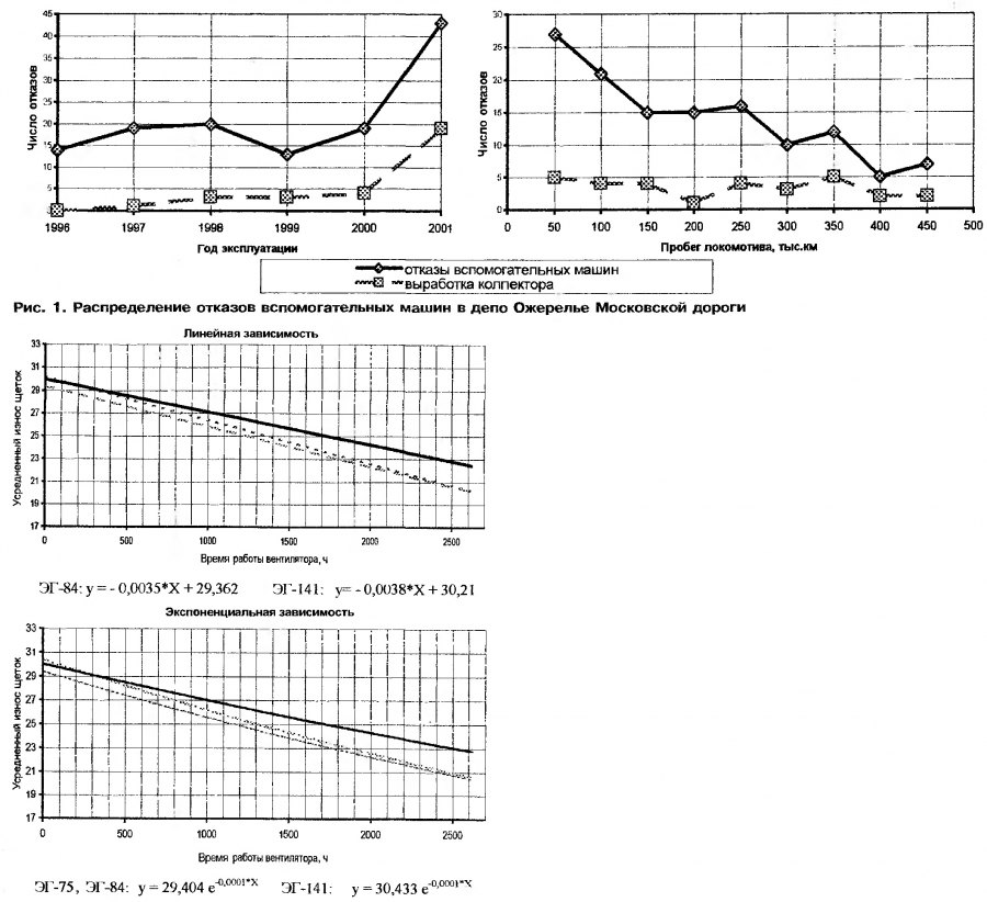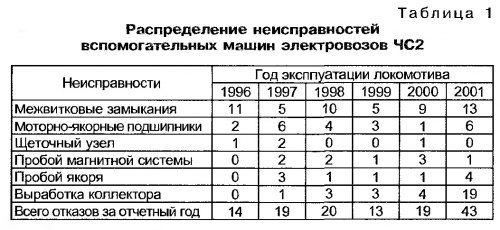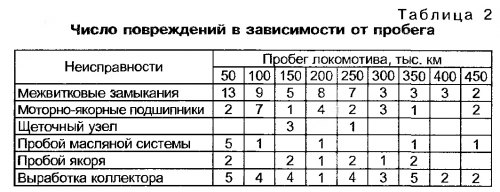 Тема: Повышена надежность вспомогательных машин электровозов ЧС2Повышена надежность вспомогательных машин электровозов ЧС2 На электровозах постоянного тока применяется принудительная система вентиляции тяговых двигателей (ТД) и пусковых резисторов. В качестве вентиляторов используют двигатели постоянного тока последовательного возбуждения. Вместе с ТД они образуют комплекс электрических машин, от нормальной работы которых зависит надежность всего локомотива. В последнее время уделяют повышенное внимание устойчивой работе тяговых двигателей. Выход из строя одного из ТД приводит к необходимости сбора аварийной схемы и уменьшению мощности локомотива на 25 — 33 % (в зависимости от серии). Неисправность же мотор-вентилятора влечет за собой отключение одной из тележек на электровозах ЧС2 (одной секции на электровозах серий ВЛ10, ВЛ11) и уменьшению мощности локомотива в целом на 50 %. В последние годы на электровозах ЧС2 резко увеличился выход из строя мотор-вентиляторов 8А-3432/4 из-за выработки коллектора. Анализ состояния локомотивного парка на Московской дороге за 1992 — 2000 гг. показал, что заходы электровозов на неплановый ремонт по этой причине чрезвычайно редки. В статистическом анализе данную неисправность даже не выделяли отдельной строкой, а относили к прочим неисправностям. За период с января 2000 г. по июль 2001 г. в депо Ожерелье из-за выработки коллекторов было забраковано 18 двигателей мотор-вентиляторов (табл. 1). Анализ причин показал, что указанная неисправность не зависит от пробега локомотива в межремонтный период (рис. 1). Лишь при пробегах 175... 200 тыс. км и 350 тыс. км наблюдается спад числа выходов из строя мотор-вентиляторов. Это объясняется проведением плановых видов ремонта в объеме ТРС, CP (ТР-2, ТР-3), при которых выполнялся цикл работ согласно инструкции № ЦТВР-4782 вне зависимости от состояния коллектора. ![]() На основании анализа неисправностей вспомогательных машин в депо установили, что главная причина, влияющая на выход из строя двигателей из-за выработки коллектора, — плохое качество электрических щеток. Все электрические машины работали со щетками марки ЭГ-61. Другие причины выработки коллекторов, такие как межвитковые замыкания в якорной обмотке главных и добавочных полюсах, плохое качество пайки петушков секций якоря и уравнительных соединений, неправильная расстановка полюсов и наличие асимметрии магнитной системы, разные воздушные зазоры — в расчет не принимались. Дело в том, что их устранение в условиях депо требует значительных затрат времени и сил, а иногда и невозможно из-за отсутствия технологического оборудования. В связи с этим потребовалось выбрать необходимый тип щеток, применение которых позволит устранить или уменьшить выработку коллектора. В депо Ожерелье были проведены ресурсные испытания электрических щеток марок ЭГ-141УМК, ЭГ-75УМК, ЭГ-84УМК, выпускаемых ОАО «Урал-Морган-Карбон». Исследования проводились по разработанной в депо методике. Так, на очередном ТО-3 или ТР-1 осматривали коллектор мотор-вентилятора и устраняли его выработку. Затем устанавливали комплект новых щеток. На очередных ТО-2 и плановых ремонтах замеряли выработку коллектора и степень износа щеток. При необходимости дополнительно регулировали силу нажатия щеток на коллектор. ![]() Данные замеров заносили в таблицы для посл
