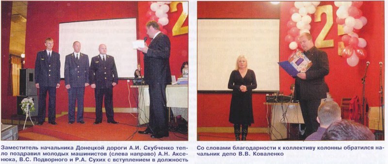 Со словами благодарности к участникам торжества обратился заместитель начальника Донецкой дороги А.И. Скубченко, который начинал свою карьеру машинистом-инструктором в этой колонне. В торжественной обстановке он вместе с начальником депо принял присягу на верность делу безопасности движения и традициям колонны от молодых машинистов А.Н. Аксенюка, B.C. Подворного, Р.А. Сухих и недавно пришедшего в коллектив помощника машиниста К.А. Поповича. Им были вручены рабочие путевки и ценные подарки. На память коллективу колонны подарили картину «Рассвет. Сила и мощь», изображающую электровоз ВЛ80Т-2063, ведущий поезд по донбасскому краю.