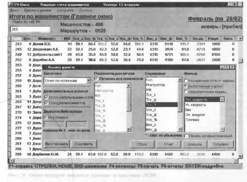 Тема: Машинисту помогает АРМ ТЧУМашинисту помогает АРМ ТЧУ Автоматизированная обработка маршрутов машинистов Маршрут машиниста (ММ) — один из важнейших документов первичного учета в локомотивном хозяйстве. На его основе разрабатывается вся оперативная и статистическая отчетность о наличии, состоянии, работе и использовании подвижного состава, расходе топлива и электроэнергии на тягу поездов. По нему рассчитывают заработную плату локомотивной бригаде за поездку. Интегрированная обработка маршрута машиниста (ИОММ) — один из наиболее многогранных и трудно автоматизируемых процессов на железнодорожном транспорте. Традиционная технология автоматизированной ИОММ, принятая на большинстве дорог, на уровне депо предусматривает лишь ввод и ограниченный контроль данных ММ. Затем эти данные по каналам связи передают в информационно-вычислительный центр (ИВЦ) дороги. Здесь их полностью обрабатывают, а затем составляют отчетные формы. Такая централизованная обработка очень громоздка, базируется на постоянном использовании выделенных каналов связи и не в полной мере удовлетворяет информационные потребности линейных предприятий. Кроме того, современные персональные компьютеры используются непроизводительно, фактически они выполняют лишь роль телетайпов. В связи с бурным развитием вычислительной техники в настоящее время перспективно внедрение автоматизированных рабочих мест (АРМ) различного профиля непосредственно в депо. Это существенно повышает оперативность, достоверность и информативность учета и отчетности о деятельности предприятия, что в конечном итоге ведет к повышению эффективности и качества управления перевозочным процессом. ![]() По заданию руководства Западно-Сибирской дороги специалисты Омского государственного университета путей сообщения (ОмГУПСа) разработали и в 1995 — 1996 гг. внедрили во всех депо автоматизированные рабочие места операторов центра оперативно-технического учета (АРМ ТЧУ). Для учета новых показателей и удовлетворения растущих информационных потребностей на всех уровнях управления оно постоянно модернизируется и дополняется. В результате плодотворного сотрудничества разработчиков и непосредственных пользователей АРМ ТЧУ сейчас в локомотивном хозяйстве Западно-Сибирской дороги действует эффективная система информационного обеспечения управления эксплуатационной работой — пока единственная на сети. АРМ ТЧУ предусматривает ввод, тщательный всесторонний контроль, таксировку и полную обработку маршрутных листов. Автоматически создается архивный банк данных для ежесуточного контроля и анализа показателей, а также для ответов на запросы операторов и руководства депо, возникающих в повседневной работе. По окончании отчетных суток в ИВЦ передается общий макет данных ММ для составления сводных отчетов по отделениям и дороге в целом. АРМ ТЧУ универсально и предусмотрено для обработки ММ любого вида: грузовых, пассажирских, маневровых, маршрутов электропоездов. Ввод ММ максимально упрощен и нагляден для оператора. Он выполняется в диалоговом режиме, наиболее вероятные значения многих параметров подставляются «по умолчанию». Для ускорения и контроля ввода данных используется рационально организованная система нормативно-справочной информации. Нормы расхода топлива и