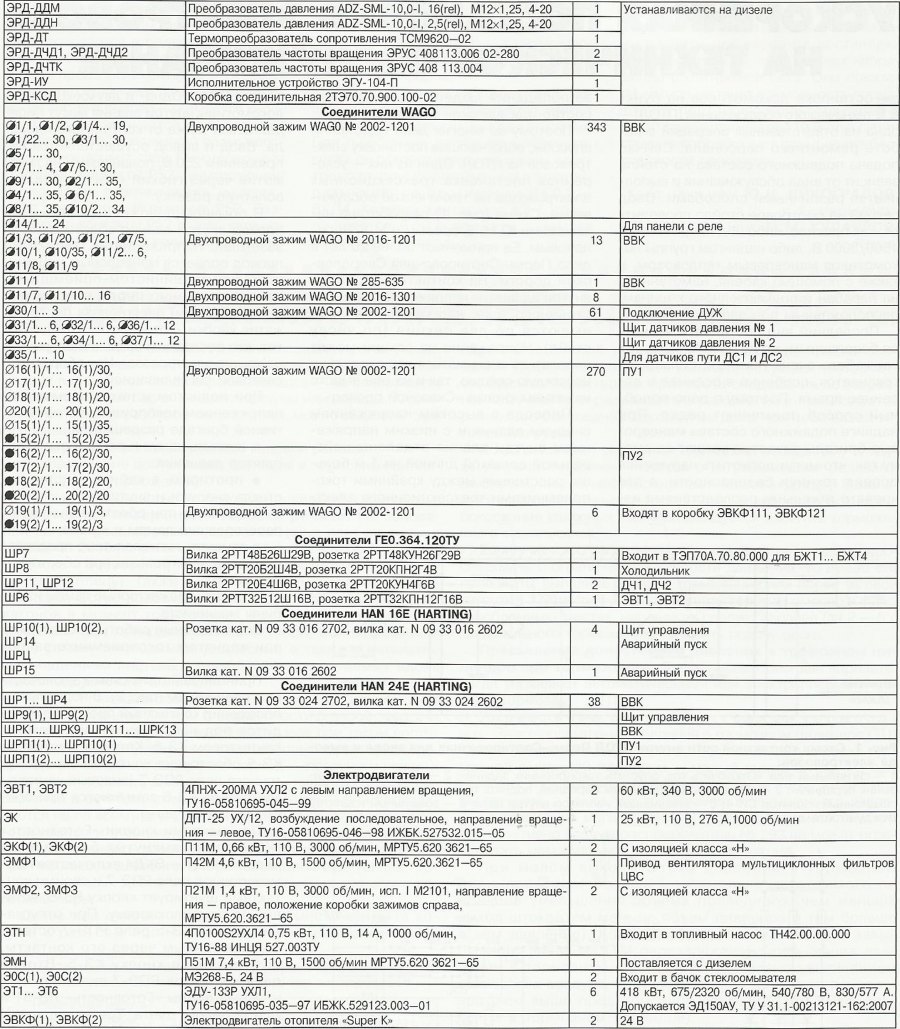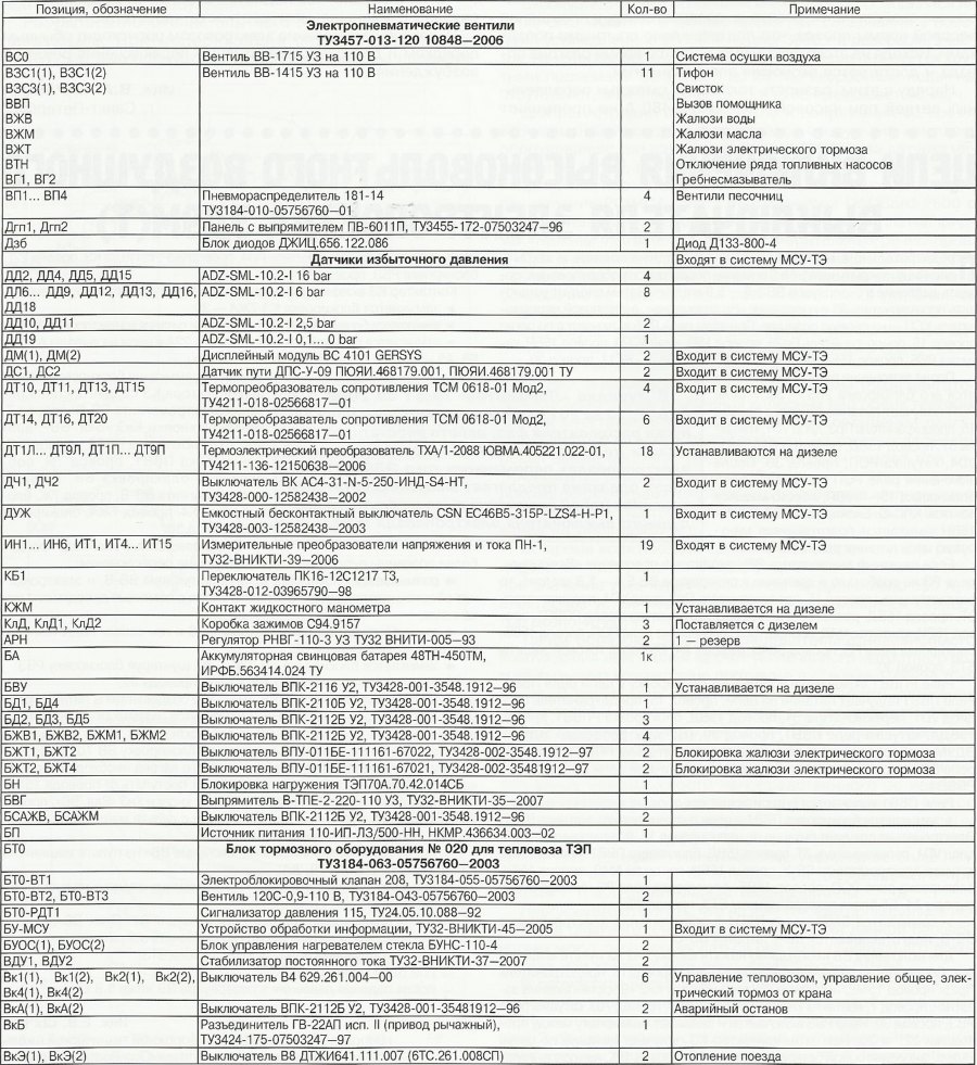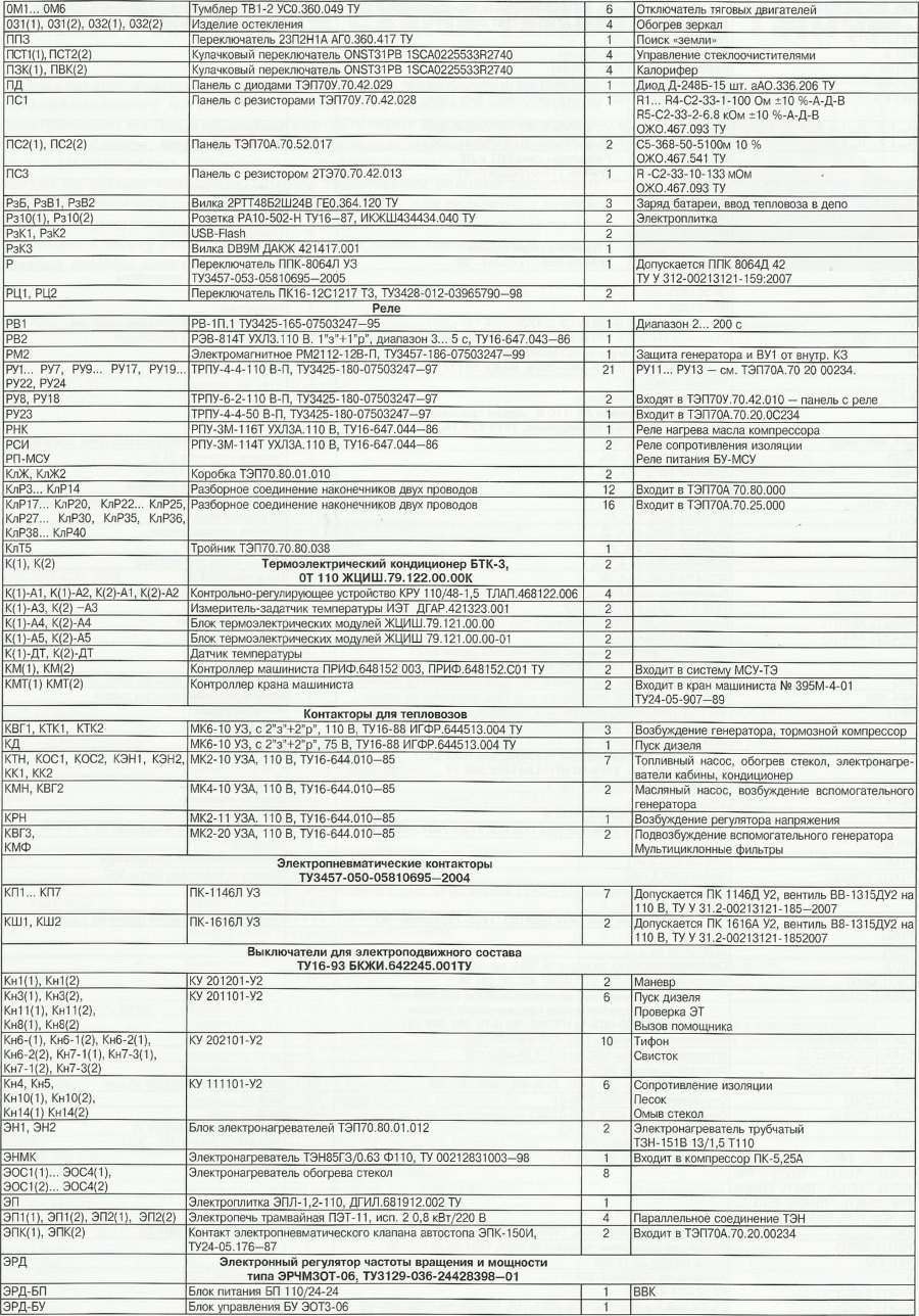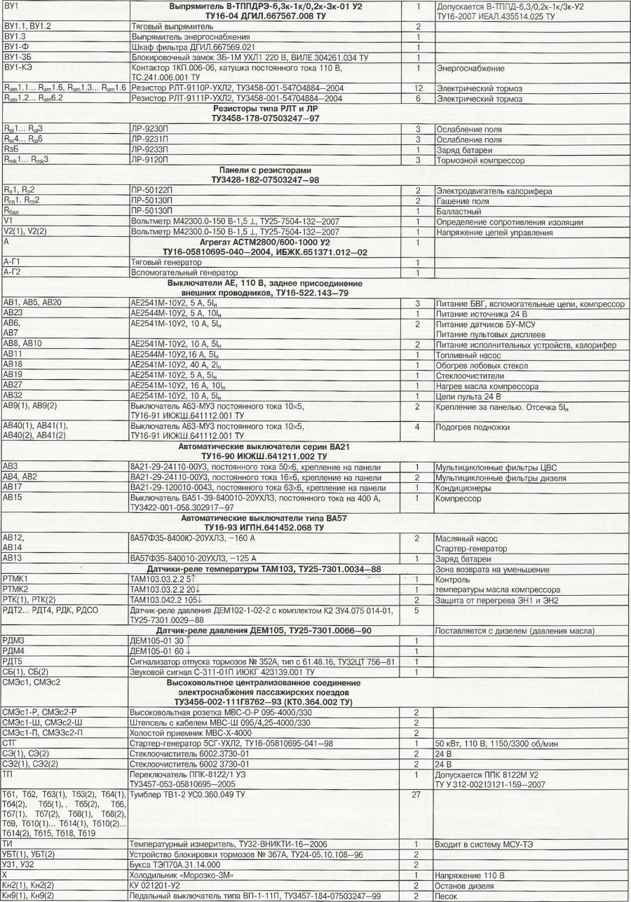 Тема: Перечень электрического оборудования тепловоза ТЭП70БСПеречень электрического оборудования тепловоза ТЭП70БС ЭЛЕКТРИЧЕСКАЯ СХЕМА ТЕПЛОВОЗА ТЭП70БС (Окончание. Начало см. «Локомотив» № 11, 2011 г.) Предлагаем вниманию читателей перечень электрооборудования, устанавливаемого на тепловозах ТЭП70БС. Условные обозначения электрических машин и аппаратов соответствуют обозначениям в электрических схемах, опубликованных на вкладках журналов «Локомотив» № 9 и 10 за этот год. Приводимые в таблицах типы изделий, их количество на секции тепловоза, номера технических условий позволяют при необходимости правильно оформить заказ для ремонтных целей. В графе «Примечание» приводятся дополнительные пояснения по назначению и месту установки аппаратов, а также параметры и допускаемые замены электрооборудования. ![]() ![]() ![]() ![]() |