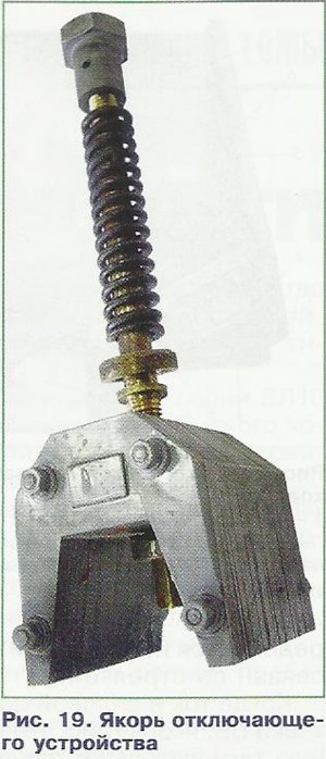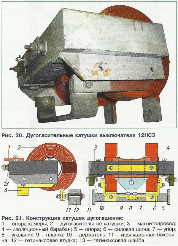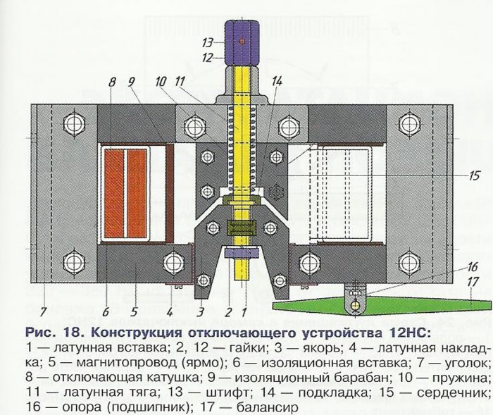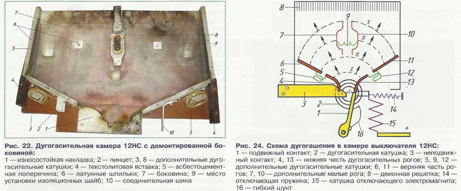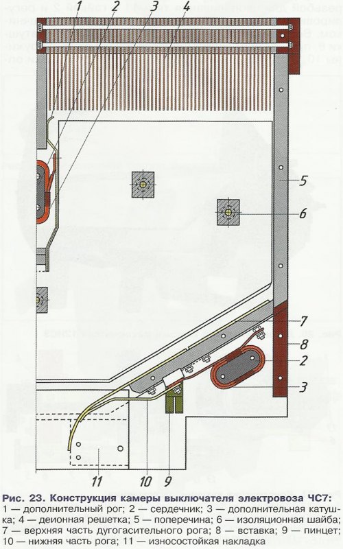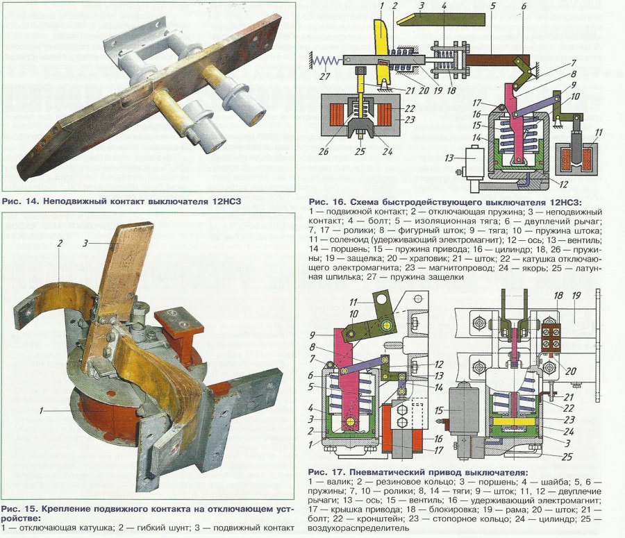 Тема: Быстродействующие выключатели электровозов серии ЧСБыстродействующие выключатели (Продолжение. Начало см. «Локомотив» N° 1 — 12, 2008 г.; № 1 — 12, 2009 г.; №1,3— 12, 2010 г.; № 1 — 5, 7 — 10, 2011 г.) БЫСТРОДЕЙСТВУЮЩИЕ ВЫКЛЮЧАТЕЛИ ЭЛЕКТРОВОЗОВ СЕРИИ ЧС Конструктивно быстродействующий выключатель (БВ) защелочного типа 12НС отличается от аппаратов, применяемых на электровозах постоянного тока тем, что большинство его деталей расположены между двумя изоляционными боковинами, закрепленными на стальной раме. Во включенном состоянии пневматический привод БВ находится под давлением сжатого воздуха. В дугогасительной камере есть вспомогательные дугогасительные катушки. Контактное устройство состоит из неподвижного и подвижного контактов. Неподвижный контакт (рис. 14) выполнен из медной шины толщиной 16 мм, к которой тремя винтами прикреплен медный контакт. Подвижный контакт вместе с гибкими шунтами может поворачиваться вокруг оси отключающего устройства (рис. 15). Согласно кинематической схеме выключателя (рис. 16) подвижный контакт 1 находится под действием отключающей пружины 2, стремящейся разомкнуть контакты 1 и 3, т.е. отключить БВ. Выключатель включается при одновременной подаче напряжения на соленоид 11 и вентиль 13. После возбуждения катушки соленоида 11 якорь опускается, и тяга 9 оттягивает шток 8 от ролика 17, прижимая его к ролику 7. Электромагнитный вентиль 13 подает сжатый воздух в цилиндр 16 под поршень 14, который, преодолевая действие пружины 15, начинает подниматься. Выступ штока упирается в ролик 7 двуплечего рычага 6 и поворачивает рычаг по часовой стрелке. ![]() При этом рычаг будет перемещать изоляционную тягу 5, защелку 19 с храповиком 20 и подвижным контактом 1 вправо, сжимая регулировочную 18 и отключающую 2 пружины. Контакты 1 и 3 замыкаются. Сила их нажатия зависит от натяжения пружины 18. усилие которой регулируют болтами 4. С поршнем и подвижной системой БВ связаны также два блокировочных устройства, состоящие из четырех пар подвижных блокировочных контактов, помещенных в корпусе. В случае выключения БВ вручную или при срабатывании блокировок аппаратов защиты (дифференциальных реле тяговых двигателей или вспомогательных машин, реле перегрузки тяговых двигателей или отопления поезда) размыкается цепь катушек вентиля 13 и удерживающего электромагнита 11. Якорь электромагнита поднимается, и тяга 9 прижимает шток 8 к ролику 17, освобождая двуплечий рычаг 6. За счет усилия пружины 2 вся подвижная система с контактом 1 отбрасывается в отключенное положение. Воздух из цилиндра 16 выходит через вентиль 13, и под действием пружины 15 поршень сдвигается в нижнее положение. Несмотря на медленное перемещение поршня со штоком, силовые контакты размыкаются быстро благодаря разъединению подвижной системы контактов и пневматического привода. При включении подвижная система приходит в движение за счет пневматического привода БВ (рис. 17). Он закреплен на двух консолях рамы 19 между изоляционными стенками выключателя. Конструктивно привод представляет собой чугунный цилиндр 24 с внутренним диаметром 90 мм, закрытый снизу крышкой 17, имеющей канал для подвода и отвода сжатого воздуха. В цилиндре размещен поршень 3 с канавкой, в которую заложено уплотняющее резиновое кольцо 2. На поршень 3 через стальную шайбу 4 постоянно давит пружина 6, стремящаяся возвратить