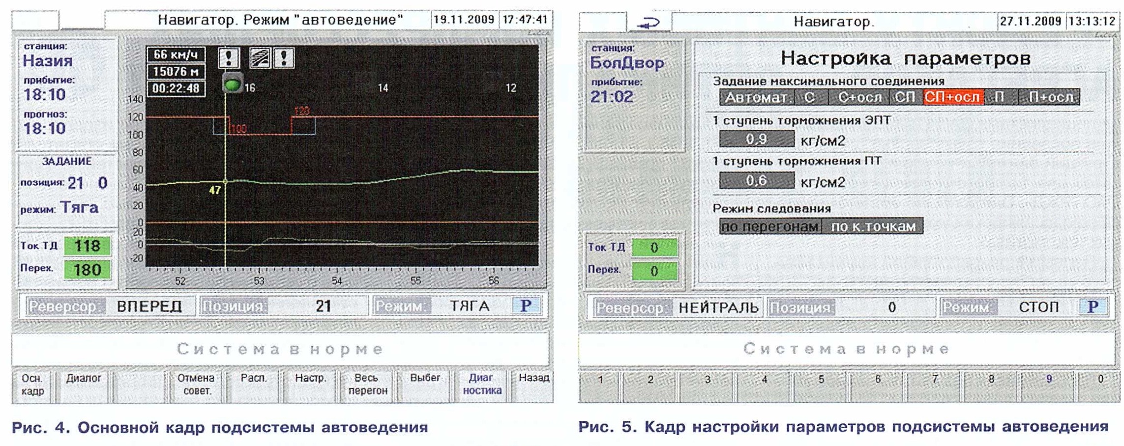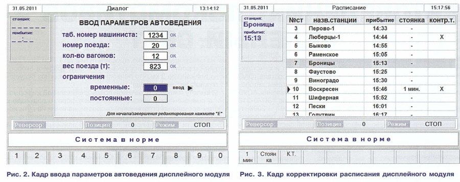 Тема: [07-2012] Автоведению локомотивов - зеленый светАвтоведению локомотивов - зеленый свет Принципы, лежащие в основе современных разработок систем автоведения Научно-исследовательского и конструкторско-технологического института подвижного состава (ОАО «ВНИКТИ»), были опробованы при создании системы автоведения на базе микропроцессорных систем управления АСУБ «Локомотив» в 1998 — 2000 гг. и МСУД на тепловозе ТЭП70-316 (приписки депо Санкт-Петербург-Витебский) в 2007 — 2008 гг. Дальнейшее развитие эти принципы получили благодаря разработке и внедрению микропроцессорной системы управления и диагностики (МСУ-ЭП) с функцией автоведения на электровоз ЭП2К № 030 (приписки депо Санкт-Петербург-Пассажирский-Московский) в 2009 г., где он эксплуатируется по настоящее время. Структурная схема подсистемы автоведения приведена на рис. 1. Данная подсистема реализована на базе системы МСУ-ЭП, в состав которой входят: ♦ устройство обработки информации (УОИ); ♦ дисплейный модуль первой и второй кабин (ДМ1 и ДМ2); ♦ комплект датчиков и кабелей связи; ♦ модем GSM/GPRS; ♦ антенна; ♦ энергонезависимое запоминающее устройство (flash-диск); ♦ звуковая система. При ее работе используются связи УОИ по CAN-интерфей-сам со следующими устройствами: О системой КЛУБ-У через блок ШЛЮЗ-CAN; О САУТ-ЦМ через блок ШЛЮЗ-CAN; 3 краном машиниста № 130 (УКТОЛ). Текущая координата пути, допустимая скорость движения и сигналы АЛСН принимаются от системы безопасности КЛУБ-У. Чтобы управлять режимами тяги и электрического торможения, используется аппаратура МСУ-ЭП. Управление пневматическим и электропневматическим тормозами осуществляется дистанционно через кран машиниста № 130. Подсистема автоведения обеспечивает: 0 автоматическое управление режимами тяги, электродинамического, электропневматического и пневматического торможения; 0 соблюдение постоянных и временных ограничений скорости, а также ограничений, накладываемых показаниями локомотивного светофора; 0 соблюдение расписания с точностью ±30 с. Есть два режима исполнения расписания: с соблюдением времени прохождения всех обязательных контрольных точек пути или контрольных точек, заданных машинистом. Происходит автоматический переход в режим нагона времени в случае отставания от графика движения; 0 автоматическое включение и отключение режима движения «по удалению» с возможностью его отмены машинистом; 0 расчет траектории движения поезда с учетом минимизации расхода электроэнергии; 0 автоматический (со специально подготовленного съемного носителя) или ручной (машинистом) ввод в диалоге информации о номере поезда, количестве вагонов, весе поезда, составе временных ограничений скорости; 0 отображение необходимой для машиниста информации (текущая и расчетная скорости, расположение светофоров, препятствий, постоянные и временные ограничения скорости, расположение станций, графиковое и прогнозируемое время прибытия на следующую станцию, профиль пути и др.). При этом расчетная скорость поезда показывается в виде графика скорости на ближайшие 5 км, что позволяет сделать прогноз будущего режима ведения поезда; 0 выдачу машинисту речевой предупредительной информации о смене сигнала локомотивного светофора, о подъезде к местам временных ограничений скорости, наличии на пути искусственных сооружений (переездов, мостов, пере