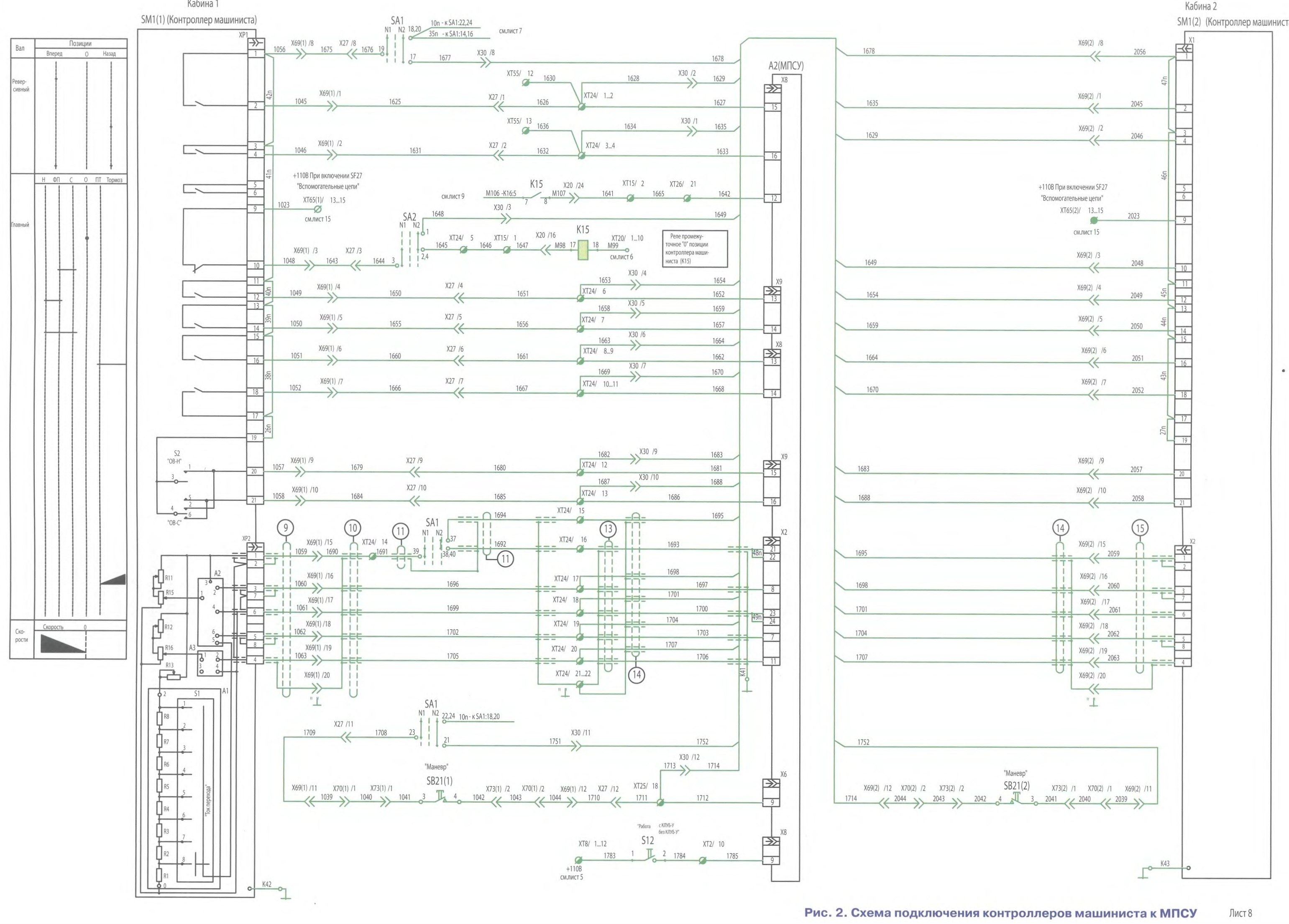 Тема: [06-2013] Электрические схемы электровоза ЭП2КЭлектрические схемы электровоза ЭП2К Принципиальная электрическая схема электровоза ЭП2К (ЭП2К.70.00.003-01ЭЗ) включает в себя следующие цепи: силовые энергоснабжения поезда, вспомогательные (собственных нужд) и управления локомотивом. Цепи управления выполнены в двухпроводном исполнении, при котором минусовые провода не связаны с корпусом электровоза. Цепи управления содержат микропроцессорную систему управления (МПСУ), органы управления, промежуточные реле, датчики тока и напряжения, датчики давления и др. Подъем и опускание токоприемников, включение и отключение быстродействующего выключателя, вентиляторов, компрессора, выбор режима управления электровозом, задание скорости, тока, управление движением при ручном управлении осуществляются машинистом при помощи органов управления. Исполнительные аппараты включаются блоками управления А2 и АЗ микропроцессорной системы управления МПСУ, куда поступают сигналы от установленных на электровозе датчиков, органов управления, вспомогательных контактов коммутационной аппаратуры. Полученная информация обрабатывается МПСУ в соответствии с заложенной программой, реализующей алгоритм управления электровозом. При этом обеспечивается выполнение следующих функций: - подъем и опускание токоприемника; - управление быстродействующим выключателем от МПСУ, а при его отказе — в ручном режиме; - управление силовыми контакторами (реостатными, линейными и ослабления поля), реверсорами и тормозными переключателями, обеспечивающими работу электровоза в режиме тяги и электрического торможения; - управление электровозом в режиме автоведения; - обеспечение работоспособности электровоза при отключении двигателей в случае неисправности одного из них; - управление статическими преобразователями 3000/380 В; - автоматическое переключение нагрузок с одного преобразователя собственных нужд ПСН на другой в случае неисправности одного из них; - управление двигателем компрессора по заданному алгоритму; У обнаружение и устранение боксования или юза колесных пар; - управление электрическим торможением в служебном, остановочном, экстренном и аварийном режимах; У отображение служебной и диагностической информации на дисплейном модуле пульта управления в реальном масштабе времени; - выдача предупредительных и аварийных сообщений на дисплейном модуле с указанием неисправных или отказавших элементов электрической схемы. Кроме основной схемы локомотива, имеются отдельные схемы электропневматического тормоза, пожаротушения, устройства безопасности движения КЛУБ-У, системы автоматического управления торможением САУТ и освещения. СХЕМА СИЛОВЫХ ЦЕПЕЙ С НАПРЯЖЕНИЕМ ПИТАНИЯ 3 КВ Цепи ввода напряжения 3 кВ (см. «Локомотив» № 3, 2013 г., лист 1 на цветной вкладке с электрическими схемами). Напряжение контактной сети подается на электровоз через токоприемники ХА1-А1, ХА2-А1, дроссели помехоподавления L1 или L2, разъединители QS1 или QS2 и быстродействующий выключатель QF1. Фильтр, состоящий из дросселя L1 и конденсатора С1 или L2 и С2, служат для защиты от радиопомех, конденсатор СЗ исключает проникновение радиопомех от внутреннего электрооборудования в контактную сеть. Разъединители QS1 и QS2 предназначены для отключения соответствующего неисправного токоприемника. Р