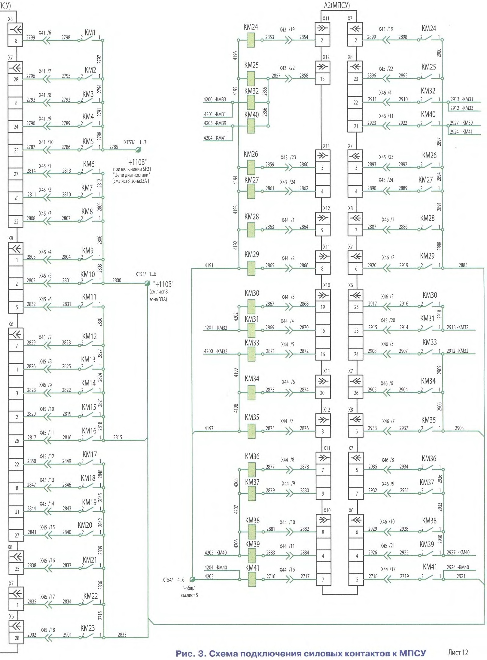ЦЕПИ УПРАВЛЕНИЯ БЫСТРОДЕЙСТВУЮЩИМ ВЫКЛЮЧАТЕЛЕМ Для включения быстродействующего выключателя QF1 необходимо (см. «Локомотив» № 3, 2013 г., лист 6 на цветной вкладке с электрическими схемами) включить выключатели SF13 «Аппараты защиты», «БВ» блока выключателей S1 на первом или втором пульте машиниста. При этом включаются реле К31, К32. После включения реле К31 его контакт между проводами 801 и 892 подготавливает цепь включения быстродействующего выключателя QF1, контакт в цепи проводов 957, 893 — цепи удержания катушки реле КА2, 970 и 971 подает сигнал о включении на МПСУ, блок АЗ. Быстродействующий выключатель включается вручную после кратковременного нажатия выключателя «Возврат защиты» блока выключателей S1. Последующее удержание выключателя (и при необходимости — его отключение) осуществляется от блока АЗ. При работе МПСУ от контакта 9/4 АЗ получает питание катушка реле КЗЗ, подготавливающее цепи управления выключателем QF1. В случае кратковременного включения выключателя «Возврат защиты» блока выключателей S1 включается контактор КМ 126. Своими силовыми контактами он включает реле дифференциальной защиты КА2, а вспомогательным контактом между проводами 973 и 974 подает сигнал в блок АЗ о восстановлении защиты силовых цепей электровоза. Контакт КА2 между проводами 949 и 950 разрывает цепь катушки К32, и реле отключается. Через замыкающие вспомогательные контакты контактора КМ126, контакты реле КЗ, К15 получает питание катушка контактора КМ131. Через автоматический выключатель SF82, контакты контактора КМ131, контакты реле К31, К32 запиты-вается катушка быстродействующего выключателя QF1. Контакты реле КЗ не допускают включение выключателя QF1 при открытых дверях преобразователя U1, панели с блоком измерения А41-АЗ (выключатель SQ9), панели закрытия быстродействующего выключателя, в положении «Заземлено» высоковольтного заземлителя QS3, при нахождении разъединителей QS5, QS6, выключателя SF5 в положениях «Включено». Контакты реле К15 обеспечивают включение QF1 только на нулевой позиции контроллера машиниста. После отпускания выключателя «Возврат защиты» контакторы КМ 126 и КМ 131 отключаются, и в цепь катушки КА2 вводится токоограничивающий резистор. Напряжение на катушку QF1 поступает через балластные резисторы панели R31. При этом ток в цепи катушки уменьшается. Питание на катушку QF1 подается по цепи: контакт 9/3 блока АЗ, провод 896, контакт реле КЗЗ, провода 798, 774, резисторы панели R31, провода 775, 840, 801, контакты реле К31, К32, катушка QF1. При снятии питания с катушки QF1 быстродействующий выключатель отключается, снимая напряжение 3 кВ с силовых цепей. Контакты реле К32 в цепи QF1 предназначены отключать выключатель QF1 при коротких замыканиях в цепях питания тяговых двигателей М1 — Мб, при которых отключается реле КА2 и включается реле К32. Контакты реле К31 предназначены для отключения выключателя QF1 при выключении выключателя «БВ» блока выключателей S1 или при нажатии кнопки SB7 «Аварийное отключение БВ», контакты реле КЗ служат для отключения выключателя QF1 при отключении токоприемника. Контакты реле КЗЗ предназначены для управления выключателем с помощью МПСУ. Сигнал о включении реле КЗЗ и выключателя QF1 подается в блок АЗ, соответственно, через замыкающие контакты реле и выключателя. Если быстродействующий выключатель не включается или отключается, на блоке индикации А9(1) или 9(2)