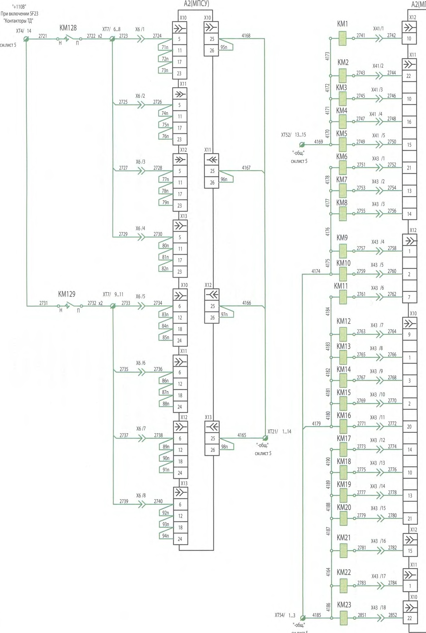 Преобразователи собственных нужд (см. рисунок, лист 3 заводской схемы). Преобразователи собственных нужд А5 и А6 типа ПСН100/ЗУ2 предназначены для преобразования напряжения контактной сети постоянного тока 3000 В в трехфазное напряжение переменного тока 380 В, 50 Гц по трем независимым гальванически развязанным каналам. В состав каждого преобразователя входят: - высоковольтный понижающий преобразователь (ВПП), состоящий из шести последовательно соединенных модулей входного преобразователя (МВП), обеспечивающих преобразование напряжения 3000 В в промежуточное напряжение с уровнем 620 В с гальванической развязкой от входной сети; - инверторы напряжения АИН 1, АИН2, АИНЗ, обеспечивающие преобразование напряжения 620 В в трехфазное напряжение (при этом на выходе АИН1 выводится напряжение 380 В, 50 Гц, а на входах АИН2 и АИНЗ регулируемое напряжение изменяется по закону U/f = const с пропорциональным изменением напряжения от 0 до 380 В и частоты от 0 до 50 Гц); - система управления. Преобразователи А5 и А6 включены до быстродействующего выключателя OF1. На преобразователь А5 «плюс» 3000 В поступает по цепи: проходной изолятор ХВ 1, шина 13Ш, провод 81, предохранитель FU1, диоды модуля А20, провод 438, шина 441Ш, провод 444, предохранитель FU2, провода 445, 448, зажим XN4. «Минус» 3000 В поступает по цепи: шунт RS3, датчик UA10, провод 450, зажим XN2 («земля»). Наличие входного напряжения 3000 В на преобразователе фиксируется датчиком высокого напряжения, входящим в состав преобразователя. Питание 110 В на преобразователи подается при включении автоматических выключателей SF1 «ПСН1» и SF2 «ПСН2», расположенных на блоке БАУ. Преобразователи включают выключателем «Преобразователи» блока S1, расположенного на пульте машиниста. При температуре окружающей среды выше минус 40 °С, определяемой системой температурного контроля (термоблоком А15). Преобразователи А5 и А6 включают контакторы КМ81 и КМ84. После включения контакторов напряжение 3000 В через резисторы заряда R 10 и R 19 поступает на зажимы XN 1 преобразователей. Начинается заряд конденсаторов, расположенных в модулях входных преобразователей. По мере заряда появляется напряжение на промежуточной шине преобразователя. По окончании процесса заряда контакторы КМ82 и КМ83 включаются, а КМ81 и КМ84 — отключаются. Модули МВП подключены к промежуточным шинам, от которых питаются автономные инверторы напряжения АИН 1 — АИНЗ. При появлении напряжения на промежуточной шине инверторы вырабатывают трехфазное напряжение 380 В, которое через синусоидальные фильтры выводится на зажимы 1U5, 1V5, 1W5 (АИН 1), 2U5, 2V5, 2W5 (АИН2) и 3U5, 3V5, 3W5 (АИНЗ) преобразователей А5, А6. От блока МПСУ (АЗ) на входные зажимы ХМ1:5 — ХМ 1:14 ПСН А5 и А6 поступают кодовые управляющие сигналы, обеспечивающие регулирование напряжения на инверторах. При температуре окружающей среды ниже минус 40 °С преобразователи включают контакторы КМ80 и КМ85, которые подают напряжение 3000 В на резисторы R2 — R5 для прогрева преобразователя. После того, как температура на радиаторах IGBT транзисторов станет выше минус 40 °С, система температурного контроля дает разрешение на включение ПСН по обычному алгоритму. Цепи потребителей собственных нужд (см. листы 3, 4 заводской схемы). К зажимам 1U5, 1V5, 1W5 (АИН1) пре- образователя А5 через контактор КМ.103, автоматический выключатель SF4 «Шкаф питания», контактор КМ 105.1. провода 5105, 5205, 5305 подключен ист