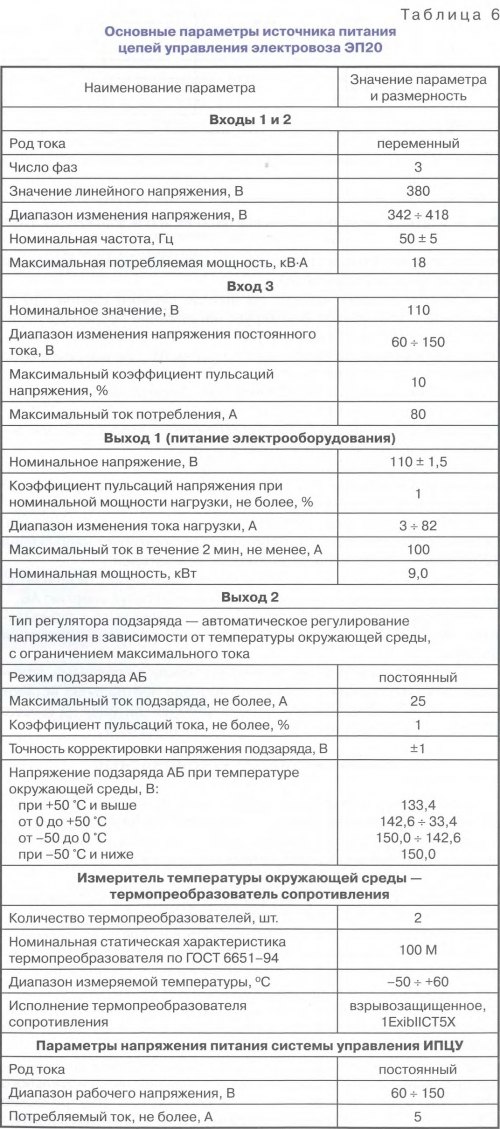 Тема: [06-2013] Знакомьтесь: электровоз ЭП20Знакомьтесь: электровоз ЭП20 (Окончание. Начало см. «Локомотив» № 4, 5, 2013 г.) ИСТОЧНИК ПИТАНИЯ ЦЕПЕЙ УПРАВЛЕНИЯ Источник питания цепей управления электровоза ЭП20 типа ИПЦУ-ЭП20 380/110 ЗУ МАУВ.436628.004 предназначен для питания нагрузок бортовой сети локомотива стабилизированным напряжением 110 В постоянного тока и подзаряда его аккумуляторной батареи (АБ) 92KL125P с автоматическим регулированием напряжения на ней в зависимости от температуры окружающего воздуха в отсеке АБ. ИПЦУ выполнен с высоким качеством выходного напряжения. Важность этого показателя трудно переоценить: ведь большое количество примененных электронных устройств требуют, в первую очередь, высокого качества питания, характеризующегося низкими пульсациями питающего (выходного) напряжения и его стабильным действующим значением постоянного тока 110 В. Мощность источника питания выбрана исходя из большого числа примененных на электровозе электронных систем контроля, защиты и обеспечения безопасности движения. Конструкция ИПЦУ выполнена в виде шкафа, который устанавливается внутри электровоза. Он имеет две двери, обеспечивающие доступ к силовым модулям и блоку управления ИПЦУ. Двери снабжены механическими замками, предотвращающими несанкционированный доступ в шкаф, и блокировочными устройствами. Эти устройства при открывании дверей обеспечивают отключение ИПЦУ и снятие напряжения 380 В с силовых модулей ИПЦУ путем размыкания входных контакторов. С лицевой стороны в верхней части шкафа располагаются передняя панель и панель индикации ИПЦУ. Они предназначены для размещения органов управления и отображения информации о текущем состоянии аппаратуры ИПЦУ, подключения АБ и внешнего источника постоянного тока к источнику питания. Основные параметры ИПЦУ приведены в табл. 6. ![]() ИПЦУ имеет следующие режимы работы: - основной — в данном режиме ИПЦУ-ЭП20 формирует напряжение 110В для питания нагрузки и заряда АБ; - технического обслуживания — в этом режиме осуществляются питание нагрузки и подзаряд АБ от внешнего источника, расположенного в депо, и ИПЦУ в данном режиме не функционирует; © питания нагрузок от АБ. ИПЦУ в этом режиме отключен. Структурная электрическая схема ИПЦУ представлена на рис. 9. ИПЦУ имеет высокую степень внутреннего резервирования цепей, при этом обеспечиваются следующие режимы внутреннего резервирования. - Нормальный режим. Первый канал обеспечивает питание цепей 110 В (75 А), второй — заряд батареи (25 А). Напряжение в звене постоянного напряжения второго канала меняется в зависимости от температуры. Суммарное потребление по двум входам 380 В в штатном режиме составляет приблизительно 14 кВА. - Режим проезда нейтральной вставки. При отсутствии напряжения 380 В выходной стабилизатор поддерживает напряжение на выходе, равное 110В, используя энергию АБ. - Авария первого канала. Выходной стабилизатор поддерживает 110 В от второго канала. Ток заряда батареи ограничен мощностью второго канала (1 кВт идет на заряд АБ при максимальной нагрузке в цепях управления). - Авария второго канала. На выходе первого канала 110 В. Выходной стабилизатор формирует напряжение подзаряда батареи в зависимости от температуры с учетом ограничения по мощности первого канала (1 кВт идет на заряд АБ при максимальной нагрузке в цепях управления).