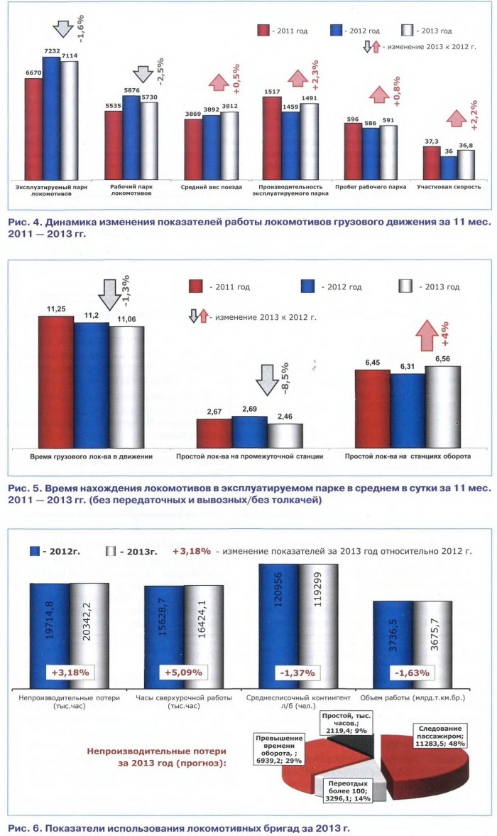 Тема: [02-2014] Локомотивному комплексу - четкие перспективыЛокомотивному комплексу - четкие перспективы В конце декабря 2013 г. в Москве прошло расширенное итоговое заседание Правления ОАО «РЖД». С докладом о работе локомотивного комплекса выступил вице-президент ОАО «РЖД» А.В. ВОРОТИЛКИН. Знакомим читателей с основными положениями его доклада. Подводя итоги работы за 2013 г., докладчик отметил, что в локомотивном комплексе реализуется завершающий этап реформирования, определенный его целевым состоянием. Принятые за последние три года и воплощаемые решения уже в 2013 г. позволили получить реальные системные положительные результаты. Благодаря поддержке со стороны Компании, на выделяемые целевые финансовые средства смогли организовать восстановление длительно простаивавших в неисправном или разукомплектованном состоянии локомотивов, наполнить запасными частями склады. В случае, когда площади складов перестают удовлетворять нуждам депо, перевозка склада в других помещения позволит оперативно увеличить как площадь складов, так и их качество. А это, как результат, позволило снизить время простоя практически на всех плановых видах ремонта, оперативно обеспечить потребность локомотивной тягой при изменении технологии и объема перевозок в границах полигонов. Реализуя в локомотивном комплексе мероприятия, направленные на повышение надежности парка, количество собы тий, связанных с нарушением безопасности движения, снижено на 8,7 % (рис. 1). Выполнена задача, установленная протоколом итогового заседания Правления по снижению количества отказов 1 -й и 2-й категорий не менее, чем на 5 %. Так, в целом по локомотивному комплексу отказы 1-й и 2-й категорий снижены на 11 %, а количество всех отказов с учетом 3-й категории уменьшились на 16,8 % (рис. 2). Снижено на 8,6 % и количество задержанных поездов. Понимая, что локомотивный комплекс — это большая затратная часть производственного блока, каждый раз обращаясь к Компании за выделением денежных средств, руководствовались двумя целями. Это не только увеличение количества эксплуатируемого парка локомотивов и локомотивных бригад, но и, прежде всего, — оптимизация издержек за счет технологии и качества. Выделенные финансовые средства, в том числе дополнительные, позволили закупить 804 новых локомотива с улучшенными характеристиками (рис. 3). Кроме того, разработанная и реализованная комплексная программа организационно-технологических мероприятий, направленных на повышение эффективности деятельности локомотивной отрасли, обеспечила сокращение расходов по основной деятельности: - в Дирекции тяги — на сумму 10,5 млрд, руб., или 101 % к заданию, в том числе за счет вывода в запас ОАО «РЖД» 2734 локомотива; - в Дирекции по ремонту тягового подвижного состава — на сумму 3,9 млрд, руб., или 103,7 %. Указанные сокращения, в свою очередь, позволили в 2013 г. увеличить к уровню прошлого года среднесуточную производительность локомотива на 1,6 %, средний вес поезда на 0,5 %, участковую скорость на 2,8 % (рис. 4). Производительность труда на перевозках выполнена на 100,2 %. Достигнута значительная экономия топливно-энергетических ресурсов на тягу поездов в размере 793 млн. руб. Поставка новых локомотивов, наряду с экономией расходов за счет улучшенных характеристик, позволила поэтапно высвобождать и передислоцировать эксплуатируемый