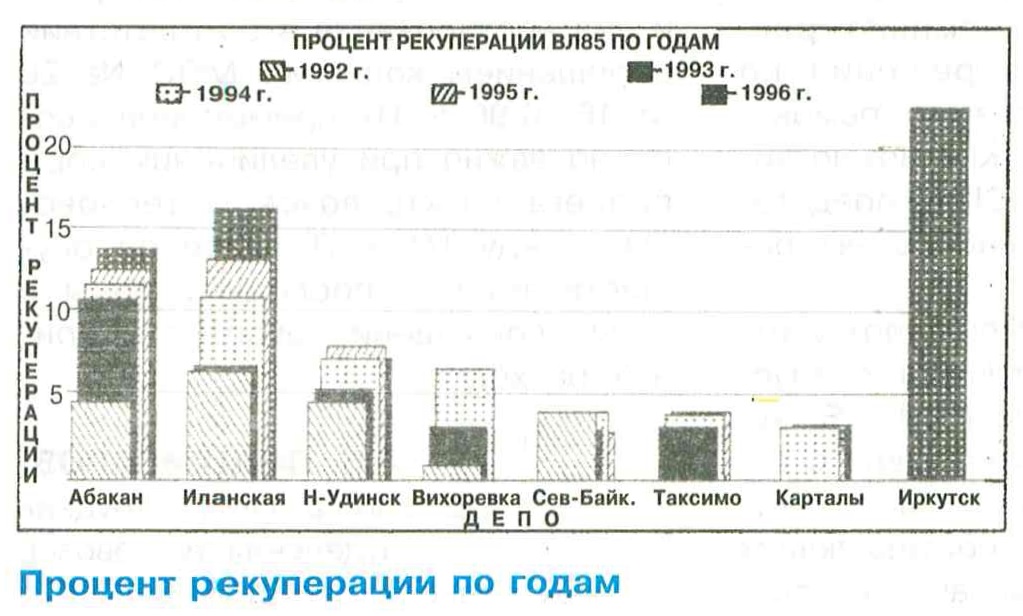 Тема: [12-1997] Дороги Восточной Сибири расширяют использование рекуперацииДороги Восточной Сибири расширяют использование рекуперации В планах развития российских железных дорог предусмотрена электрификация дорог в основном на переменном токе. Такая система электрической тяги имеет очевидные преимущества электроснабжения. Плавное регулирование напряжения на зажимах электродвигателей в режимах тяги и рекуперативного торможения улучшает тяговые свойства локомотивов. Это одно из основных преимуществ электропод-вижного состава переменного тока. В настоящее время в России — более 600 электровозов переменного тока с тиристорными преобразовательными установками, оборудованных устройствами рекуперативного торможения: ВЛ85 — около 270 ед., ВЛ80Р — 360 и ВЛ65 — 25. Этими электровозами в целом на тягу поездов расходуется примерно 1,5 млрд. кВт ч электроэнергии в год. Рекуперация — главное средство экономии энергии. Каждый процент сэкономленной энергии в год составляет 15 млн. кВт-ч. Такого количества электричества хватило бы на электроснабжение в течение года 12500 квартир (около 40 тысяч жителей) в расчете расхода по 80 — 120 кВт-ч на семью ежемесячно. Рекуперативное торможение в зависимости от профиля пути и организации движения поездов может обеспечить возврат до 25 % энергии, расходуемой на тягу. Отсюда видна эффективность рекуперации и необходимость расширения ее использования. Совместно со специалистами депо в 1991 — 1992 гг. были выявлены причины неполного использования рекуперативного торможения в депо Абакан, Иланская, Северобай-кальск, Вихоревка, Нижнеудинск. На основе результатов анализа полученных материалов были разработаны «Инструктивные указания по расширению применения рекуперативного торможения на электровозах переменного тока ВЛ80Р, ВЛ85, и ВЛ65», которые после утверждения ЦТ МПС разосланы по дорогам. Использование рекомендаций Инструктивных указаний не требует дополнительных затрат ни на модернизацию каких-либо устройств, ни на проведение организационных мероприятий, ни на дополнительное обслуживание электровозов. Поэтому результаты их внедрения не замедлили сказаться. Как обычно, начали расширять использование рекуперации на Красноярской дороге, которая по существу является первой электрифицированной на переменном токе и всегда активно совершенствовала устройства и эксплуатацию подвижного состава переменного тока. Улучшение показателей работы локомотивов в режиме рекуперации началось с 1993 г. в депо Абакан и Иланская, а затем на Восточно-Сибирской дороге. Эффективность использования рекуперативного торможения количественно оценивается отношением возвращенной электроэнергии при рекуперации к энергии, израсходованной на тягу, — процентом рекуперации. Особенно заметно средние ежемесячные и годовые проценты рекуперации стали увеличиваться на электровозах депо Иланская (в 1995 г. до 12,8 % и в 1996 г. до 15 %), в депо Абакан (в 1995 г. до 12,2 и в 1996 г. до 12 - 14 %, см. рис. 1). В мае 1996 г. на электровозах ВЛ85 депо Иланская средний возврат энергии при рекуперации достиг 18,1 %. В экспериментальной поездке 23.08.96 г. электровоза ВЛ85-155 с поездом массой 3500 т. электронный измерительновычислительный комплекс зафиксировал расход на тягу 3595 + 3611 = 7206 кВт-ч и возврат при рекуперации 956 + 925 = 1881 кВт-ч, что составило 26% от энергии, затраченной на тя