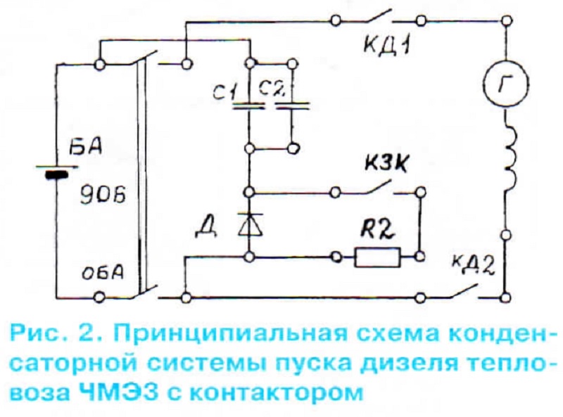 Тема: [12-1999] Повышение надёжности конденсаторной системы пуска дизеля тепловоза ЧМЭЗПовышение надёжности конденсаторной системы пуска дизеля тепловоза ЧМЭЗ К настоящему времени большое число тепловозов ЧМЭЗ оборудованы конденсаторными системами пуска дизеля. Принципиальная схема такой системы представлена на рис. 1. ![]() Для пуска дизеля машинист нажимает на кнопку КНПД1. При этом замыкание контактов дополнительной коммутационной секции К вызывает открытие тиристора Т, после чего начинается заряд конденсаторов С1 и С2. Ток заряда протекает по цепи: “плюс” БА, конденсаторы С1 и С2, открытый тиристор Т, резистор R2, контакты отключателя аккумуляторной батареи ОБА, “минус” БА. После окончания прокачки масла замыкаются контакты пускового контактора КД2 (контакты КД1 замкнулись в момент начала прокачки), и ток начинает протекать к тяговому генератору Г от БА и заряженных конденсаторов. В результате максимальное пиковое значение тока, отдаваемого аккумуляторной батареей, уменьшается в 1,5 — 2,5 раза, причем чем хуже техническое состояние батареи, тем больше отношение тока, отдаваемого конденсаторами, к току, отдаваемому батареей. Необходимо отметить, что при использовании конденсаторов максимальное значение тока, протекающего по обмоткам якоря и возбуждения тягового генератора в период пуска дизеля, изменяется от 2400 — 2500 А (хорошее техническое состояние батареи) до 1800 — 1700 А (предельно плохое состояние батареи, когда без конденсаторов пуск дизеля невозможен). Уменьшение максимальных токовых нагрузок на аккумуляторную батарею способствует увеличению срока ее службы. Кроме того, наличие конденсаторов обеспечивает пуск дизеля при уменьшении емкости аккумуляторной батареи вплоть до 20 % ее номинального значения. Во время контрольных проверок находящихся в эксплуатации конденсаторных систем пуска дизеля сотрудники ВНИИЖТа неоднократно выявляли случаи заряда конденсаторов при работающем дизеле. Это недопустимо, так как напряжение на зажимах аккумуляторной батареи в это время может превышать номинальное напряжение конденсаторов. Длительное же нахождение конденсаторов в заряженном состоянии с напряжением, даже равным номинальному, резко уменьшает срок службы и может способствовать выходу их из строя. Заряд конденсаторов при работающем дизеле происходит вследствие произвольного открытия тиристора Т. Это, в свою очередь, может произойти при случайном нажатии на кнопку КНПД1 или быть результатом воздействия электромагнитных процессов, происходящих при коммутации силовых контактов тепловоза, на цепь управления тиристора Т. На техническом совещании, состоявшемся в депо Новороссийск в 1997 г., на котором обсуждались результаты эксплуатации конденсаторных систем пуска дизеля на тепловозах ЧМЗЗ, было предложено заменить тиристор контактором. Схема конденсаторной системы пуска дизеля, разработанная сотрудниками ВНИИЖТа в соответствии с упомянутым предложением, представлена на рис. 2. ![]() Один вывод катушки контактора КЗК подключается к размыкающему контактору КМН1 с проводом 255 контактора КМН тепловоза, второй — к проводам 105 (рис. 3). ![]() - начинается заряд конденсаторов С1 и С2 от БА через резистор R2 (см. рис. 2); - через замкнувшиеся контакты КД12 получает питание катушка контактора КМН и начинается предпусковая прокачка масл