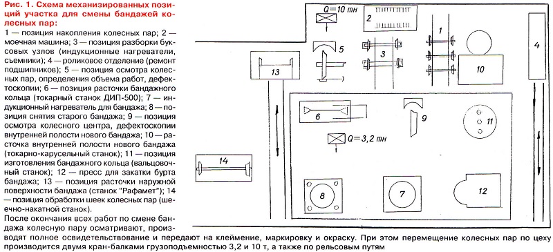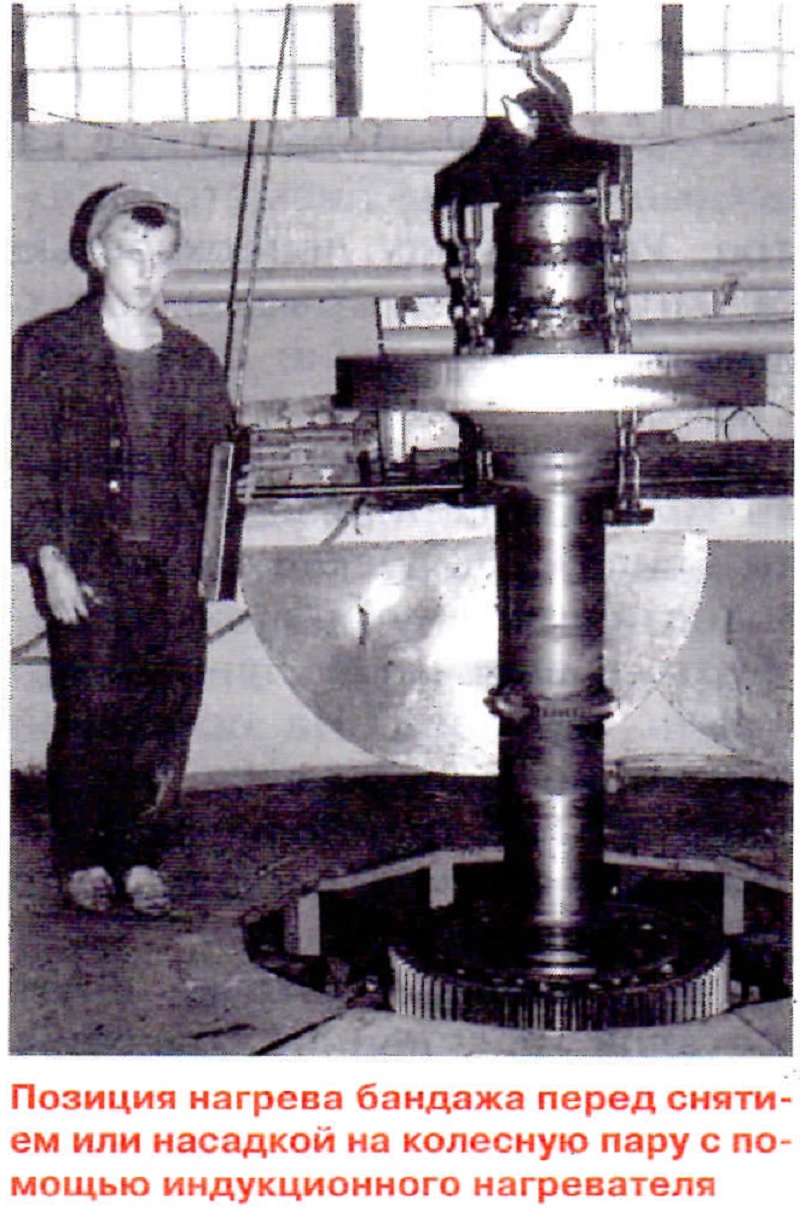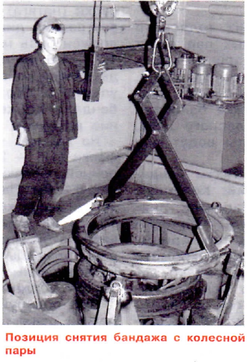 Тема: [10-1999] Рациональная организация перетяжки бондажейРациональная организация перетяжки бондажей Опыт депо Сызрань. ![]() Комплекс мероприятий, связанных с Созданием отделения перетяжки бандажей колесных пар, начали осуществлять в 1993 г. Работы возглавил главный инженер Д.П. Шошин. При содействии службы локомотивного хозяйства Куйбышевской дороги в депо были поставлены карусельный станок 1Е516ПФ2Н для расточки внутренней полости бандажа, токарный станок ДИП-500 для вырезки бандажного кольца, пресс для закатки буртов бандажа ПБ-7730, дефектоскопы для магнитного и ультразвукового контроля. Специалисты НПП “Транспорт” помогли приобрести приборы контроля температуры нагрева бандажей, а также необходимый перечень измерительных, поверочных инструментов и приборов. Поступающее оборудование размещали по тщательно продуманной схеме (рис. 1). ![]() Технология работ в колесном цехе депо Сызрань, созданная с широким использованием типового и изготовленного силами рационализаторов оборудования, повышает производительность, технику безопасности, культуру труда. Вот несколько технических идей, реализованных в механизмах и приспособлениях. В процессе перетяжки бандажей, как известно, необходима операция напрессовки их на колесную пару. Согласно инструкции по формированию и содержанию колесных пар, бандаж перед напрессовкой должен быть нагрет до 300 °С.Рационализаторы предложили для этих целей использовать индукционный нагреватель. Он представляет собой опорное кольцо, забетонированное в фундамент. На кольце располагаются 12 магнитопроводов, полюса которых набраны из тонколистовой трансформаторной стали и закреплены стяжками. На кольце магнитопроводы закреплены специальными захватами. На нижних плитах магнитопровода расположена электромагнитная катушка, представляющая собой бухту из 26 витков изолированного провода. Нагревается бандаж до необходимой температуры токами Фуко. Верхние плиты магнитопровода перемещаются относительно центра нагревателя при установке бандажа для нагрева и затем его снятия. Перемещение верхних плит осуществляется по направляющим с использованием 12 пневмоцилиндров, которые работают от цеховой сети сжатого воздуха. Управляют пневмоцилиндрами от распределительного крана. Время нагрева бандажа составляет 40 мин. Вместо типового станка для радиального изгиба бандажных колец, внедрение которого связано с затратами на приобретение, сложностями размещения и отладки, рационализаторы создали приспособление собственной конструкции. Оно выполнено на базе вышедшего из строя листогибочного станка, точнее его рабочего органа — вальцов. Предварительно провели ревизию станка, а также заменили его рабочие детали. Изношенные валки со станка убрали и вместо них установили новые длиной не 1600 мм, а 200, на которые насадили валики с ручьями для размещения и вальцовки бандажного кольца. Затраты на переоборудование станка получились минимальные. При проведении контроля технического состояния бандажей после механической обработки их приходится поворачивать на определенный угол относительно дефектоскопа. В дефектоскопии бандажей. Он представляет собой основание, на котором смонтированы два опорных ролика — ведущий и ведомый. Ролики вращаются на осях, установленных в опорах с подшипниками скольжения. Ба