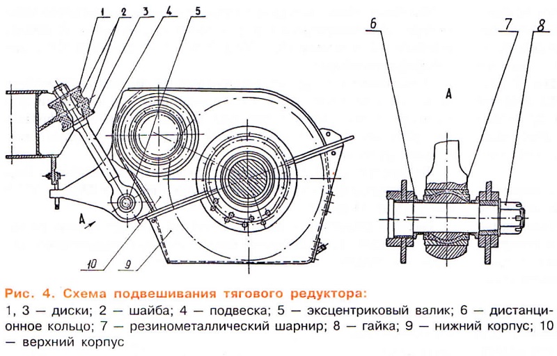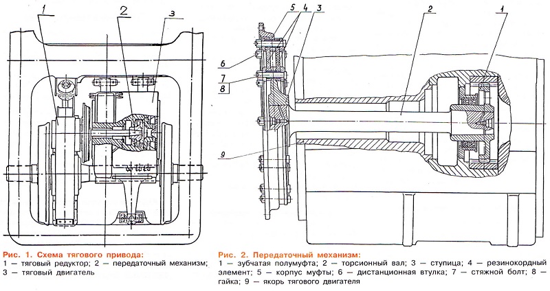 Тема: [09-1999] Магистральный электровоз ЭП1Магистральный электровоз ЭП1 ![]() 3. ТЯГОВЫЙ ПРИВОД (Продолжение. Начало см. “Локомотив” № 7, 8, 1999 г.) Электровоз ЭП1 разработан как пассажирский локомотив с конструкционной скоростью 140 км/ч. Он оборудован опорно-рамным подвешиванием тяговых двигателей, на нем выполнено двухступенчатое нажатие тормозных колодок на колеса, обеспечивающее его остановку на участке 1150 м при начальной скорости движения 140 км/ч. Тяговый двигатель полностью прикреплен к раме тележки, чем обеспечивается снижение на 2 т необрессоренных масс в вертикальной плоскости и 4 т — в горизонтальной. Это уменьшает воздействие колесных пар на путь. Кроме того, на локомотиве упразднены такие сложные в ремонте узлы, как моторно-осевые подшипники (МОП). Только потери смазки из этого узла на 6- осном электровозе составляют порядка 500 — 600 кг в год. Отказ от систематических перезаливок, механической обработки или шабровки баббитовой заливки подшипников дает заметный экономический эффект. Замена тягового привода исключила такие хронические болезни, как ослабление болтов крепления кожухов зубчатых передач к подшипниковым щитам двигателей и др. Выбору окончательного варианта конструкции тягового привода для ЭП1 предшествовал большой объем расчетно- выяснительных работ, изготовление и стендовые ресурсные испытания опытных редукторов и передаточных механизмов, создание и ходовые динамико-прочностные испытания тягового привода с опорно-рамным подвешиванием двигателей на электровозе ВЛ65 № 016. Расчеты и результаты проверок привода показали, что для машин с конструкционной скоростью до 160 км/ч он является лучшим по многим показателям. Жесткий корпус и крепление зубчатых колес и шестерен на двух подшипниках обеспечивают параллельность осей вращения и постоянство централи, что создает наилучшие условия работы зубчатой передачи. Распределение сил зубчатой передачи на два параллельно работающих подшипника обеспечивает увеличение их расчетной долговечности в 10 — 12 раз по сравнению с подшипником тягового привода III класса (как на машинах ЭП200). Жесткий корпус и надежные лабиринтовые уплотнения обеспечивают надежную сохранность, исключают загрязнение смазки, что также повышает срок службы зубчатых колес и подшипников. КОНСТРУКЦИЯ ТЯГОВОГО ПРИВОДА Тяговый привод (рис. 1) состоит из двух основных узлов: тягового редуктора 1 с колесной парой и передаточного механизма 2. Передаточный механизм (рис. 2) предназначен для передачи крутящего момента от двигателя на вал шестерни редуктора и компенсации относительных перемещений тягового двигателя и редуктора с колесной парой. ![]() В вертикальной плоскости это достигается за счет карданной податливости кордных дисков и углового проскальзывания сферических зубьев полумуфты по цилиндрическим зубьям зубчатого венца, а в горизонтальной плоскости — за счет осевой податливости резинокордных дисков в муфте. В случаях превышения сил трения между сферическими зубьями полумуфты относительно цилиндрических зубьев зубчатого венца, запрессованного во втулку якоря тягового двигателя, относительные перемещения компенсируются за счет проскальзывания полумуфты. Передаточный механизм включает в себя зубчатую полумуфту 1, торсионный вал 2 и резинокордную муфту. Зубчатая полумуфта имеет 46 сфе