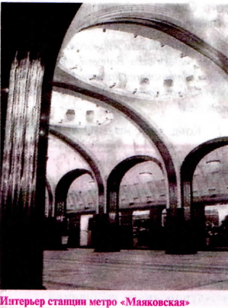 Талантливый архитектор впервые в практике метростроения на стан­ции глубокого заложения Маяков­ская вместо громоздких пилонов (массивных столбов — опор сводов) использовал колонны, что заметно увеличило площадь перронного зала. Для внешней отделки впервые был применен необычный в то время ма­териал — нержавеющая сталь. В оформлении станции принял участие известный художник А.А. Дейнека. Он создал прекрасные мозаичные карти­ны на тему “Сутки советского неба”, которые были размещены в куполах среднего зала.