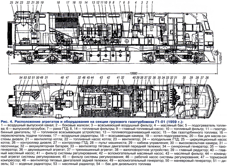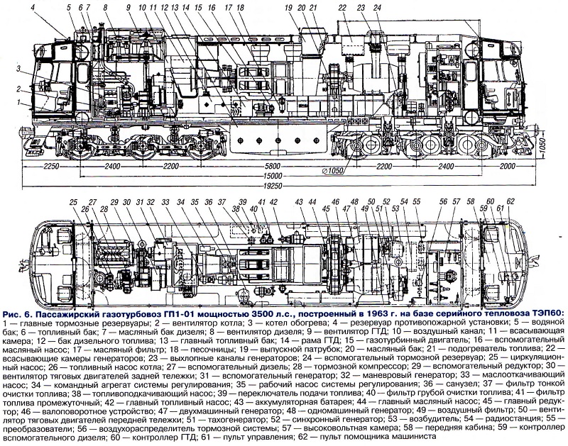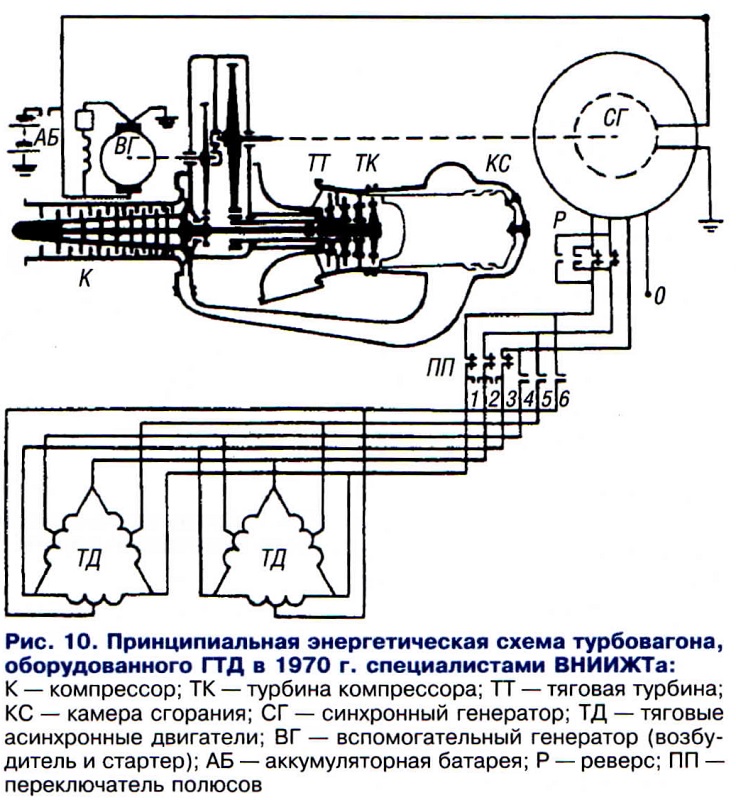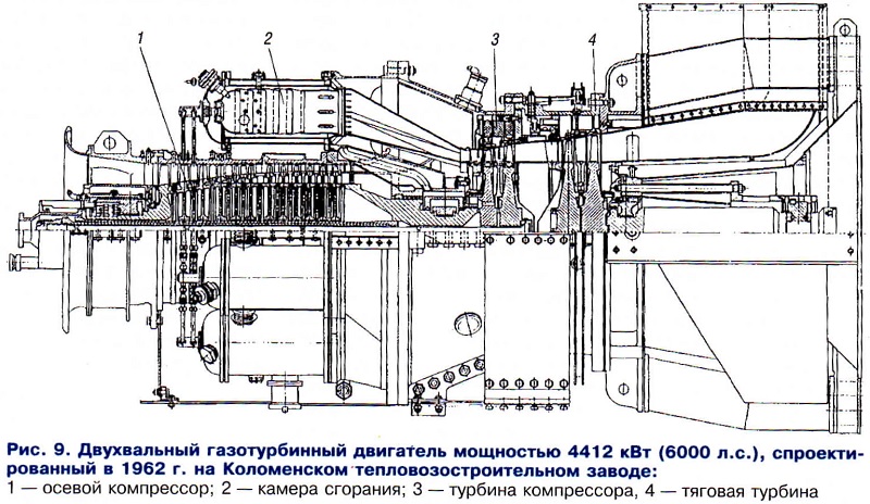Тема: [04-2005] Газотурбинная тяга: история и перспективыГазотурбинная тяга: история и перспективы (Продолжение. Начало см. «Локомотив» № 3, 2005 г.) В 1955 г. Коломенскому тепловозостроительному заводу имени В.В. Куйбышева было поручено спроектировать и построить первый отечественный двухсекционный грузовой газотурбовоз мощностью 5147 кВт (7000 л.с.) под обозначением Г1. В короткие сроки здесь организовали специальные конструкторские бюро по проектированию ГТД и газотурбовоза, штат которых образовали молодые специалисты, окончившие МВТУ имени Баумана, МЭИ, БИТМ, ХПИ и другие учебные вузы. Были также созданы производственные и экспериментальные участки и лаборатории, изготовлены испытательные стенды. В течение двух лет на заводе спроектировали и в 1957 г. построили первый ГТД. При этом коллектив завода тесно взаимодействовал с учеными и специалистами кафедры газовых турбин МВТУ имени Баумана, возглавляемой профессором В.В. Уваровым, института ЦИАМ, а также предприятий авиационной промышленности, которые занимаются разработкой газотурбинных двигателей. Ставилась задача изготовить простейшую и надежную силовую установку. Был выбран одновальный газотурбинный двигатель без регенерации тепла уходящих газов. За 1957 — 1958 гг. были построены и испытаны еще два опытных газотурбинных двигателя. Секцию первого грузового газотурбовоза изготовили в декабре 1959 г. На нее установили ГТД № 2. Расположение агрегатов и оборудования газотурбовоза показано на рис. 4. В средней части кузова на сварной раме смонтирован газотурбинный двигатель. Его осевой компрессор засасывает наружный воздух через боковые сетчатые фильтры всасывающей камеры. Отработавшие газы ГТД выбрасываются через выхлопной патрубок, в котором расположен подогреватель тяжелого топлива. Газотурбинный двигатель вращает главный редуктор, имеющий два ведомых вала. Редуктор, снижающий частоту вращения вала ГТД, — одноступенчатый. Передача к колесам — электрическая постоянного тока тепловозного типа. ![]() ![]() В начале января 1962 г. газотурбовоз Г1 прошел наладочный пробег 5 тыс. км, после которого начались эксплуатационные испытания в депо Кочетовка Юго-Восточной дороги с грузовыми поездами массой 2200 — 2800 т. К концу года его пробег с поездами превысил 20 тыс. км, а общий, с учетом испытаний, достиг 30 тыс. км. Испытатели отмечали хорошие эксплуатационные качества газотурбовоза, надежную его работу в летних и зимних условиях. Чтобы ускорить накопление опыта эксплуатации газотурбинных двигателей на железнодорожном транспорте, в 1963 г. было принято решение о постройке еще двух газотурбовозов ГП1 (рис. 6) на базе серийного тепловоза ТЭП60 с сохранением его габаритных размеров и без каких-либо изменений тележек. Более короткая база тепловоза потребовала заменить электрический привод вспомогательных агрегатов на механический от постоянно работающего вспомогательного дизеля мощностью 294 кВт (400 л.с.). Однако впоследствии выявились отрицательные стороны такого решения. ![]() Построенные в 1964 г. пассажирские газотурбовозы ГП1- 001 и ГП1-002 после доводочных испытаний вместе с грузовым Г1 были направлены в депо Льгов Московской дороги для опытной эксплуатации на различных тяговых участках (рис. 7). Испытания газотурбовоза Г1-01 в 1962 — 1965 гг. показали его надежную работу, в том числе газотурбинного двигате