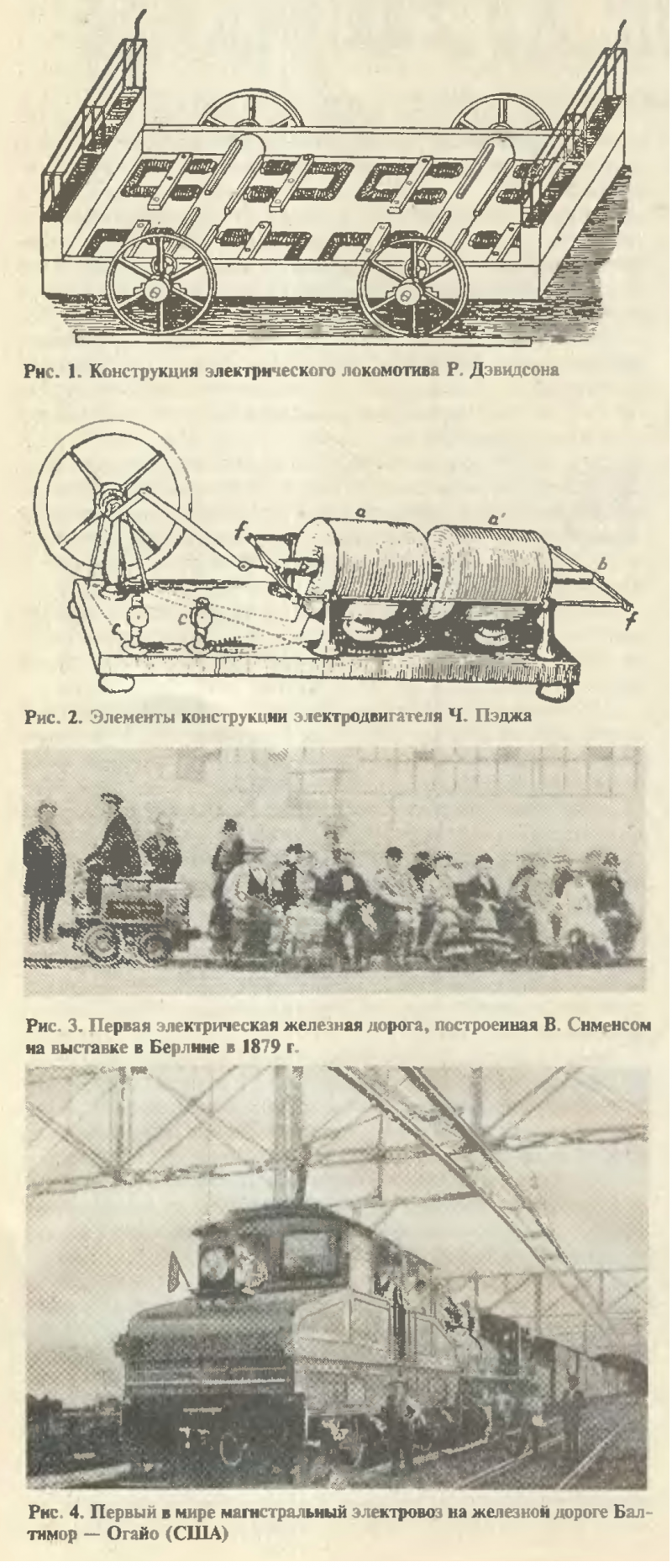 Тема: [02-1995] Первые электровозыПервые электровозы К 100-летию первого магистрального электрического локомотива Электричество для транспортных целей впервые применил российский профессор Б. С. Якоби Небольшой катер, оборудованный электродвигателем его конструкции, 13 сентября 1838 г. проплыл с двенадцатью пассажирами по Неве в Петербурге Воодушевленные этим экспериментом, ученые и изобретатели разных стран стали разрабатывать конструкции электродвигателей и пытаться применить их для целей тяги. К числу таких работ относится электродвигатель голландцев Беккера и Стратинга, модель которого они пытались использовать для приведения в движение повозки. Американец Т. Дэвенпорт, а затем и англичанин У. Кларк построили модели «электромагнитных локомотивов» весом до 30 кг. Обе модели демонстрировались на международных выставках, но были нс более, чем игрушками. Первую попытку применить в большом масштабе электрическую тягу на железнодорожном транспорте де-1 ласт англичанин Р. Дэвидсон. В сентябре 1842 г. на I линии Глазго - Эдинбург прошли испытания созданного им «электромагнитного локомотива-повозки», по существу электровоза с автономным питанием. Двухосный локомотив длиной около 5 м и шириной 2 м весил вместе с питающими гальваническими батареями 6 т При испытаниях он передвигался со скоростью около 4 миль в час. На каждой из двух осей локомотива (рис. 1) были смонтированы деревянные цилиндры с закрепленными на них через 120° железными полосами. С каждой стороны цилиндров располагались электромагниты. Их обмотки питались от четырех батарей, состоявших из 40 железных и цинковых пластин, погруженных в разбавленную серную кислоту Батареи размешались в деревянных ящиках на краях кузова локомотива. С помощью специальных коммутаторов в виде небольших деревянных цилиндров с расположенными на них медными сегментами достигались включение и отключение тока в обмотках электромагнитов. При протекании тока по их обмоткам обеспечивалось притяжение соответствующих железных полос, вращательное движение цилиндров и осей электровоза. В ходе первых испытаний притяжение железных полос с электромагнитами было настолько сильным, что они смешались относительно мест их фиксации на цилиндрах. Пришлось закрепить полосы прочнее, увеличить зазор между ними и концами электромагнитов, что привело к значительной потере мощности. Испытания первого электровоза закончились печально. Он был разбит разъяренной толпой, очевидно, последователей луддитов — «разрушителей машин». 1851 г. американец Ч. Пэдж построил локомотив и провел его испытания на участке железной дороги I между Вашингтоном и Бладенсбургом. Локомотив был оборудован электродвигателем его конструкции, работающим на принципе возвратно-поступательного движения, т е. он был электромагнитным аналогом паровой машины. Функции паровых цилиндров выполняли две катушки (макет их изображен на рис 2), оба сердечника которых с помощью шатунного механизма были механически соединены с колесами локомотива. Специальный прерыватель обеспечивал изменение направления тока в катушках и возвратно-поступательное перемещение их сердечников. При испытаниях локомотив с гальванической батареей из 100 элементов достигал скорости 30 км/ч. Однако эта и последующие попытки изобретателей 60-х годов прошлого века не д