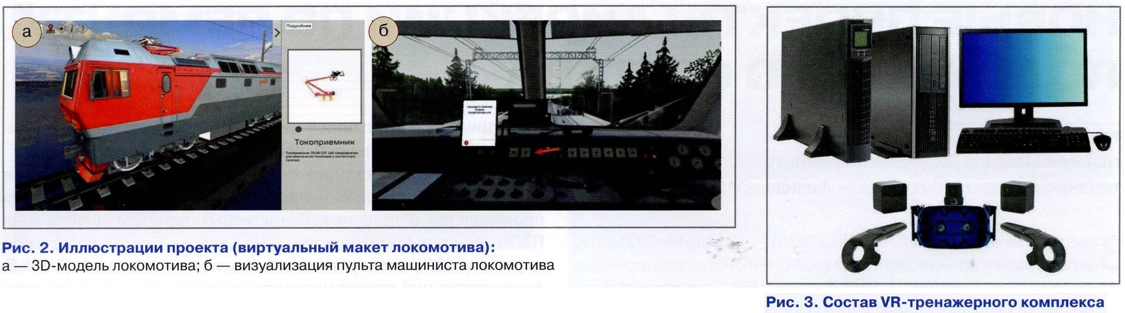 ![]() Использование VR- и AR-технологий позволяет проводить обучение без риска для здоровья и жизни человека, а также без риска нанесения ущерба оборудованию и технике. В разработке программ обучения важную роль занимает использование технологии виртуального тура по локомотиву (рис. 2). Инновационность разработки заключается в следующем. Во-первых, трекинг тела человека и обратная тактильная связь достигаются посредством использования костюмов и перчаток виртуальной реальности, физических имитаторов инструмента и позволяют: формировать достоверные моторные навыки путем использования физических имитаторов оборудования; повышать качество обучения путем обеспечения обратной тактильной связи по площади тела человека (электростимуляция мышц); Ч- обеспечивать использование в виртуальных тренажерах мелкой моторики для взаимодействия с инструментом с точностью до пальца; а.> проводить анализ движений пользователя для последующей оптимизации технологических процессов. Во-вторых, в системе планируется использование инновационной российской системы оценки психофизиологического состояния обучаемого в виртуальных тренажерах, построенной на окулографическом анализе направления взгляда и микродвижений глаз (саккад) во время выполнения практического теста с включением в ход теста псевдослучайных отклонений в технологическом процессе. В состав тренажера входит рабочее место локомотивной бригады в виртуальной реальности, включающее в свой состав следующие системы:
