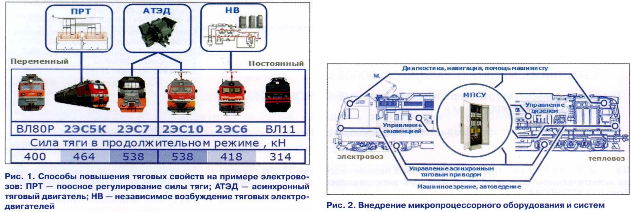Тема: [01-2022] Новые технологии в тяговом подвижном составе. Микропроцессорная трансформацияНовые технологии в тяговом подвижном составе. Микропроцессорная трансформация Н.И. КОРАБЕЛЬНИКОВ, главный конструктор проекта, В.А. ЕРЦЕВ, ведущий инженер, Н.М. КОРНЕЕВ, инженер I категории, Проектно-конструкторское бюро локомотивного хозяйства — филиал ОАО «РЖД» Транспортная стратегия Российской Федерации на период до 2030 года ставит перед ОАО «РЖД» цели по обеспечению потребного объема транспортных услуг как для грузовладельцев, так и для пассажиров. При этом обязательным условием является повышение эффективности, экологичности и безопасности перевозочного процесса. Одним из инструментов решения поставленных задач является внедрение инновационных разработок и современных технических предложений в области железнодорожного машиностроения, в том числе повсеместное применение микропроцессорной электроники. Рассмотрим несколько примеров. Одним из недостатков коллекторного тягового привода является разносное боксование, возникающее в случае ухудшения условий сцепления поверхности катания колеса с рельсом. Впоследствии это приводит к снижению реализуемой касательной силы тяги локомотива и возможному нарушению графика движения поездов. С конца 2018 г. в ОАО «РЖД» поставляются электровозы серии ЗЭС5К «Ермак» с модифицированной системой управления МСУД-015, управляющей системами поосного регулирования силы тяги (ПРТ) и независимого возбуждения тяговых электродвигателей (ТЭД). В совокупности данные системы позволяют значительно снизить вероятность возникновения боксования, а равно и юза, и в более широком диапазоне скоростей использовать максимально возможную силу тяги электровоза (рис. 1). Проведенные тягово-энергетические и эксплуатационные испытания модифицированных электровозов серии ЗЭС5К подтвердили возможность вождения грузовых поездов массой 7100 т на участках Восточного полигона. Аналогичные принципы регулирования моментов ТЭД использованы в грузовых электровозах постоянного тока 2ЭС6 «Синара». Реализация независимого возбуждения коллекторных ТЭД путем использования в конструкции данных электровозов современных микропроцессорных систем и преобразователей собственных нужд позволила повысить основные тягово-энергетические параметры новых локомотивов в среднем на 20 — 25 % по сравнению с ранее выпускавшимися электровозами ВЛ11. ![]() Использование электронных компонентов для производства комплектующего оборудования локомотивов также значительно повысило эффективность их использования. Сложность регулирования частоты вращения асинхронных электрических двигателей являлась основным сдерживающим фактором повсеместного использования данных машин в конструкции тягового подвижного состава. Развитие микропроцессорной техники, а также силовой электроники позволило использовать их не только в качестве привода вспомогательного оборудования. Характерным примером являются отечественные электровозы ЭП20, 2ЭС10, 2ЭС7, а также тепловозы 2ТЭ25А, в конструкции которых применены асинхронные тяговые электродвигатели. В качестве силовой установки на большинстве поставляемых в ОАО «РЖД» отечественных тепловозах используются дизельные двигатели внутреннего сгорания. Для поддержания в автоматическом режиме част