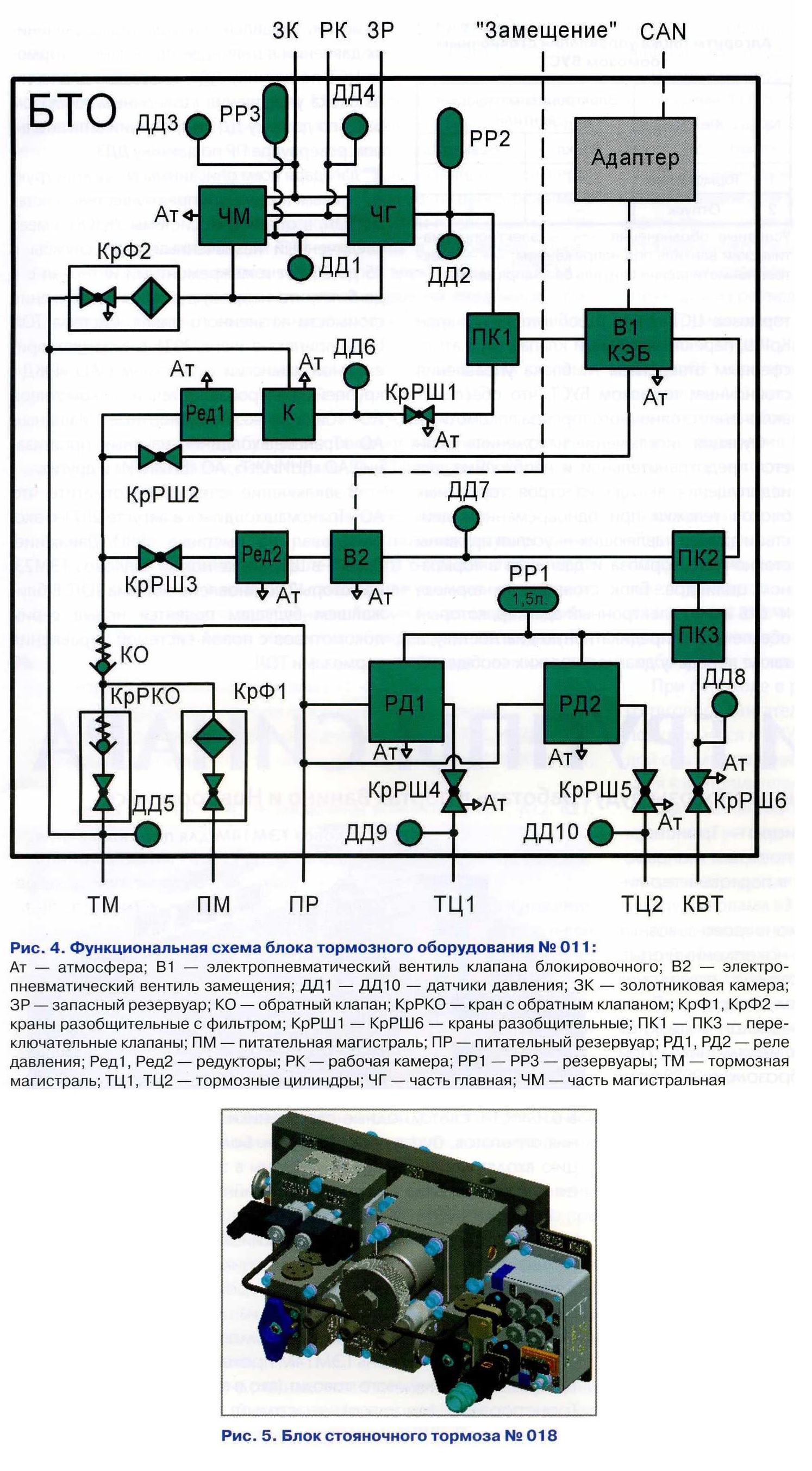 Функциональная схема блока тормозного оборудования 011 (рис. 4) приближена к блоку компоновочному тормозного оборудования № 010-3. Тем не менее, она имеет ряд отличительных схемных и конструктивных преимуществ, таких как: