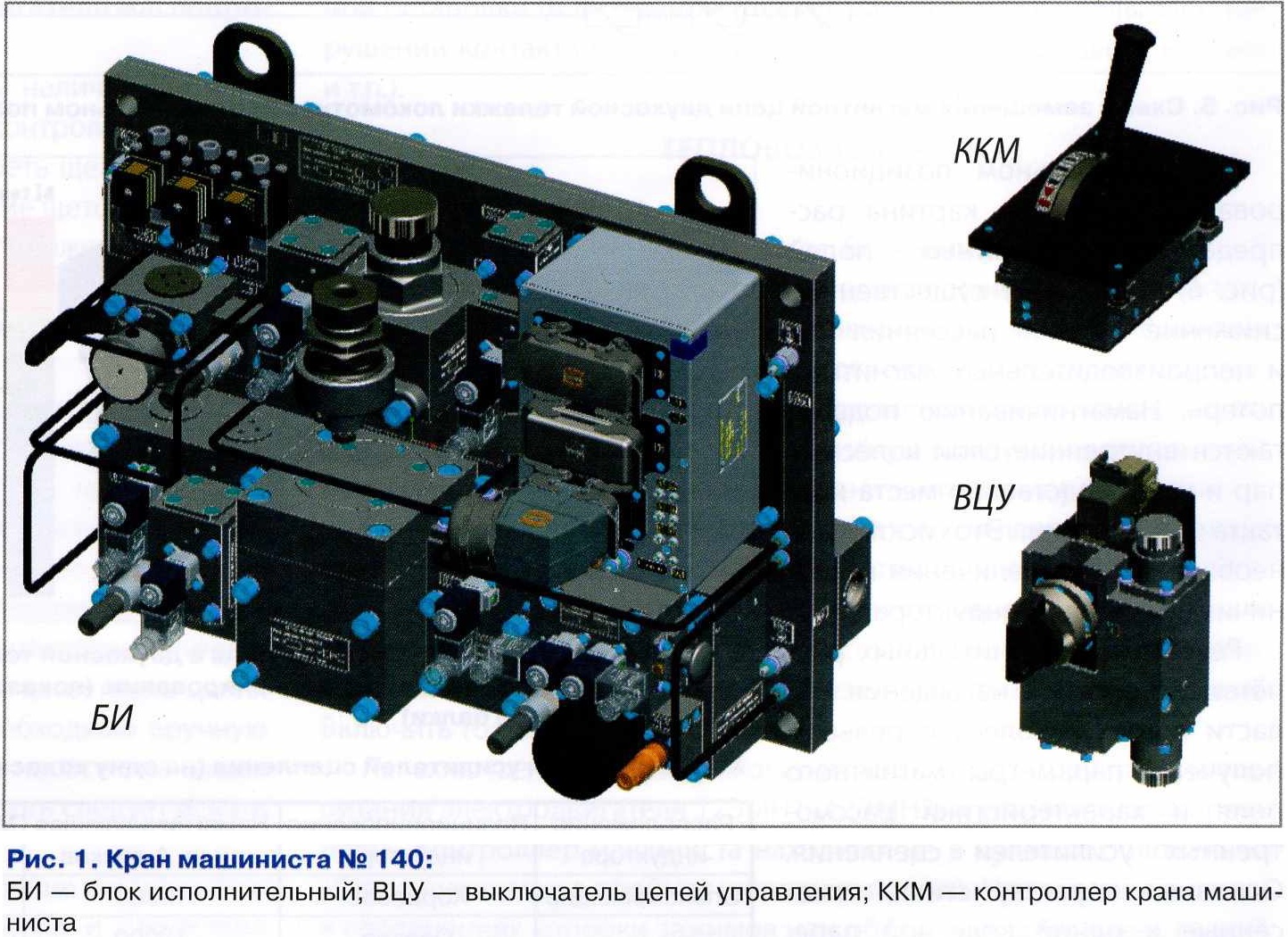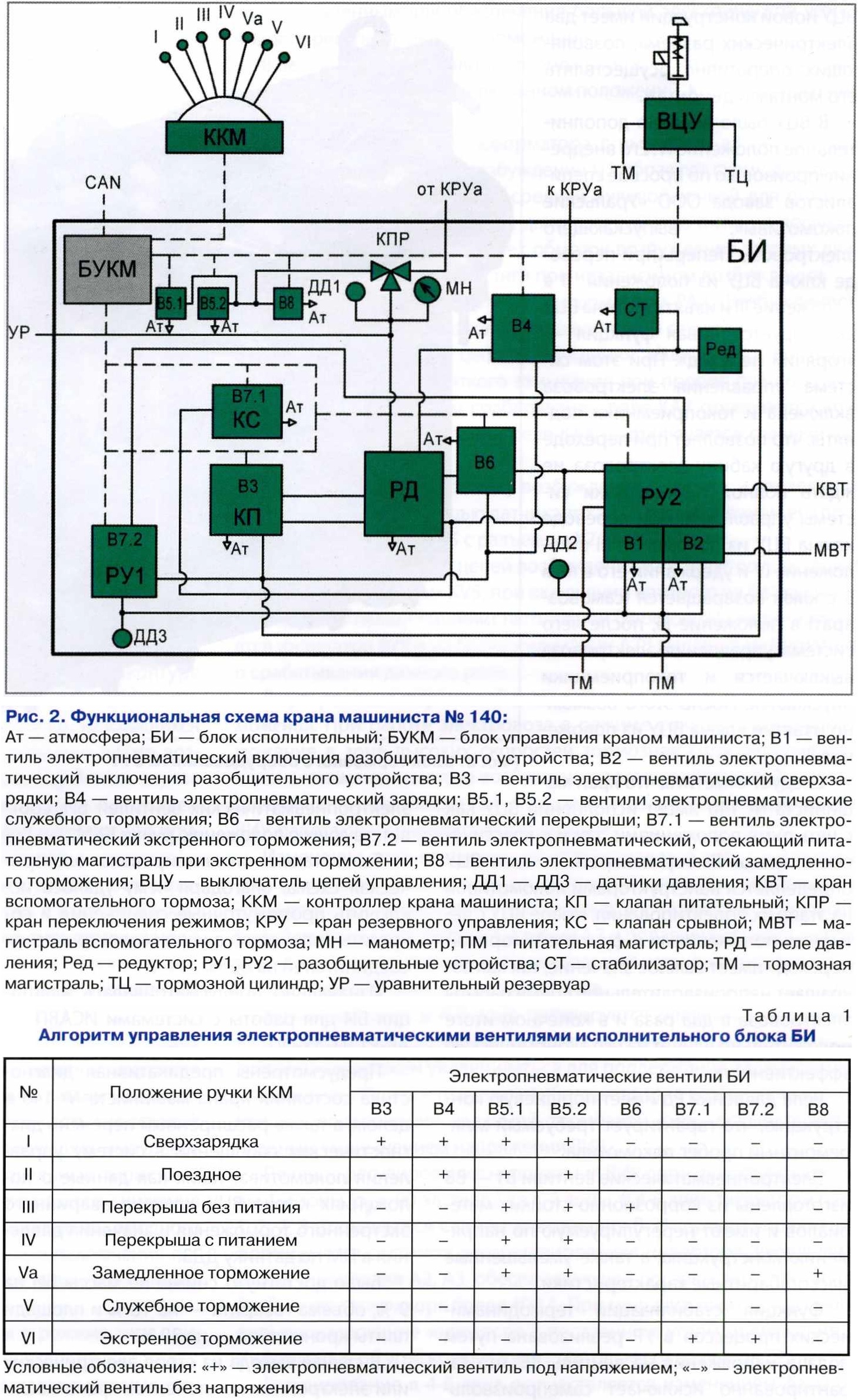 ККМ соединен электрической связью с электронным блоком управления крана машиниста (БУКМ), установленном на БИ, который в зависимости от положения ручки ККМ передает электрический сигнал на включение (отключение) электропневматических вентилей БИ в соответствии с заданным алгоритмом управления. Алгоритм управления электропневматическими вентилями БИ приведен в табл. 1. Следует отметить, что алгоритм, представленный в табл. 1, отличается от алгоритма крана машиниста № 130-2 в части новой реализации служебного и экстренного торможений из-за наличия электропневматических вентилей В5.1, В5.2, В7.1 и В7.2, а также отсутствия электропнев-матического вентиля В9 (об этом будет рассказано далее). Концепция компоновочного решения БИ крана машиниста № 140, так же как и БТО № 011 и БСТ № 018, является классической для МТЗ ТРАНСМАШ и представляет собой несущую кронштейн-плиту с выполненными в ней пневматическими каналами, на которую установлены пневматические и электропневматические приборы. При создании БИ крана машиниста № 140 специалистами конструкторского бюро был проведен тщательный анализ надежности и работоспособности крана машиниста № 130-2, полученного из эксплуатации, а также максимально учтены пожелания заказчиков, на основании которых была разработана абсолютно новая исполнительная часть крана машиниста № 140. ![]() Функциональная схема крана машиниста № 140 (рис. 2) приближена к крану машиниста № 130-2, поэтому подробно здесь она рассматриваться не будет. Тем не менее, она имеет ряд серьезных отличительных схемных и конструктивных преимуществ. Остановимся на них подробнее. В схеме реализовано служебное торможение путем применения двух электропневматических вентилей В5.1 и В5.2. Данные вентили имеют параллельное электрическое соединение и в случае выхода из строя механической части одного из вентилей второй обеспечит безопасный темп служебного торможения. Были внедрены новый алгоритм включения электропневматических вентилей при экстренном торможении (см. табл. 1), когда напряжение подается на вентили В7.1 и В7.2, а также новое схемное решение устройства блокировки тормозов, реализованное в виде двух разобщительных устройств РУ1 и РУ2. Благодаря такому алгоритму и пневматической схеме при экстренном торможении будет исключено падение давления воздуха в питательной магистрали (ПМ) локомотива за счет подачи напряжения на вентиль В7.2 и блокирования подачи давления воздуха к питательному клапану (реле давления). Применена новая конструкция выключателя цепей управления (ВЦУ), позволяющая исключить электрическую логику разблокирования ключа ВЦУ при смене кабин локомотива за счет пневматической. Данное решение позволило исключить из логики разблокирования ключа ВЦУ два сигнализатора давления, устанавливаемых на ТМ и магистрали вспомогательного тормоза, а также электропневматический вентиль В9, устанавливаемый на исполнительной части крана машиниста № 130-2. Пневматическое управление разблокирования ключа ВЦУ реализуется благодаря логическому элементу И, интегрированному в корпус ВЦУ. При таком решении алгоритм разблокирования ключа ВЦУ остался прежним, т.е. для того, чтобы провернуть ключ ВЦУ из положения II в положение III, необходимо снизить давление воздуха в ТМ ниже 0,1 МПа и наполнить тормозные цилиндры (ТЦ) давлением выше 0,3 МПа, о