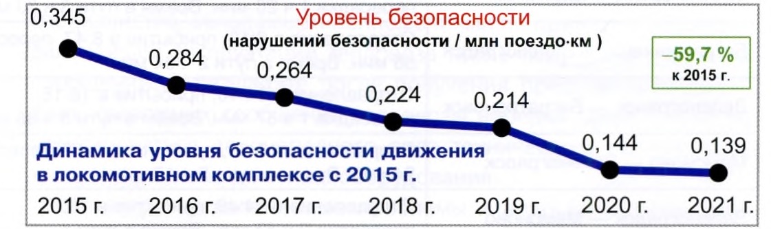 Тема: [03-2022] Повышать уровень безопасности движения!Повышать уровень безопасности движения! Мероприятия, реализованные в локомотивном комплексе в 2021 г. С.М.ПАРНЮК, заместитель начальника Службы безопасности движения Дирекции тяги — филиала ОАО «РЖД» Показатель «Уровень безопасности движения» (удельное количество событий на 1 млн поездо-км), установленный правлением ОАО «РЖД» для Дирекции тяги — филиала ОАО «РЖД» и сервисных организаций по итогам работы за 2021 г., не только выполнен, но и снижен на 3 % к целевому показателю. При этом данный показатель по итогам 2021 г. стал минимальным за последние б лет (см. рисунок), а снижение к уровню 2015 г. составило 59,7 %. Для достижения целей в области безопасности движения сформированы меры, сгруппированные по шести стратегическим направлениям: