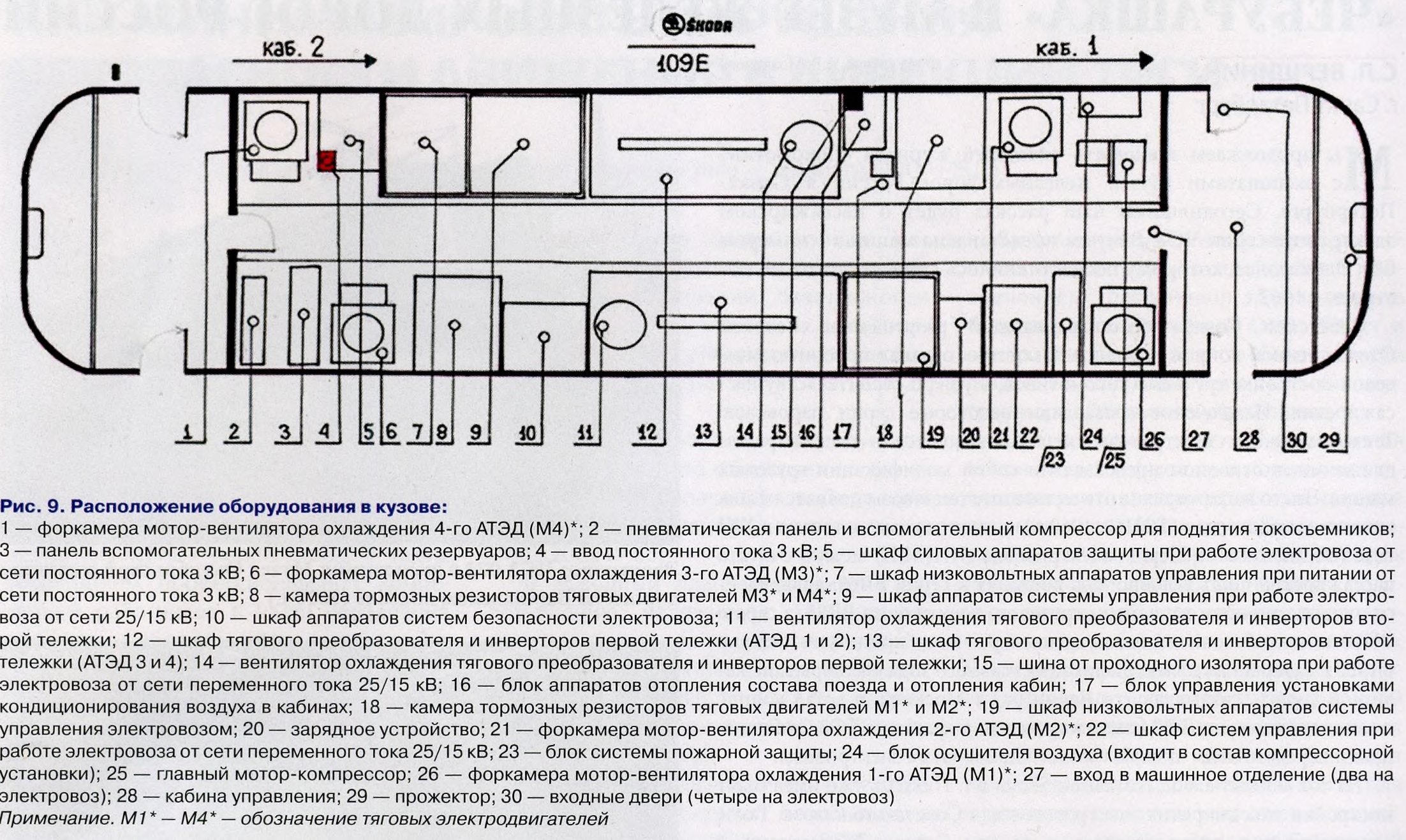 Тема: [06-2022] Электровоз 109Е — последний серийный электровоз легендарного завода «ШКОДА»Электровоз 109Е — последний серийный электровоз легендарного завода «ШКОДА» Д.М. УМАНЕЦ, инженер, г. Харьков Одной из последних разработок компании Skoda Transportation («Шкода. Транспортные средства») на ниве электровозостроения стал четырехосный многосистемный электровоз, получивший заводское обозначение серии 109Е (рис. 1), а на Чешских железных дорогах, являвшихся основным заказчиком, серию 380. Электровоз представляет собой грузопассажирский, четырехосный, двухтележечный локомотив с кузовом вагонной компоновки. В связи с тем, что эксплуатировать электровоз предполагалось в транспортных коридорах ряда стран Европы (Чехии, Словакии, Германии, Австрии, Польши и Венгрии), система питания электровоза выполнена под разные стандарты — 25 кВ/50 Гц, 15 кВ/16,7 Гц переменного тока и 3 кВ постоянного тока. Технические характеристики электровоза приведены в таблице. ![]() Проектирование локомотива осуществлялось с учетом специфических особенностей железнодорожной инфраструктуры Центральной Европы. Это преобладание линий со сложным рельефом и, как следствие, необходимость использования электродинамического торможения при всех системах питания, а также хорошие динамические характеристики при эксплуатации на участках пути с преобладанием кривых малого радиуса. ![]() Впервые электровоз был представлен публике на заводской презентации 24 июля 2008 г., а в сентябре того же года электровоз был показан на международной выставке InnoTrans в Берлине. После прохождения полного цикла испытаний на полигоне в г. Велим в декабре 2009 г. началась регулярная эксплуатация электровозов с пассажирскими поездами на направлении Берлин — Прага — Вена. Электровоз спроектирован с учетом всех требований к современным локомотивам. Он имеет асинхронный тяговый привод (тяговые двигатели ML 4550К/6), управляемый IGBT-модулями. Компоновка электровоза выполнена с учетом обеспечения центрального прохода по локомотиву. ![]() На электровозе применена единая европейская система безопасности ETCS, которая собирает информацию о состоянии пути и контролирует сигналы рельсовых цепей. Примененное на электровозе специальное оборудование полностью удовлетворяет строгие европейские нормы по противопожарной безопасности. Кузов электровоза (рис. 2) имеет на обоих своих концах кабины управления, закрепленные на несущих балках главной рамы сваркой. Дизайн кабин разработан инженерами «Шкода» в содружестве с компанией Porshe Design. Кабины так называемого «модульного типа» связаны с газовыми деформационными элементами двумя лучеобразными балками, являющимися одними из главных узлов системы безопасности при лобовом столкновении. Обшивка кабины выполнена из низколегированной стали толщиной 2 мм. Кабины оснащены кондиционерами мощностью 5 кВт типа СМС-20, виброгасящим креслом машиниста, удобным, эргономичным пультом (рис. 3). В электровозе установлены бытовой холодильник, СВЧ-печь и умывальник. Лобовое стекло толщиной 19 мм имеет электрический обогрев, вклеено на специальный герметик и устойчиво к разрушению при попадании на скорости 200 км/ч предмета весом 280 г. Лобовые стекла кабины имеют стеклоочистители с электрическим приводом и снабжены стеклоомывателем. В нижней части кабины к главной раме на кронштейнах кре